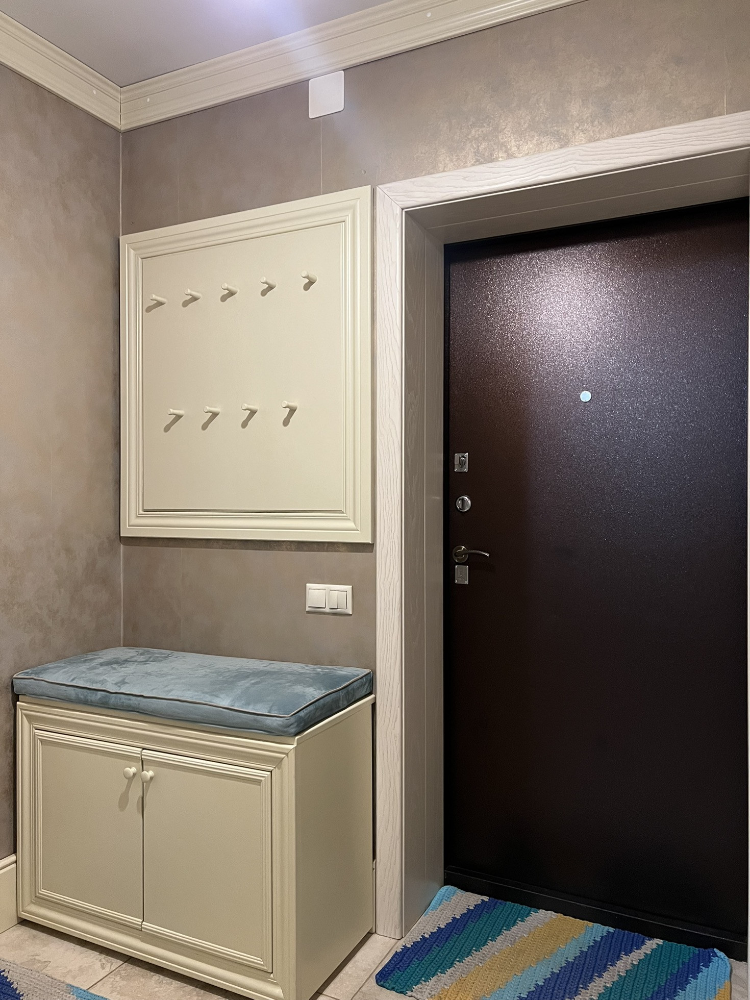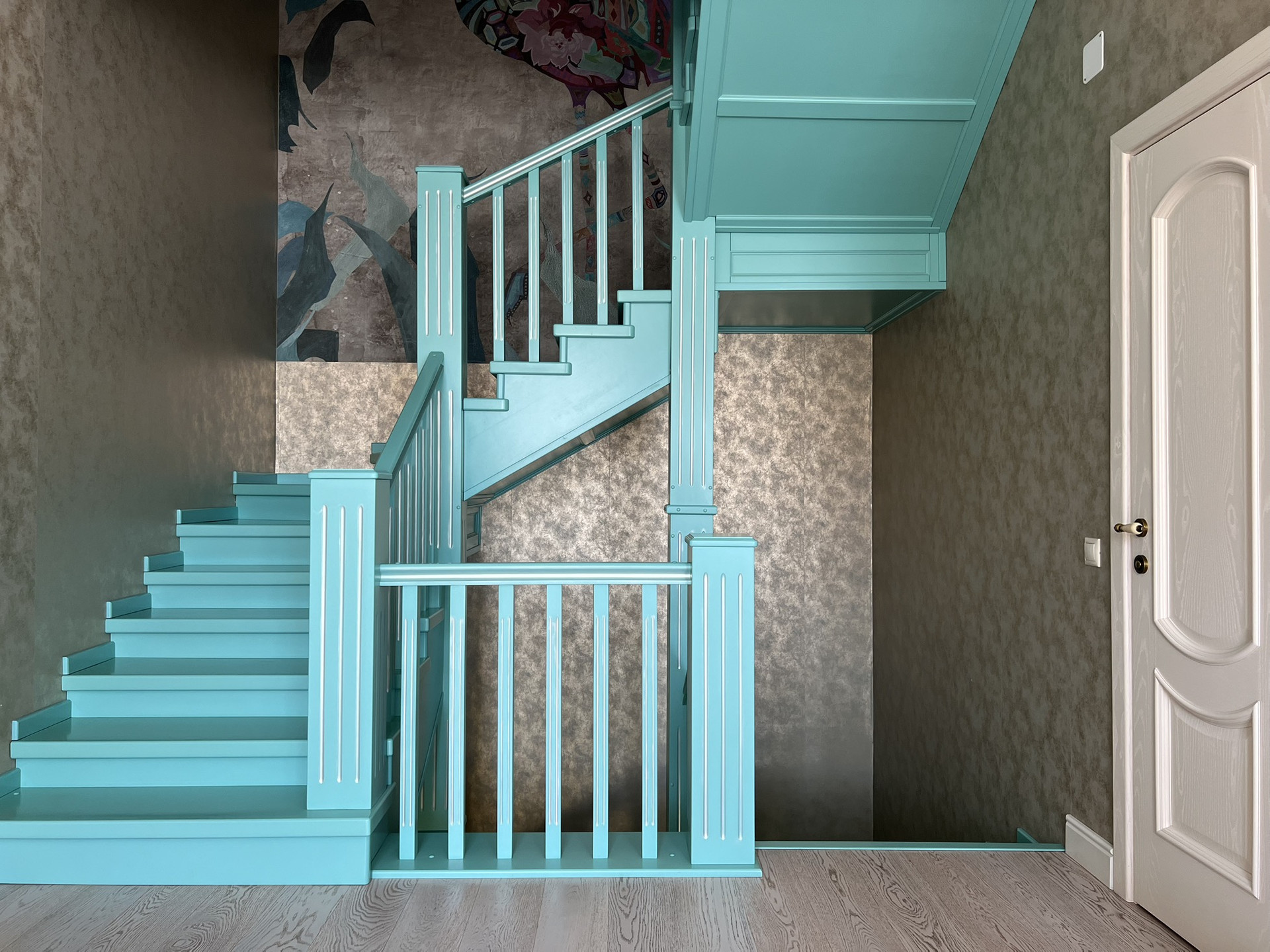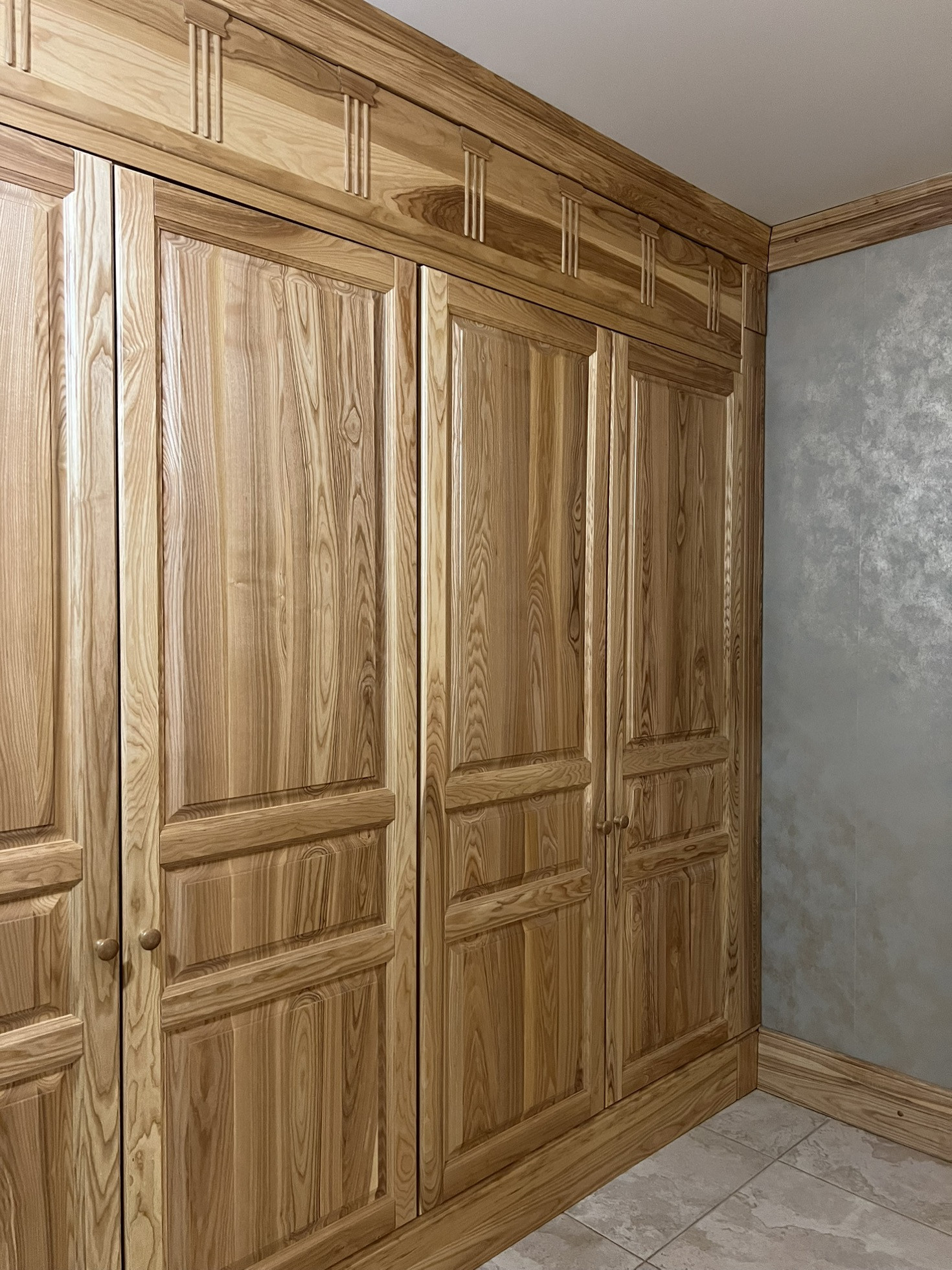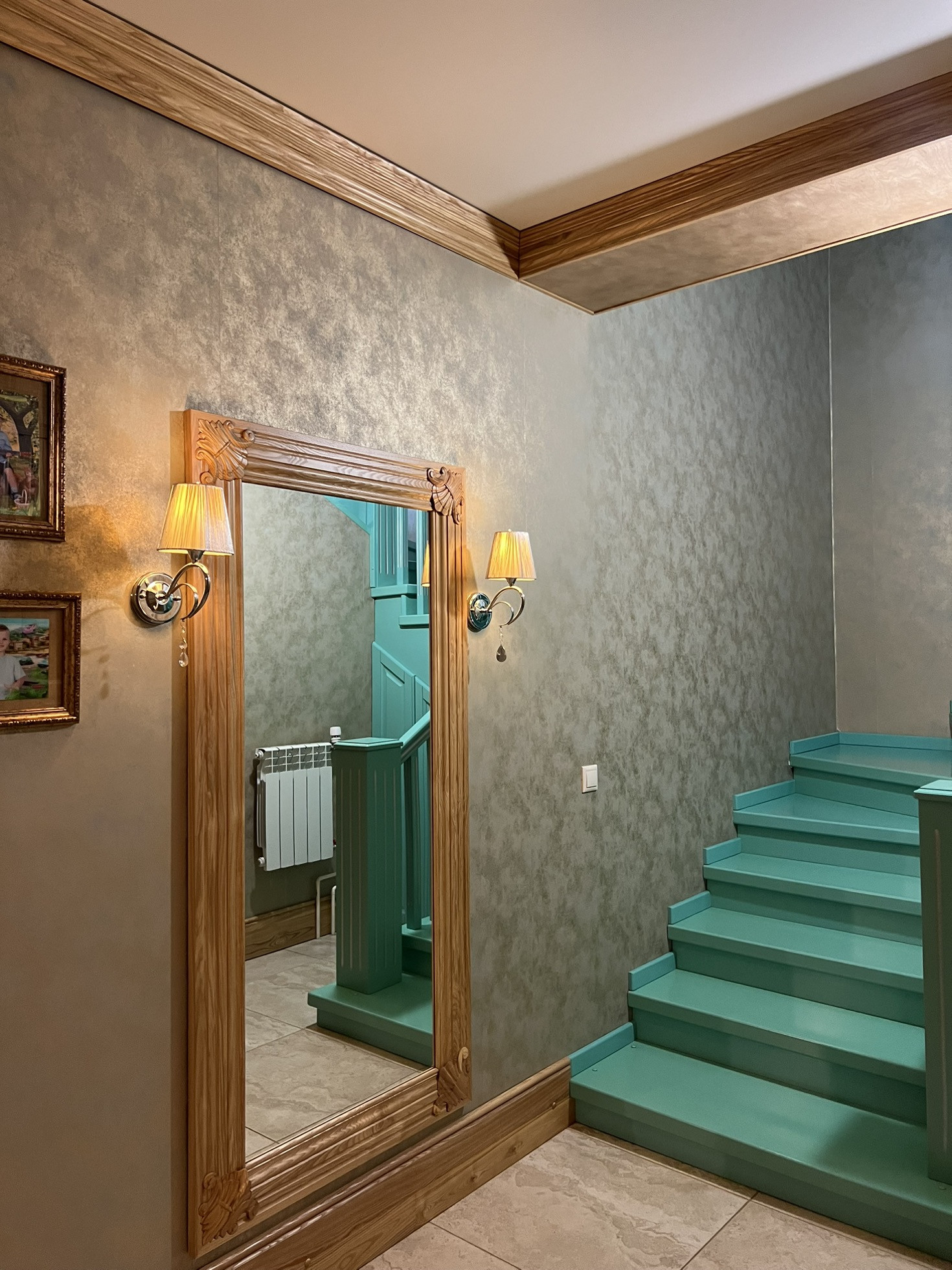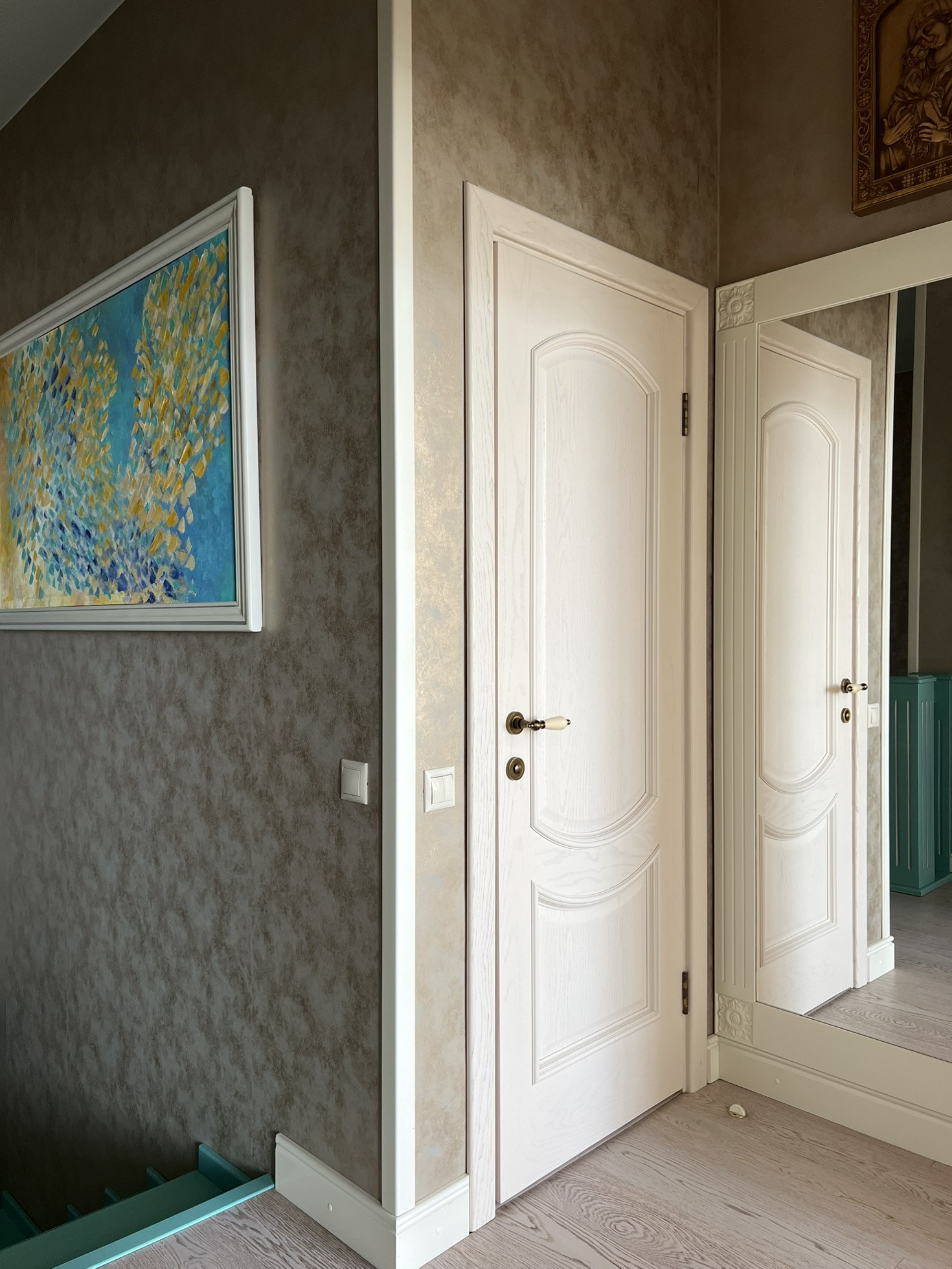 На первом этаже прихожая, просторный коридор с встроенным вместительным шкафом из массива ясеня. Также из прихожей имеется прямой доступ в гараж. Лестница - массив березы.