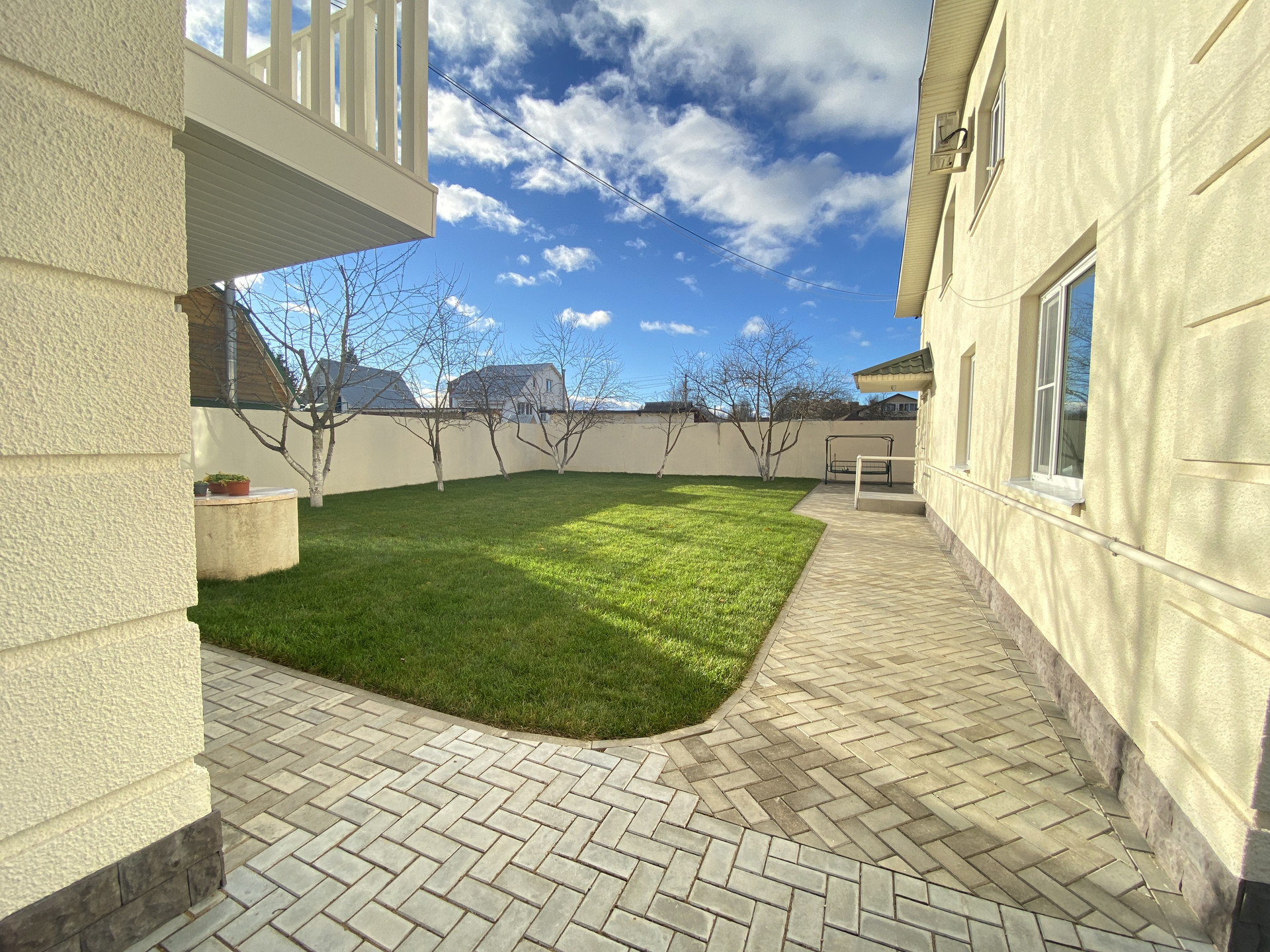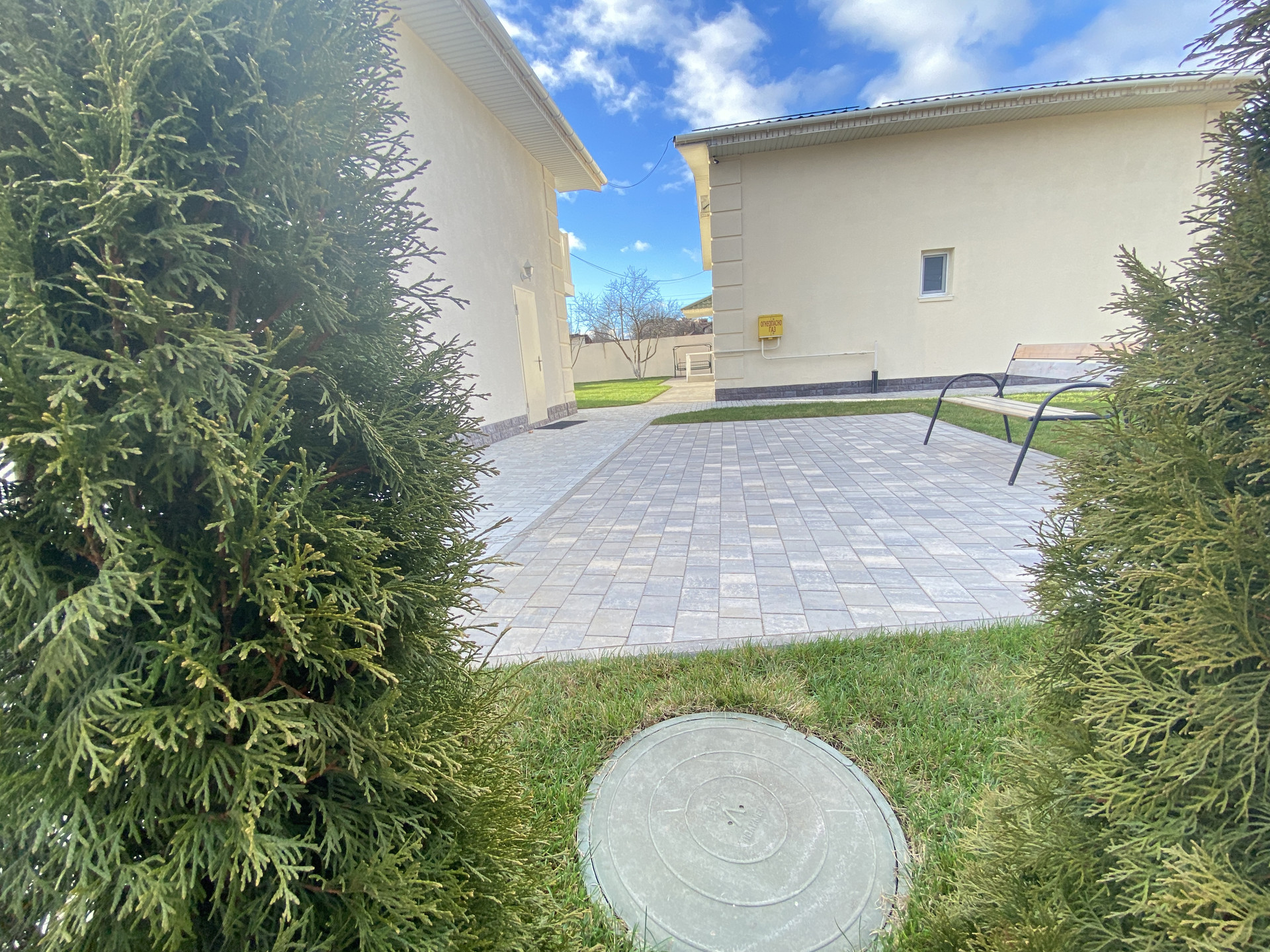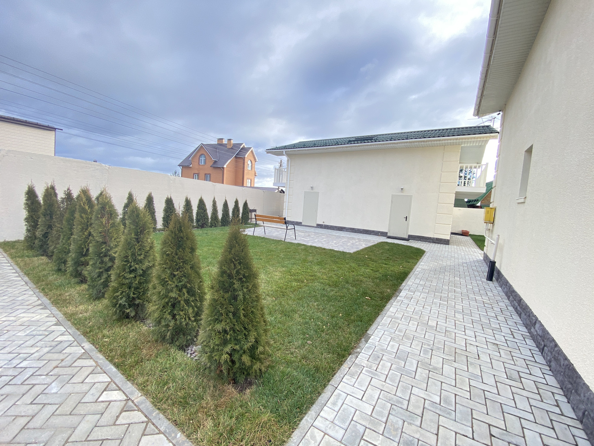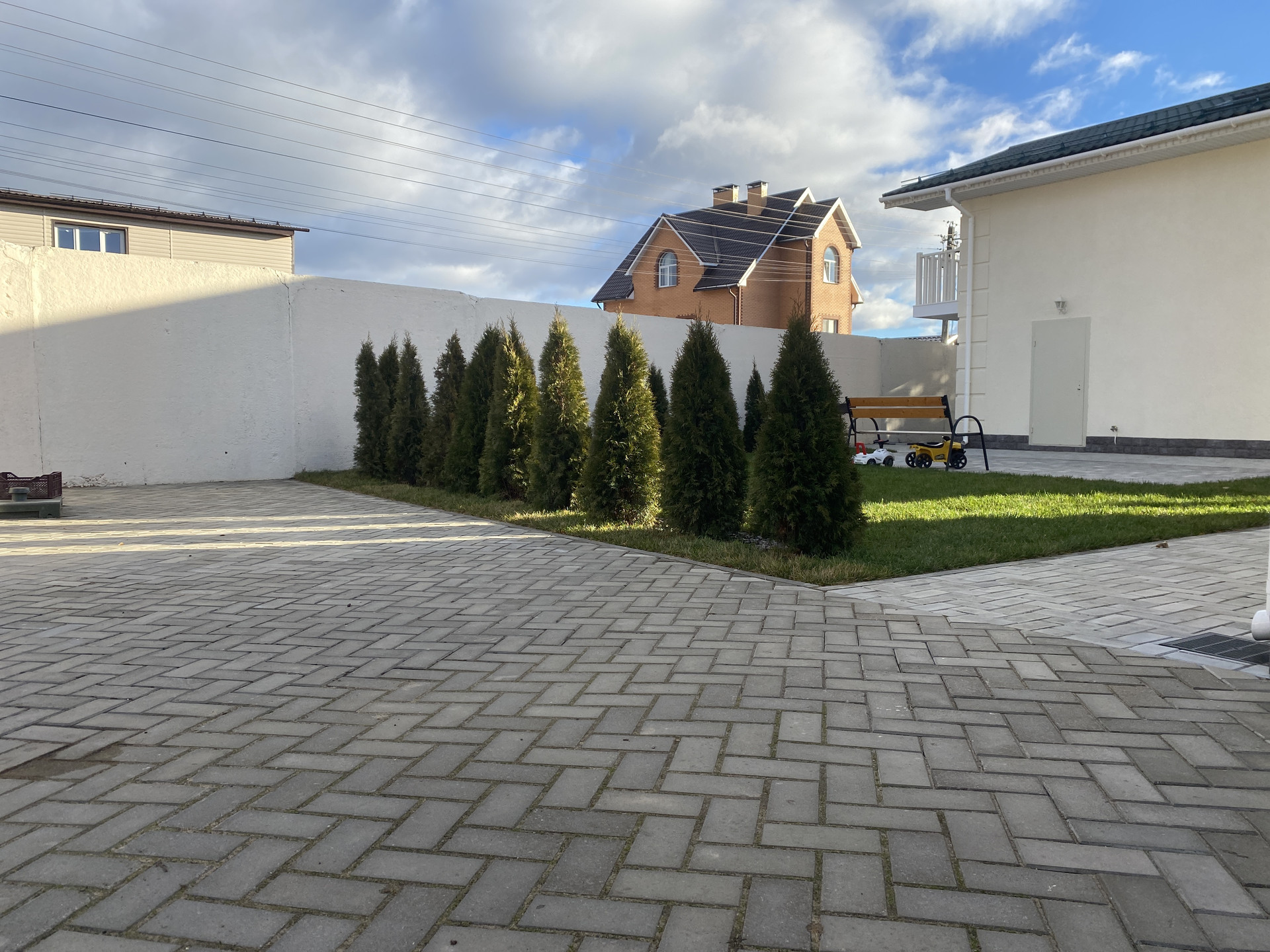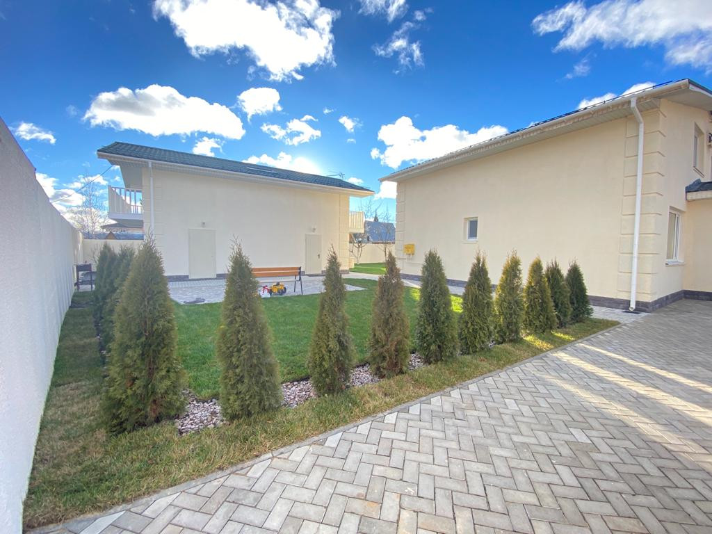 Участок 9 сот., газон, туи, площадка вмещает 12  машин.  На участке  плодовоягодные насаждения : черешня, груша, яблони и слива. Видеонаблюдение .