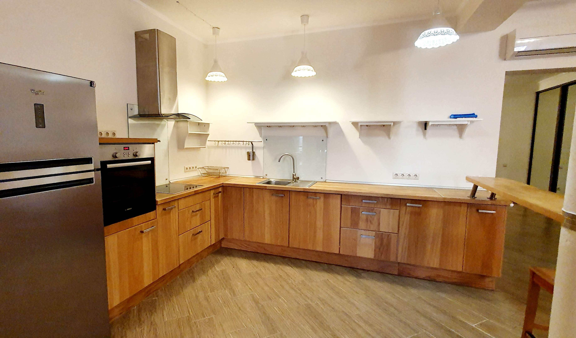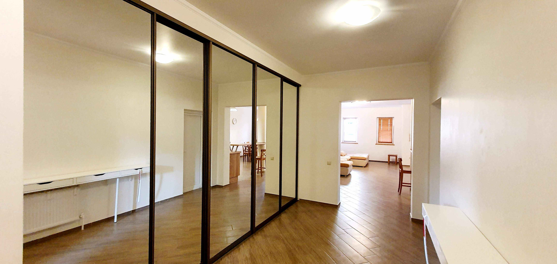 1 эт - прихожая с большим шкафом купе, выход в гараж, котельная, большая кухня-гостиная-столовая 54 квм с выходом на участок, второй холл-гостиная, комната, санузел, гардеробная, постирочная, второй гараж.