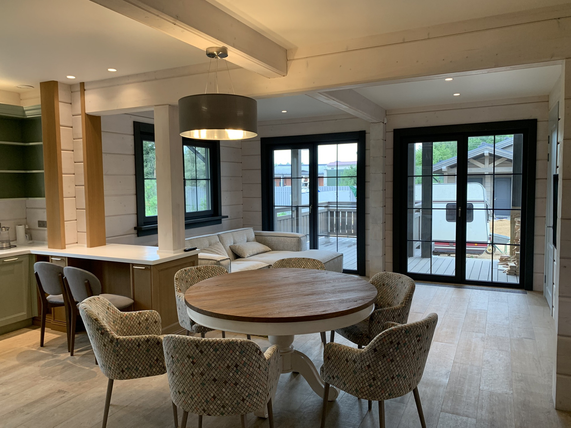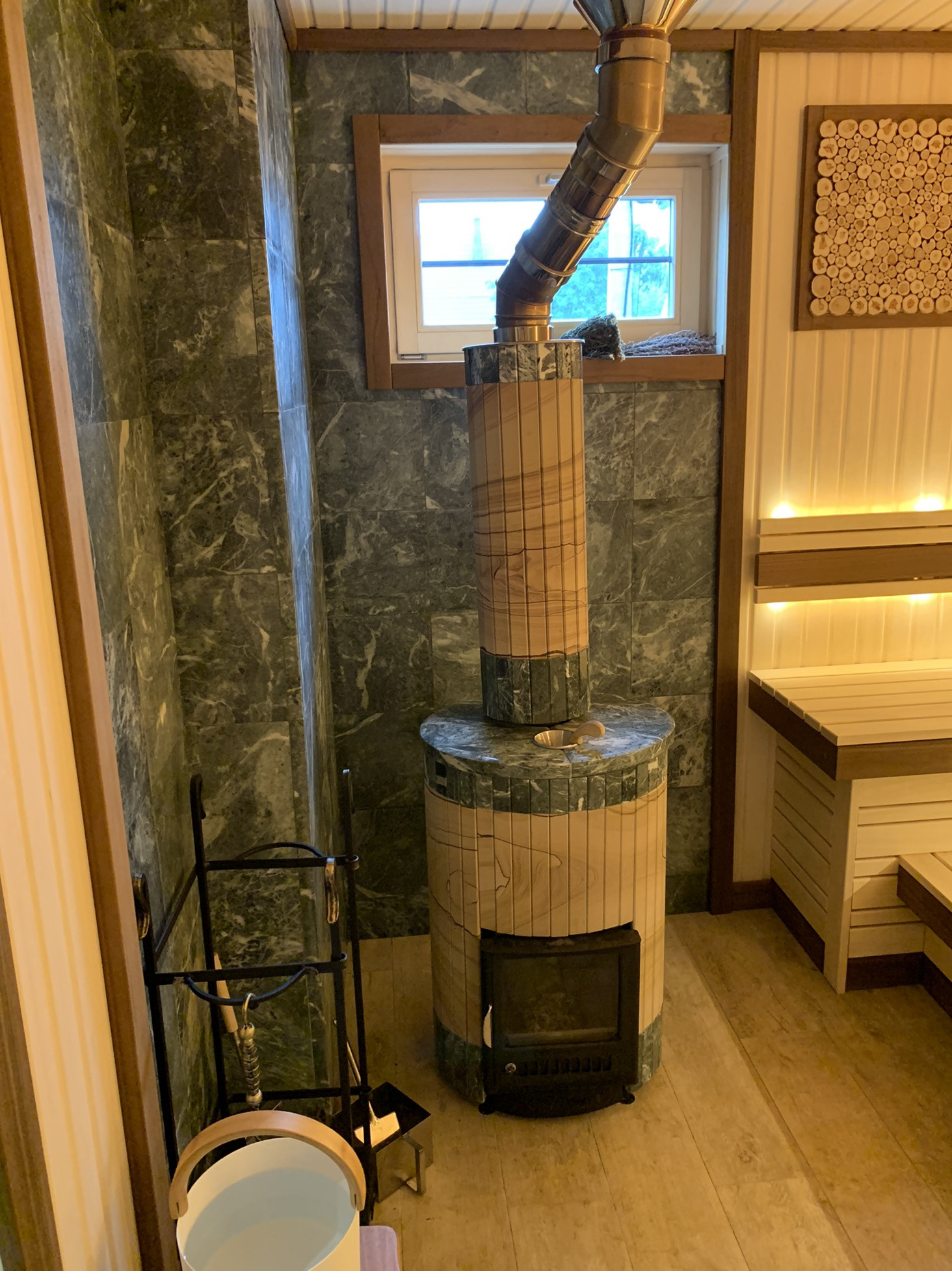 1 этаж: котельная, спальня, большая кухня с гостиной, баня на дровах с выходом на террасу с душевыми и раздевалкой, с/у, веранда. Везде теплые полы