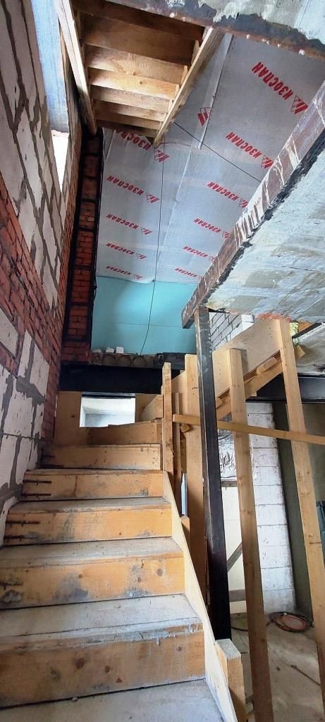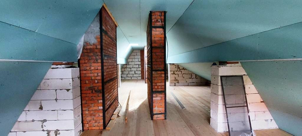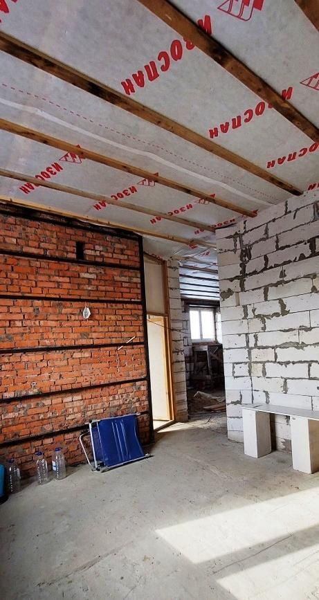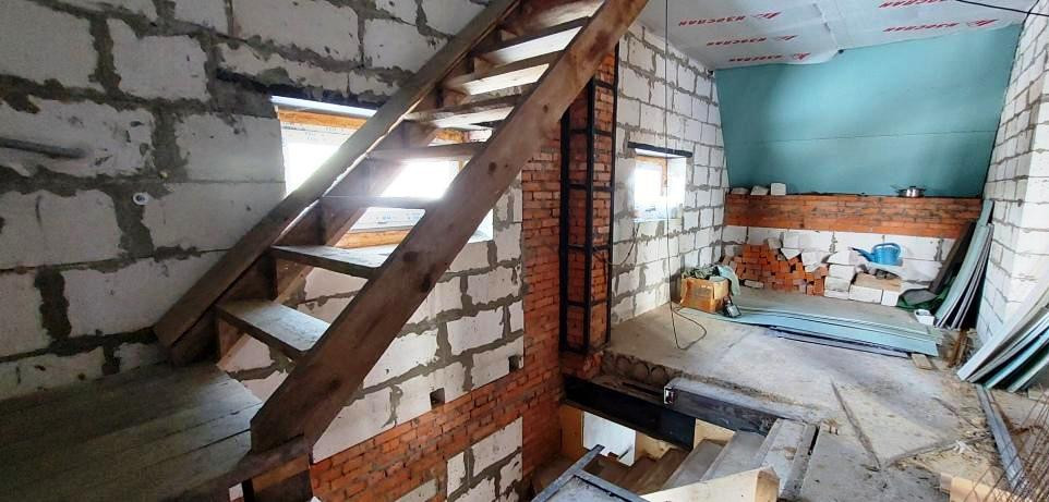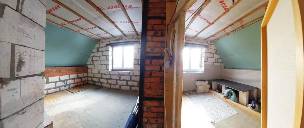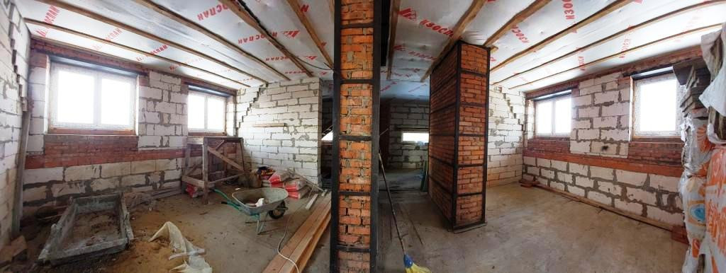 2-й этаж-140 м2. Четыре комнаты. Возведены стены. Установлены окна, утеплены перекрытия.