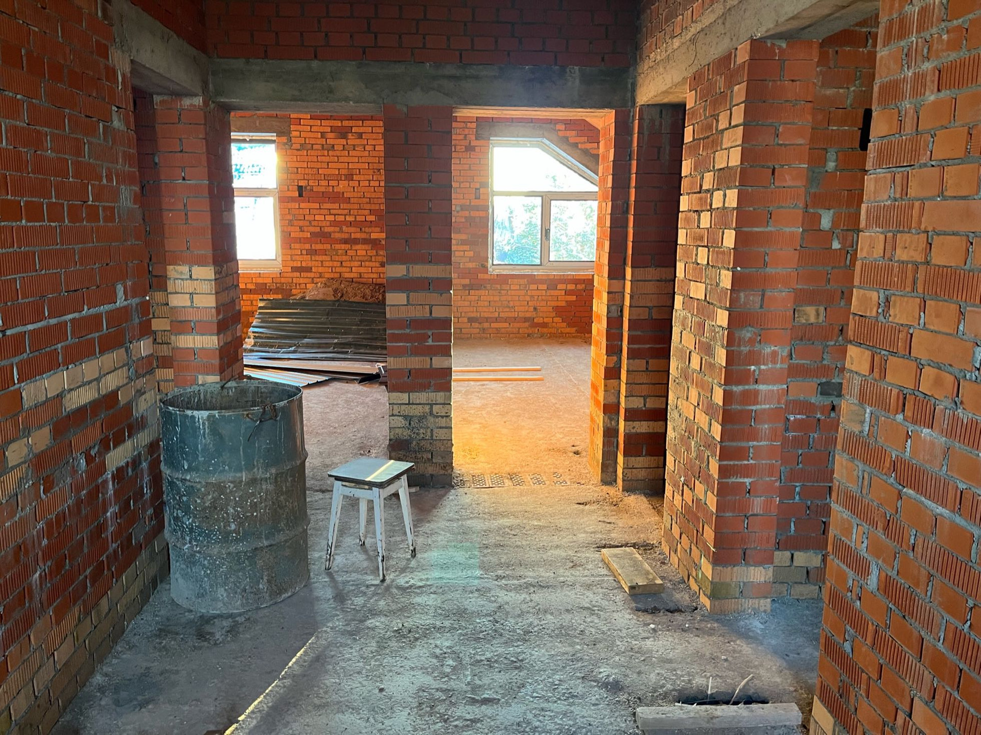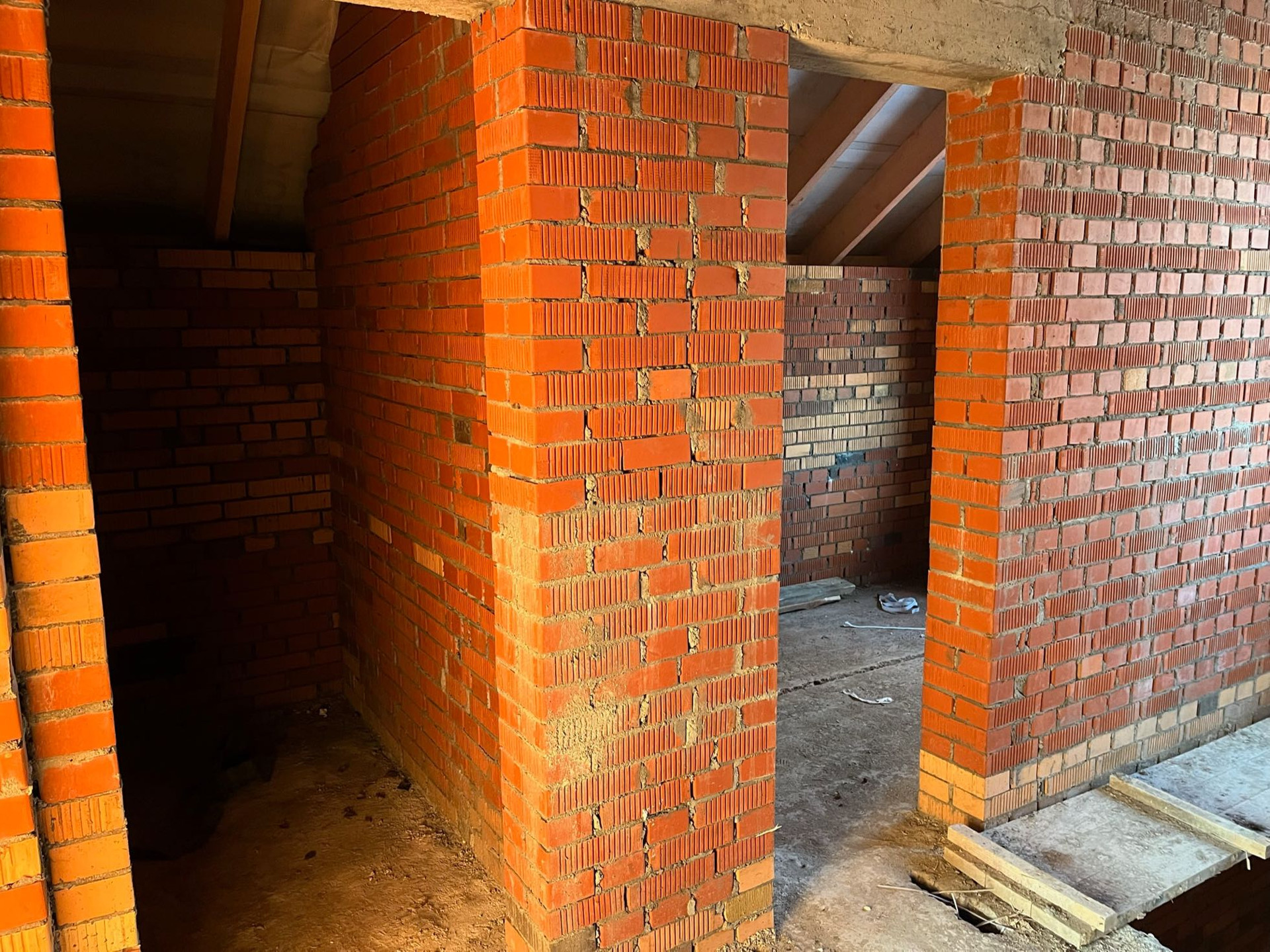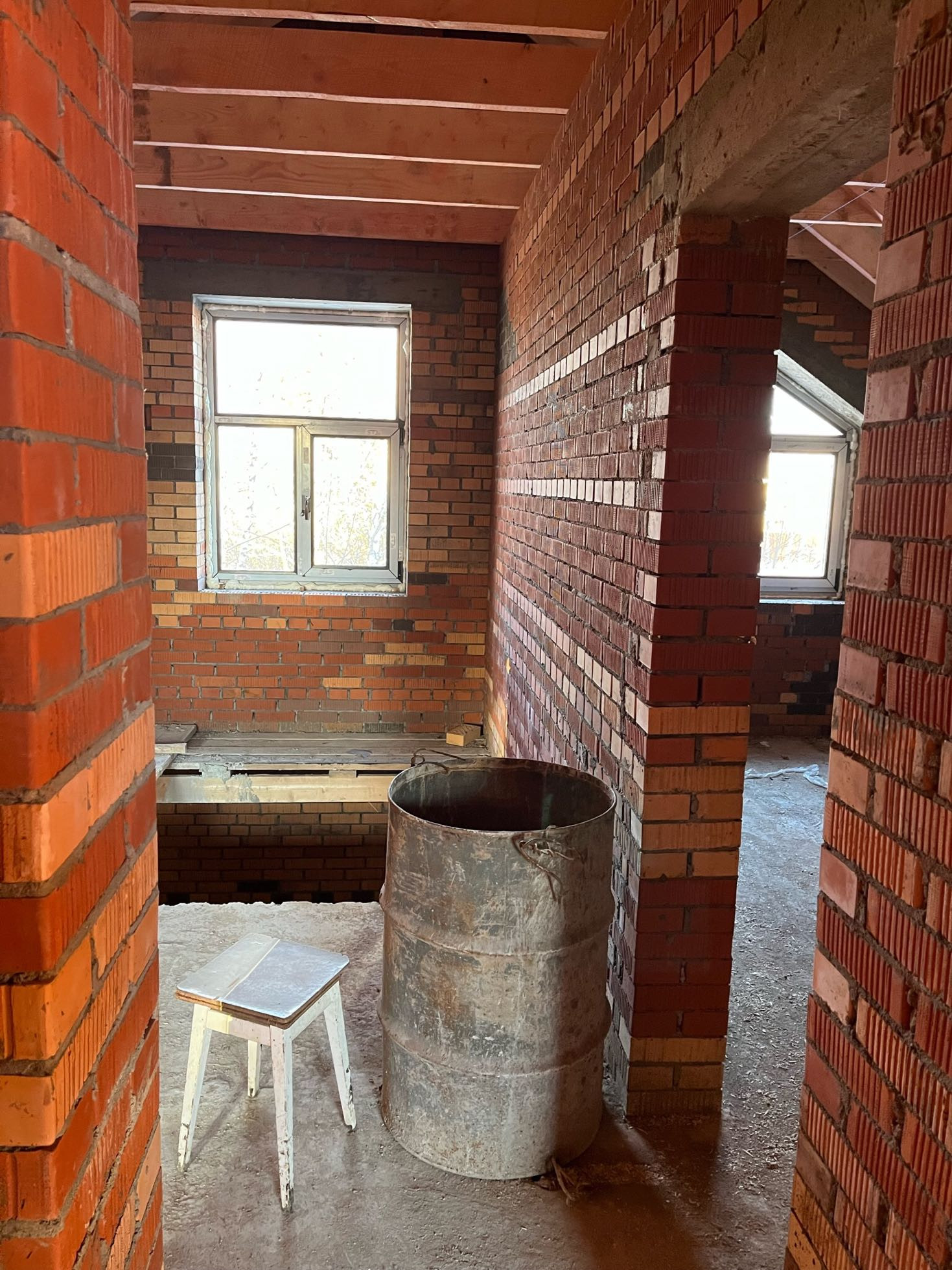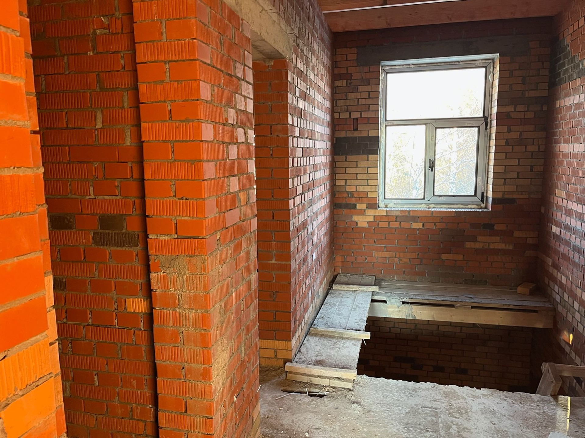 Стены выложены из керамического кирпича колодезной кладкой с заполнением пустот керамзит-бетоном. Толщина стен 51 см (два кирпича). Уже установлены окна пластиковые окна с декоративным узором под дуб.