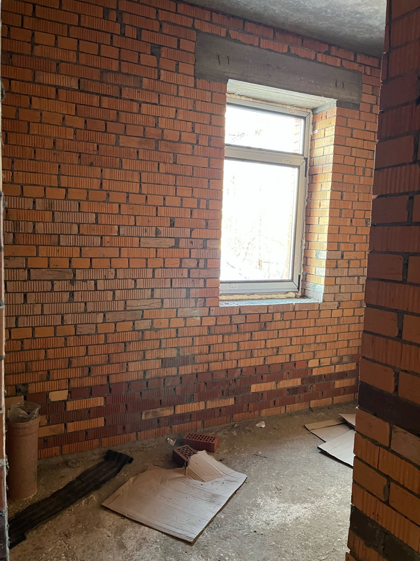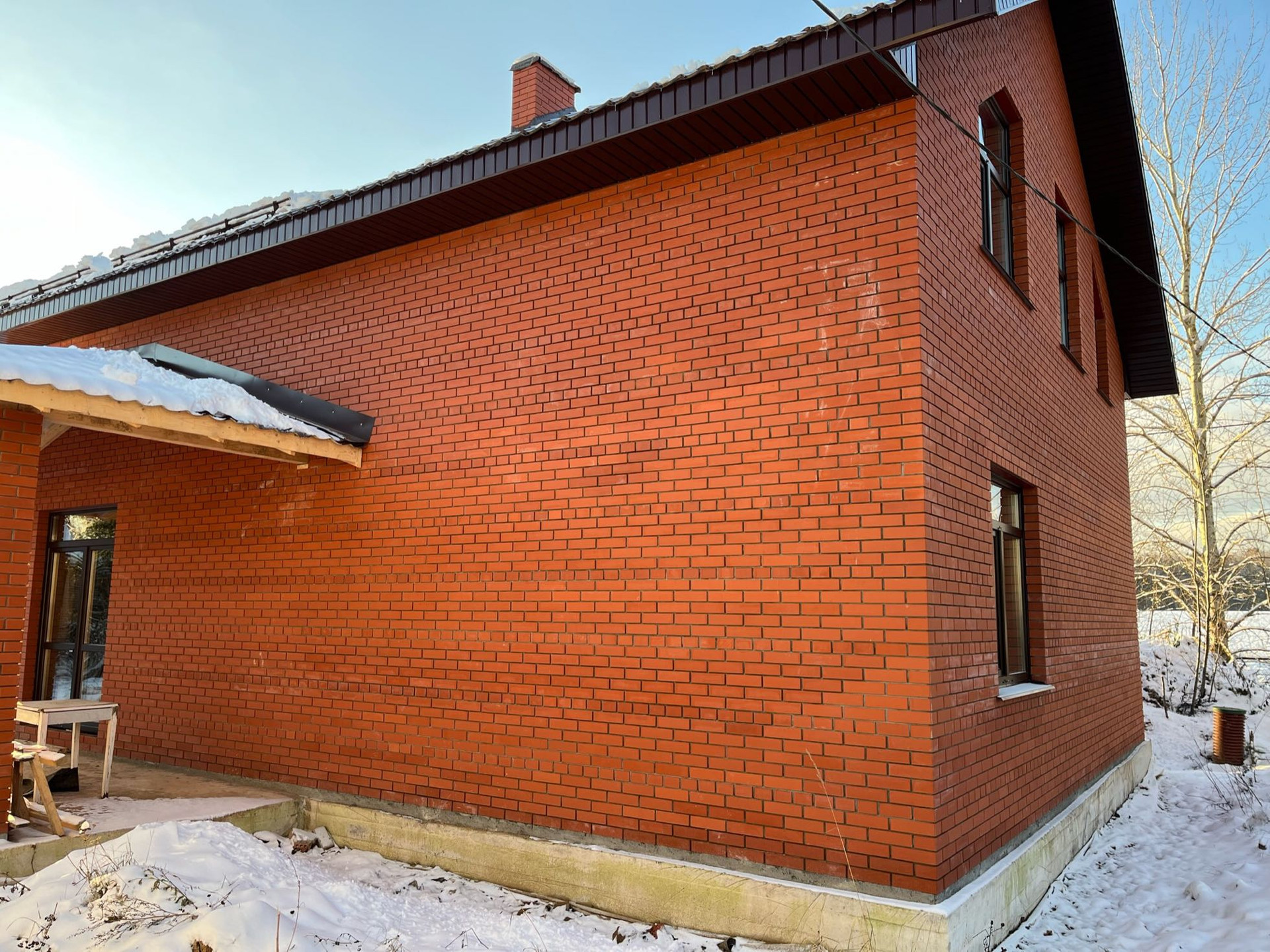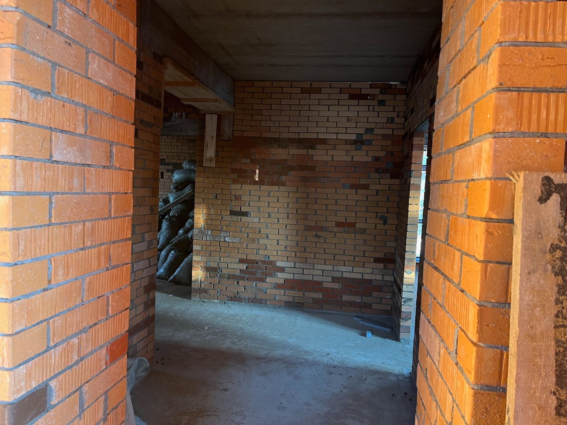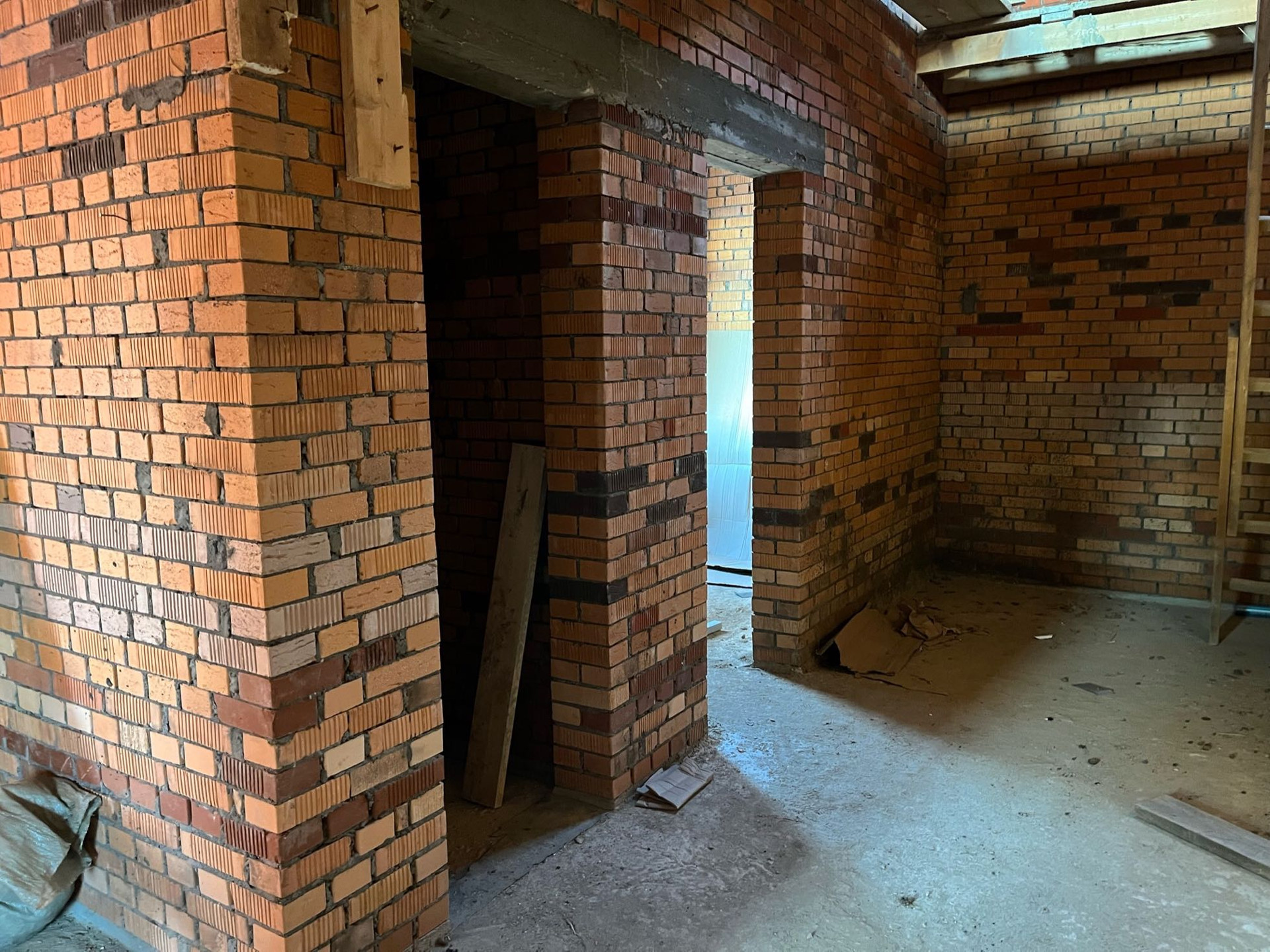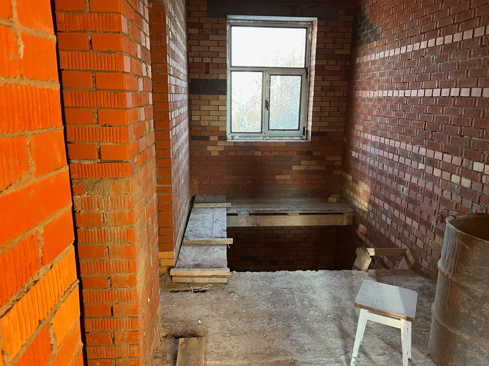 Стены выложены из керамического кирпича колодезной кладкой с заполнением пустот керамзит-бетоном. Толщина стен 51 см (два кирпича). Уже установлены окна пластиковые окна с декоративным узором под дуб.