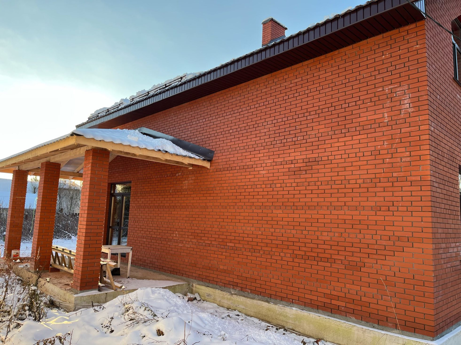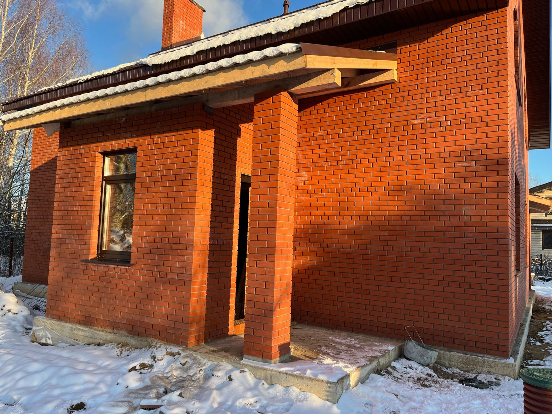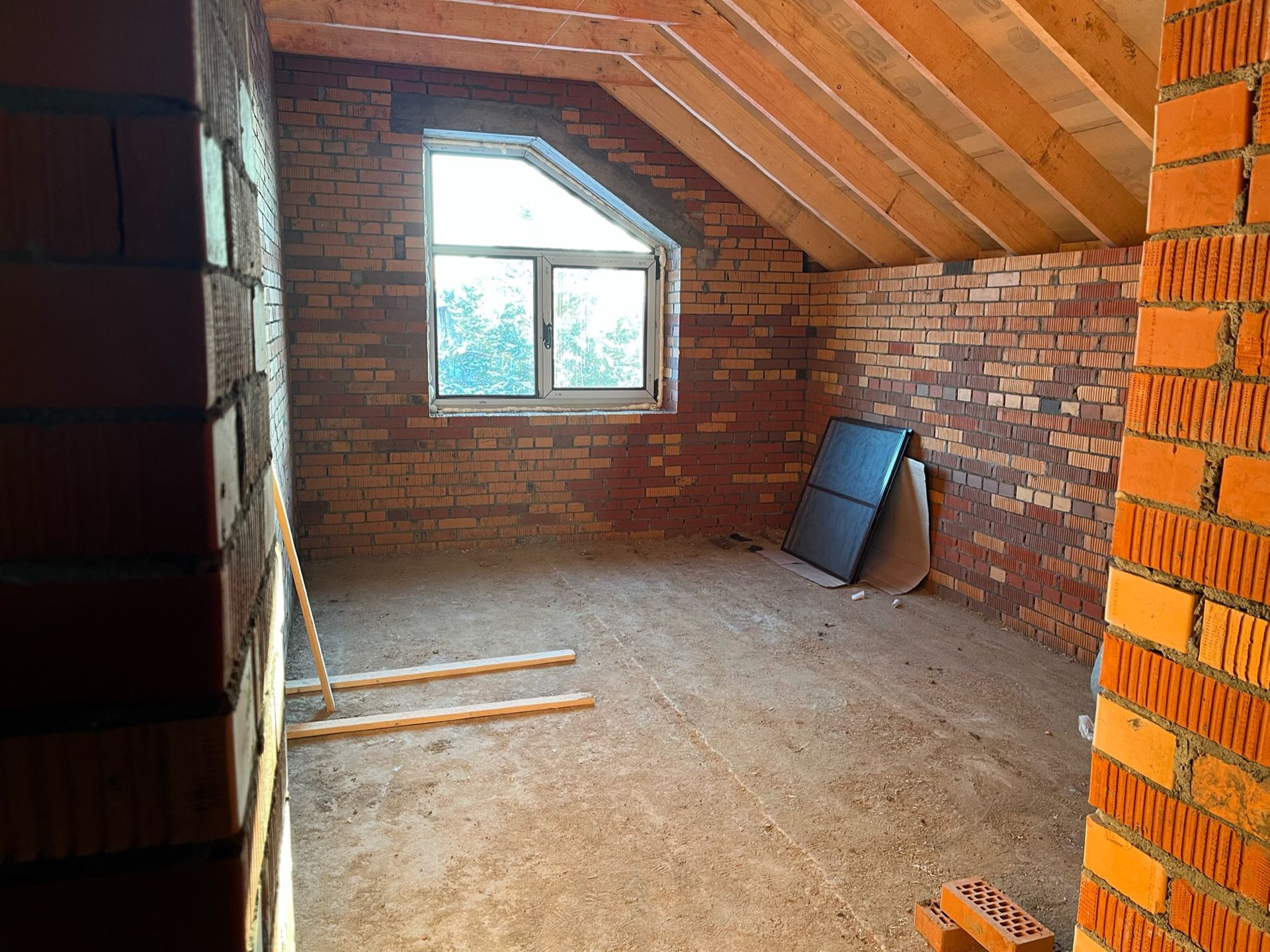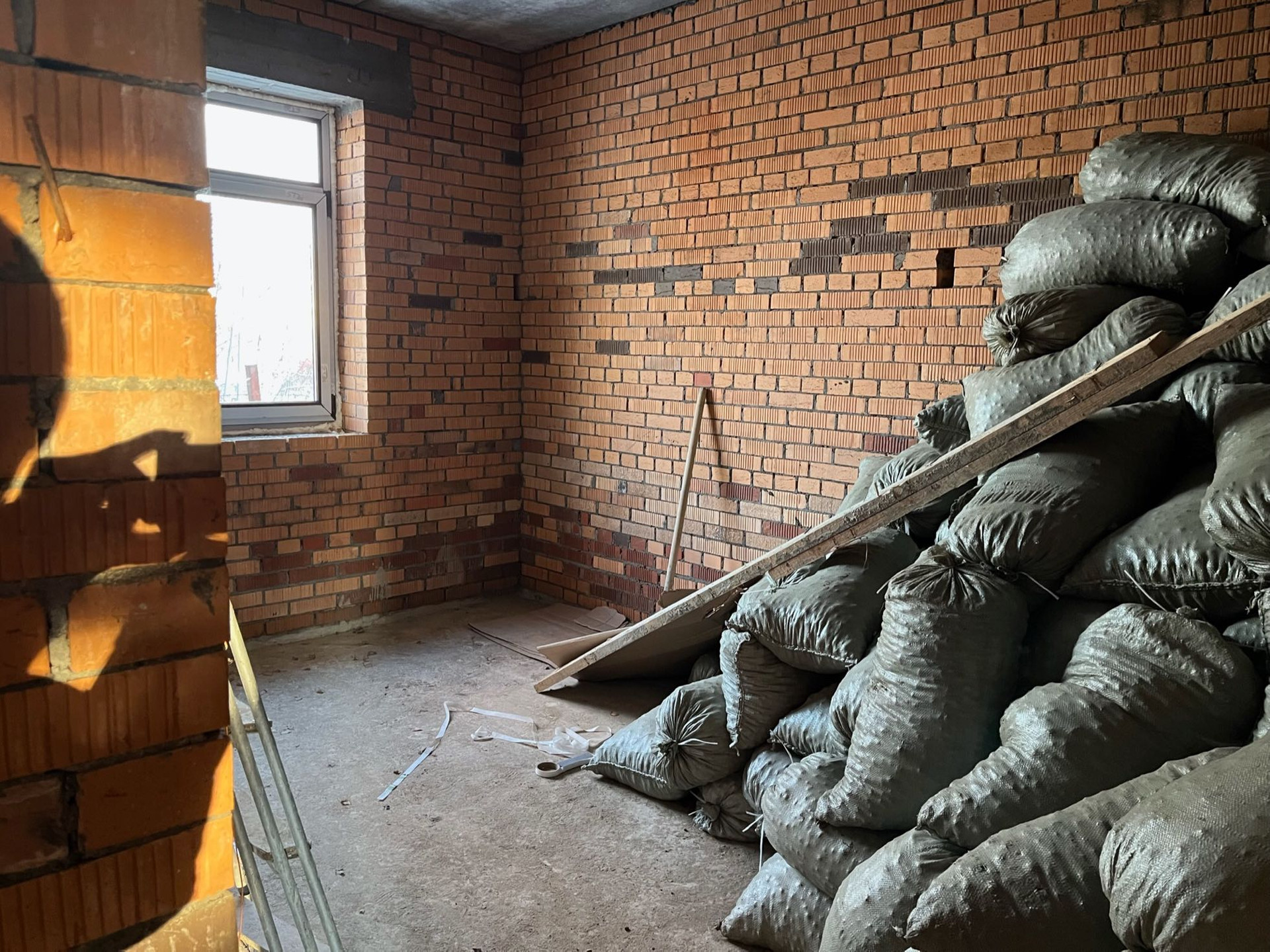 Стены выложены из керамического кирпича колодезной кладкой с заполнением пустот керамзит-бетоном. Толщина стен 51 см (два кирпича). Уже установлены окна пластиковые окна с декоративным узором под дуб.