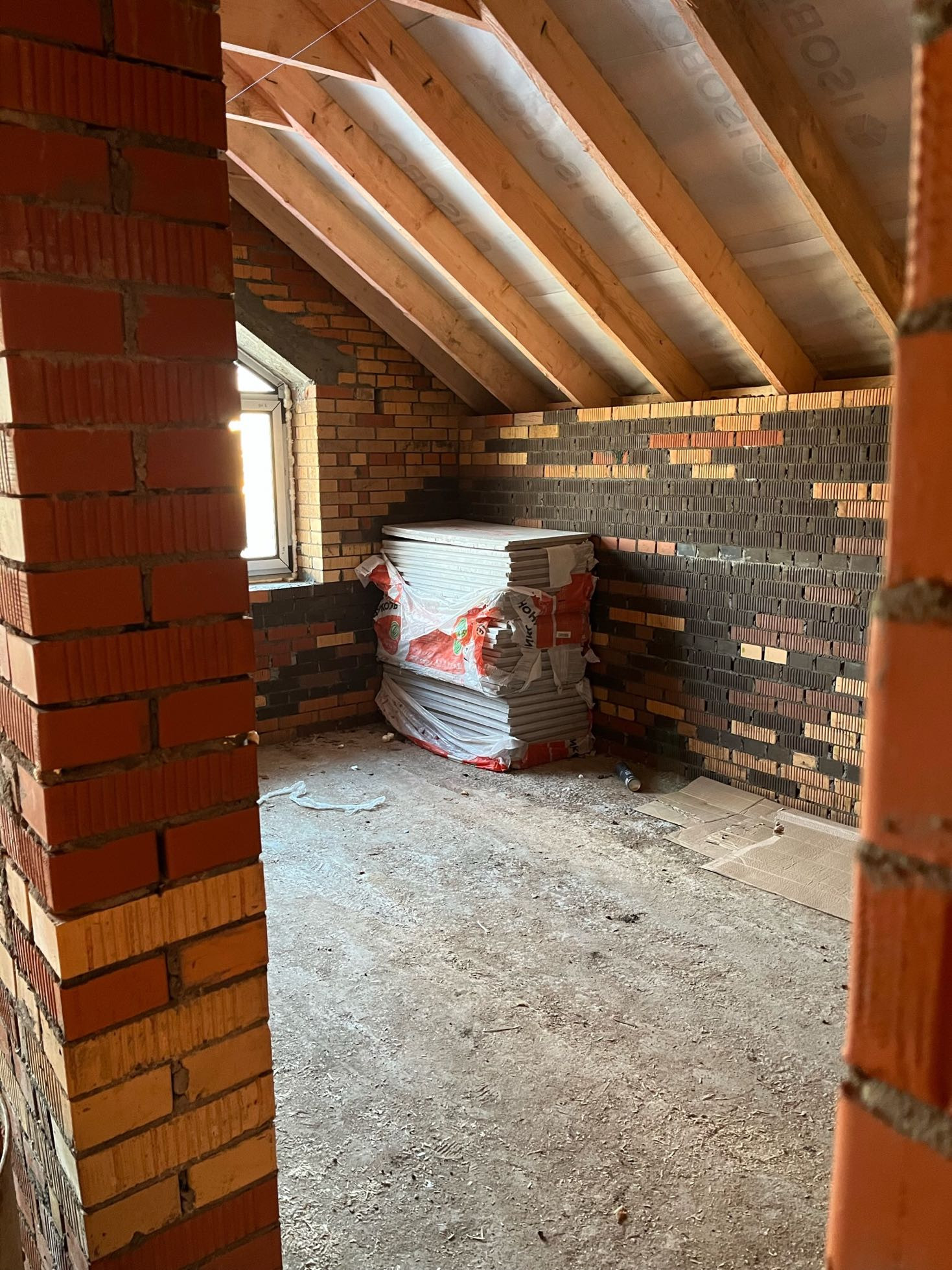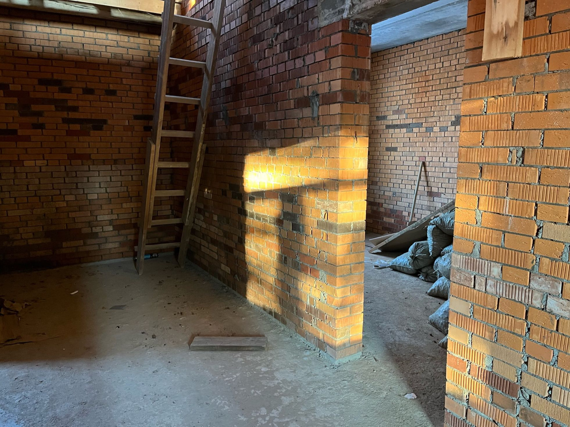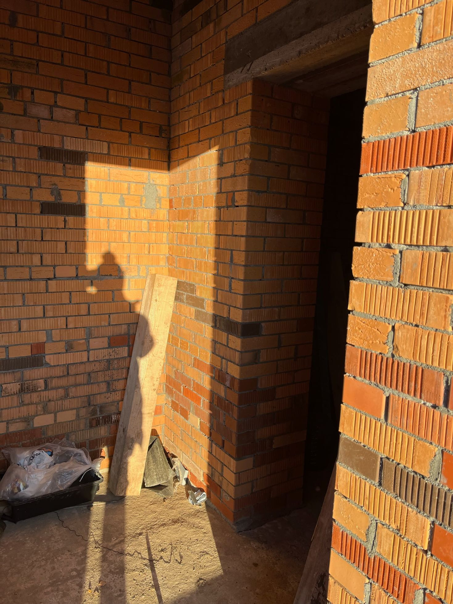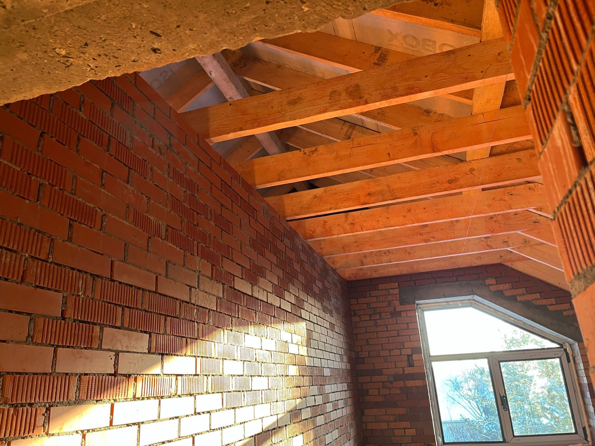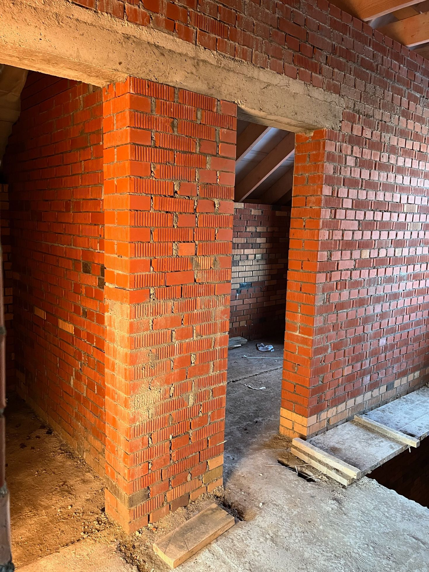 Стены выложены из керамического кирпича колодезной кладкой с заполнением пустот керамзит-бетоном. Толщина стен 51 см (два кирпича). Уже установлены окна пластиковые окна с декоративным узором под дуб.