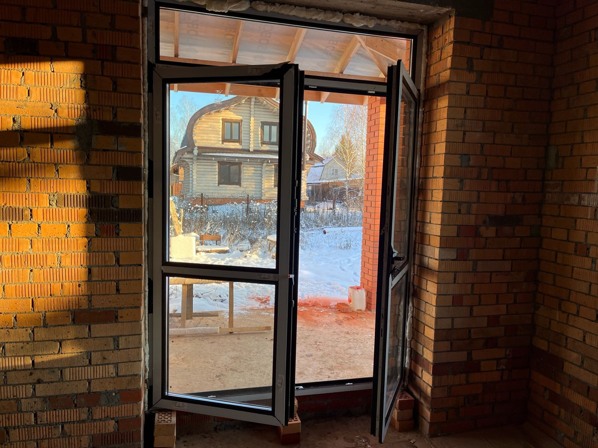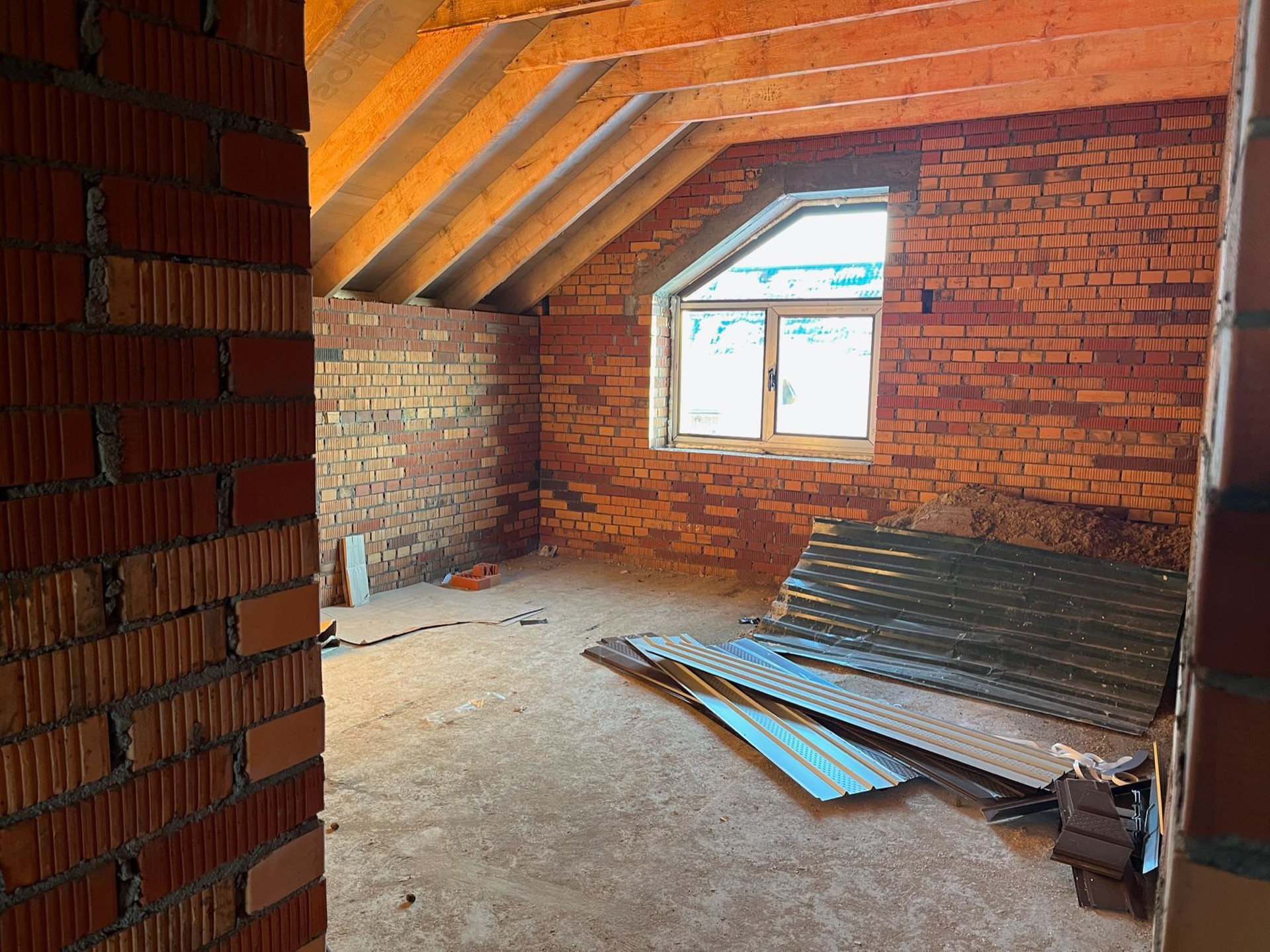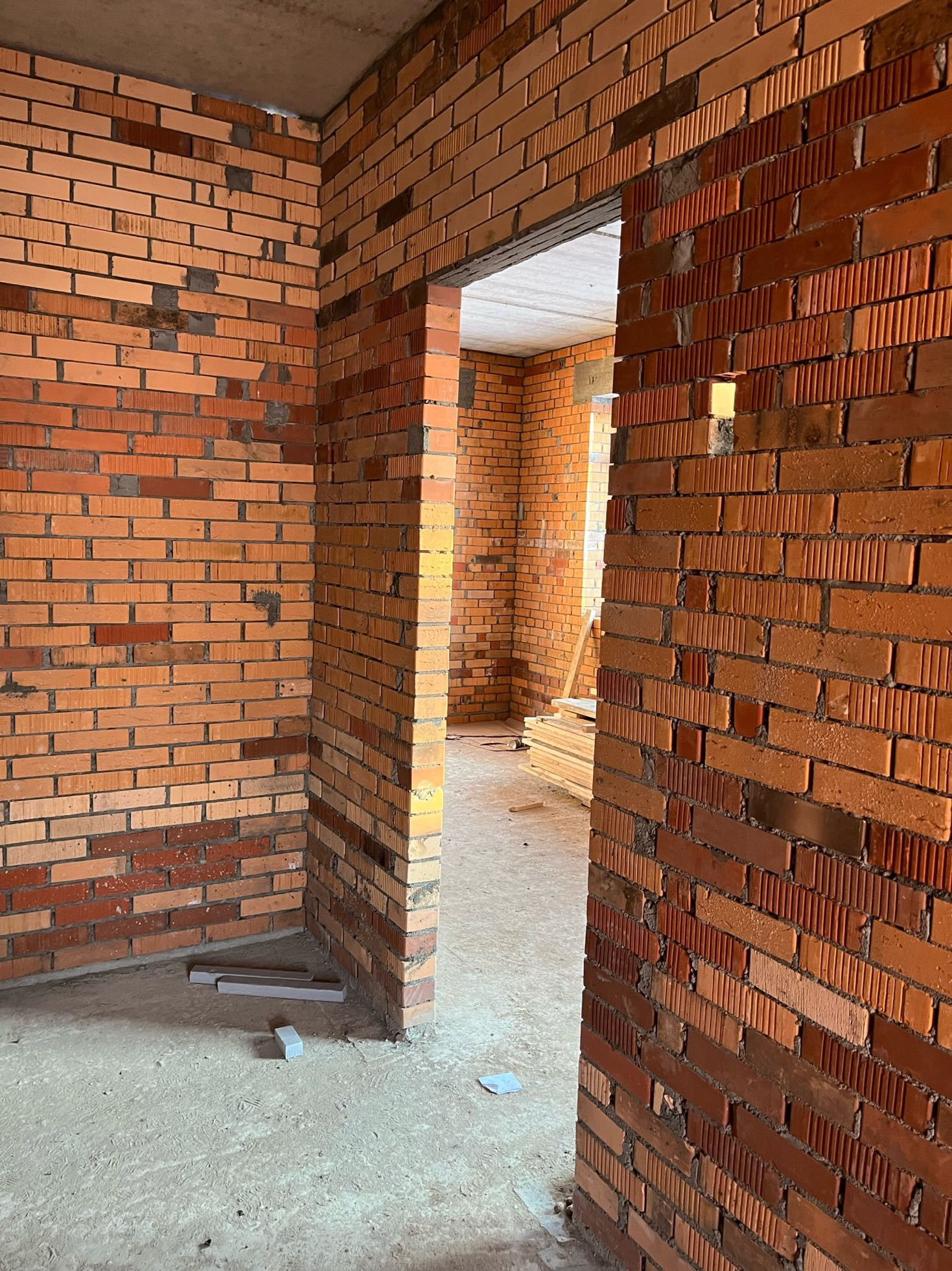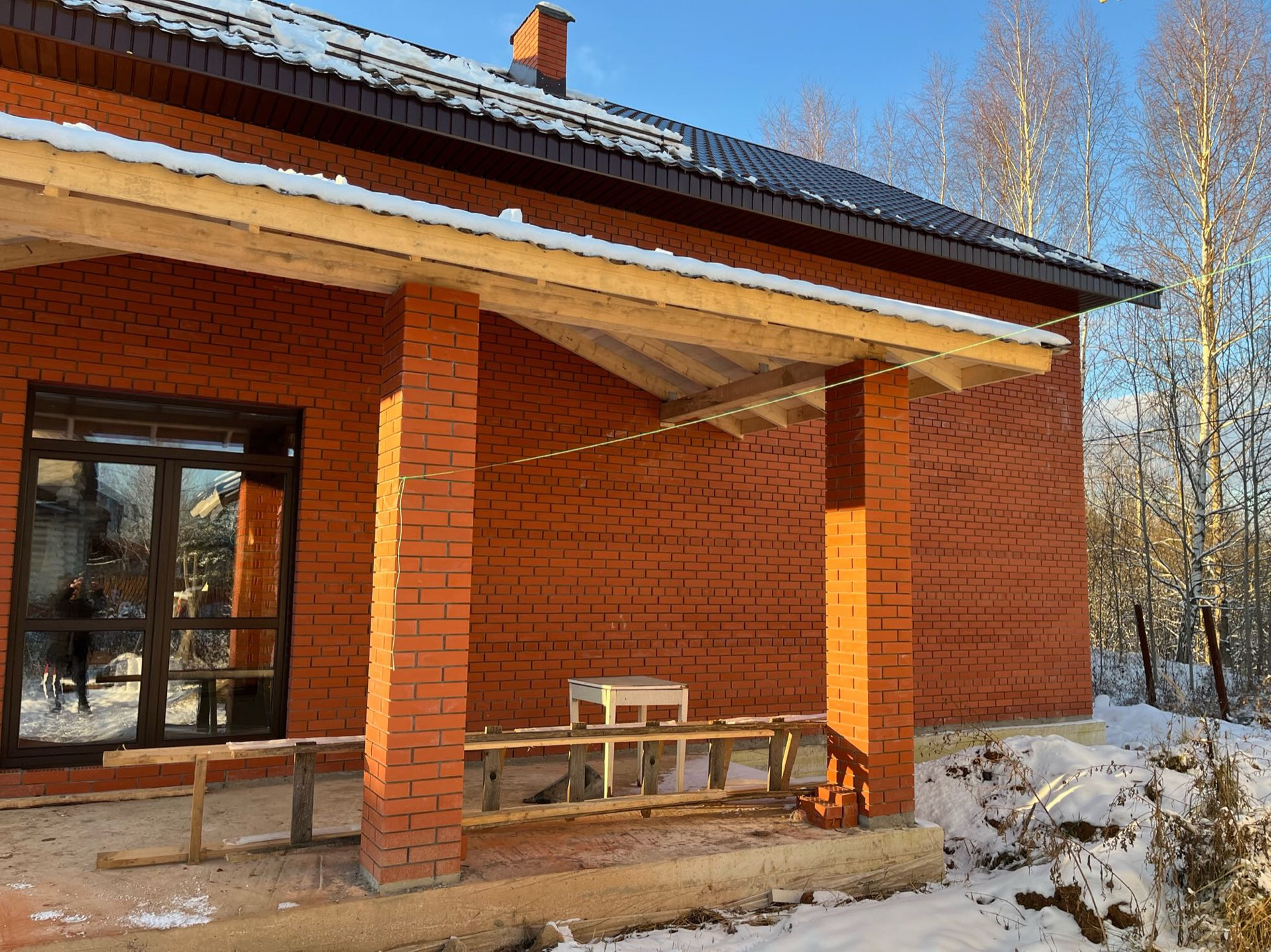 Стены выложены из керамического кирпича колодезной кладкой с заполнением пустот керамзит-бетоном. Толщина стен 51 см (два кирпича). Уже установлены окна пластиковые окна с декоративным узором под дуб.