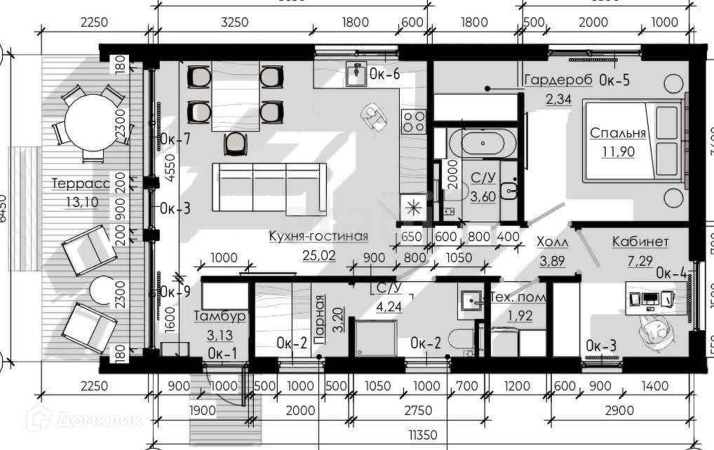 Кухня гостиная 28.3кв.м. По плану также 2 комнаты(10.6кв.м.,11.4кв.м),сауна,два санузла,гардеробная и тех.помещение где уже установлен бойлер для нагрева воды,котел,насос погружного типа.