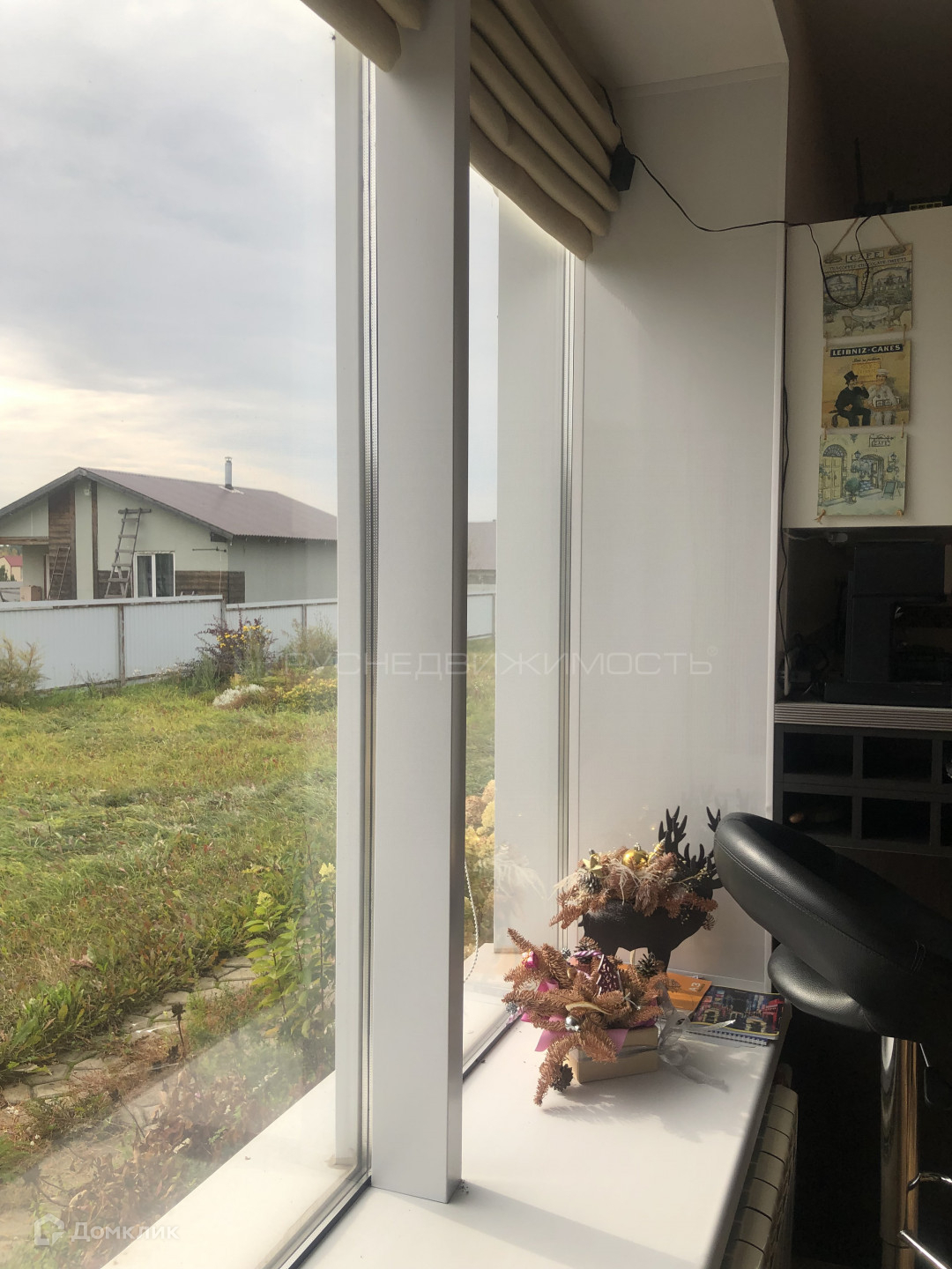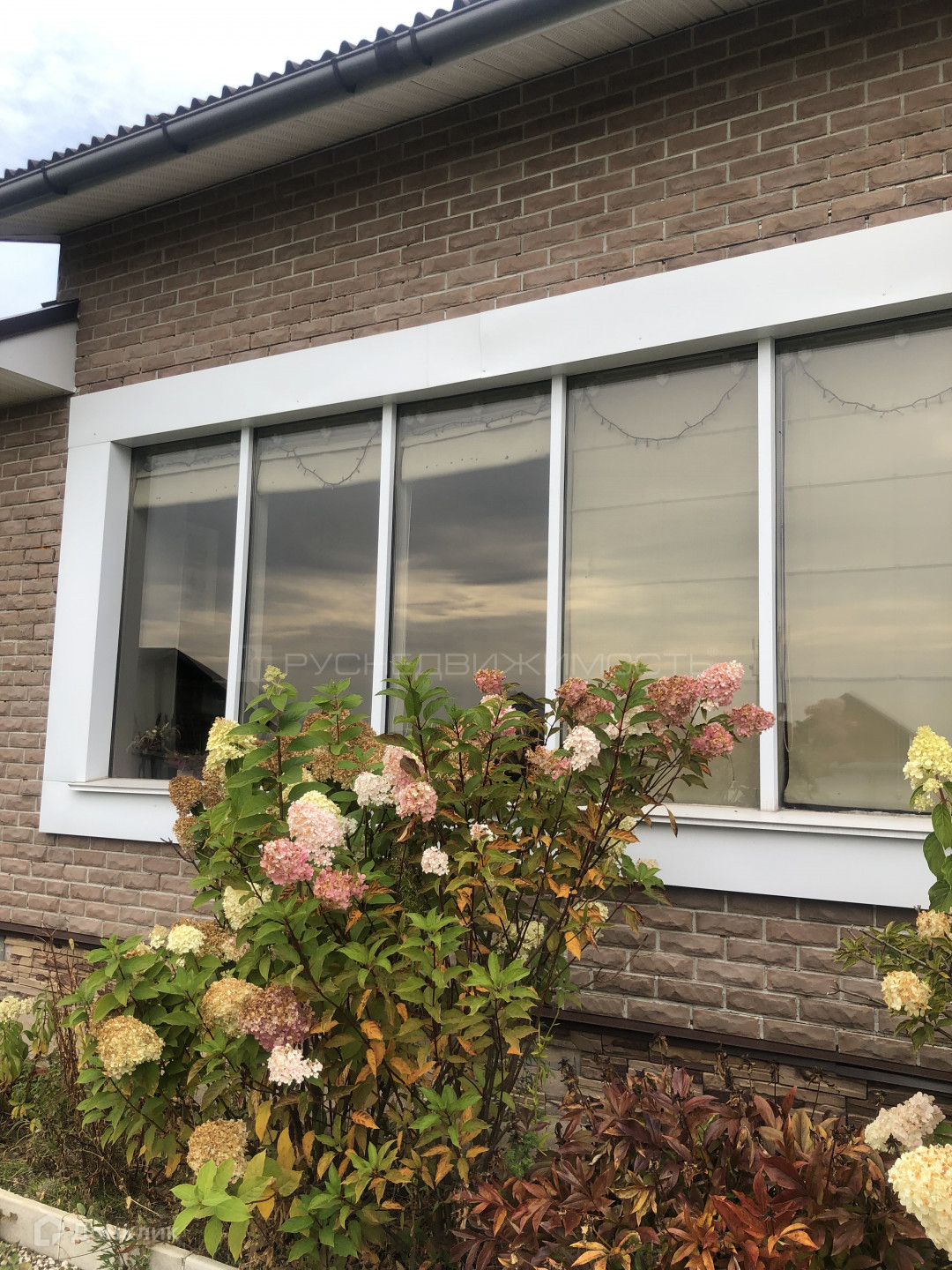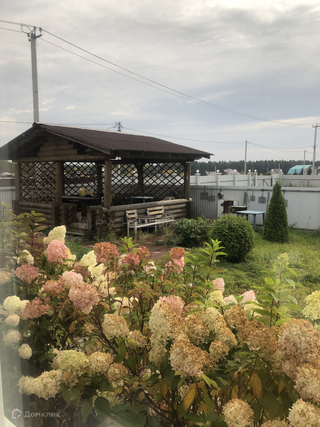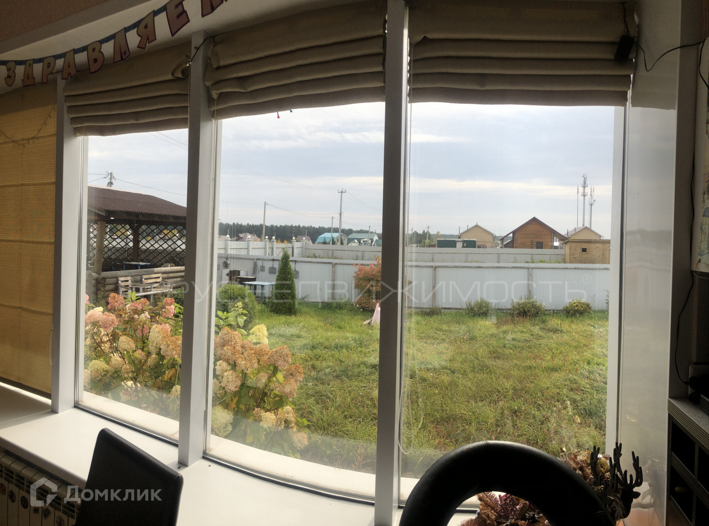 Панорамные окна в гостиной открывают чудесный вид на цветочную зону и шикарную беседку для приятного времяпровождения.