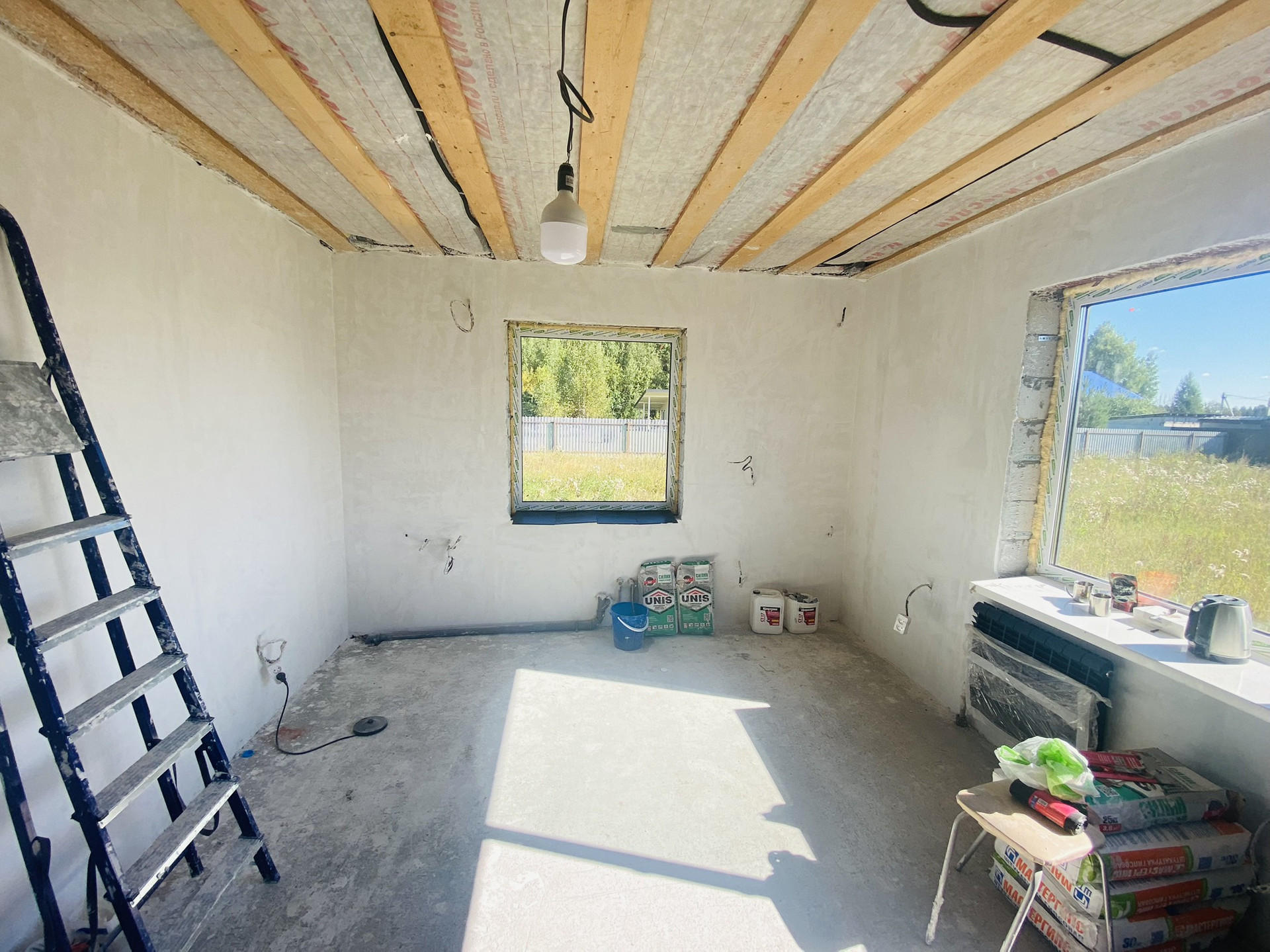 Стены отштукатурены, готовы к отделочным покрытиям. Полы подготовлены под ламинат и плитку.