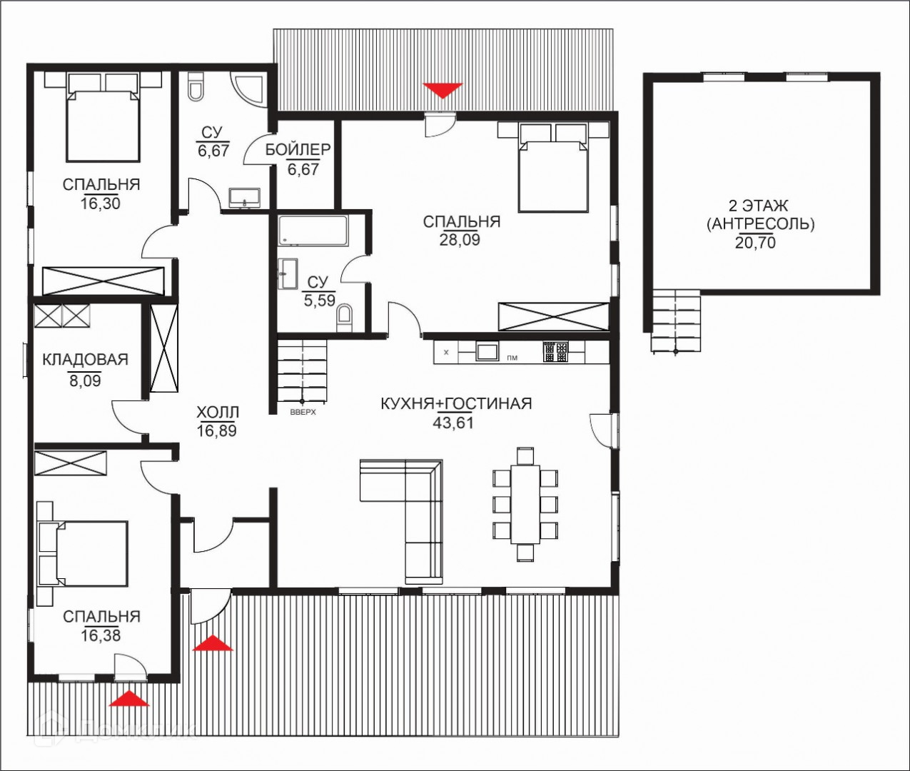 Просторная планировка включает в себя четыре спальни.