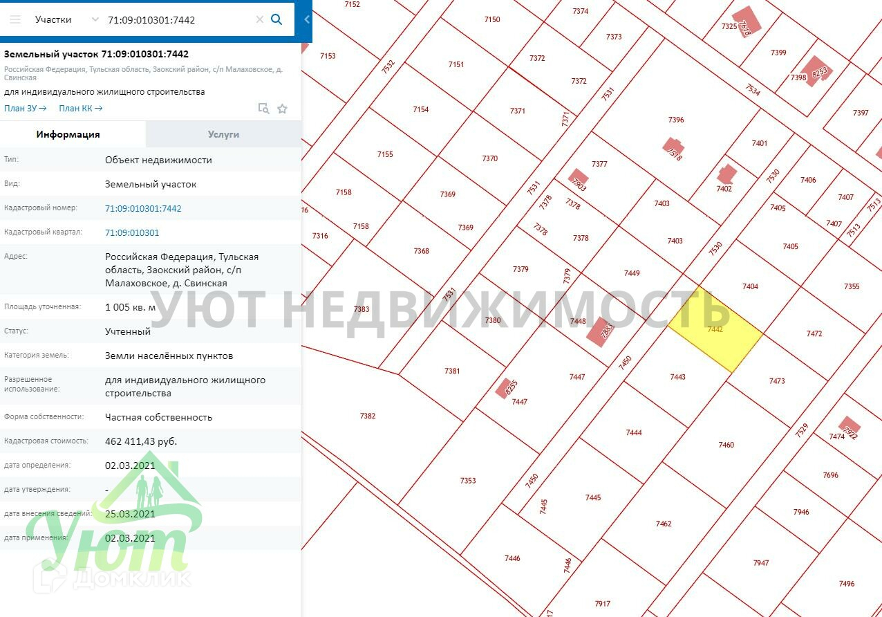 Земельный участок с кадастровым номером 71:09:010301:7442, Тульская область Заокский район, с/п Малаховское, д. Свинская