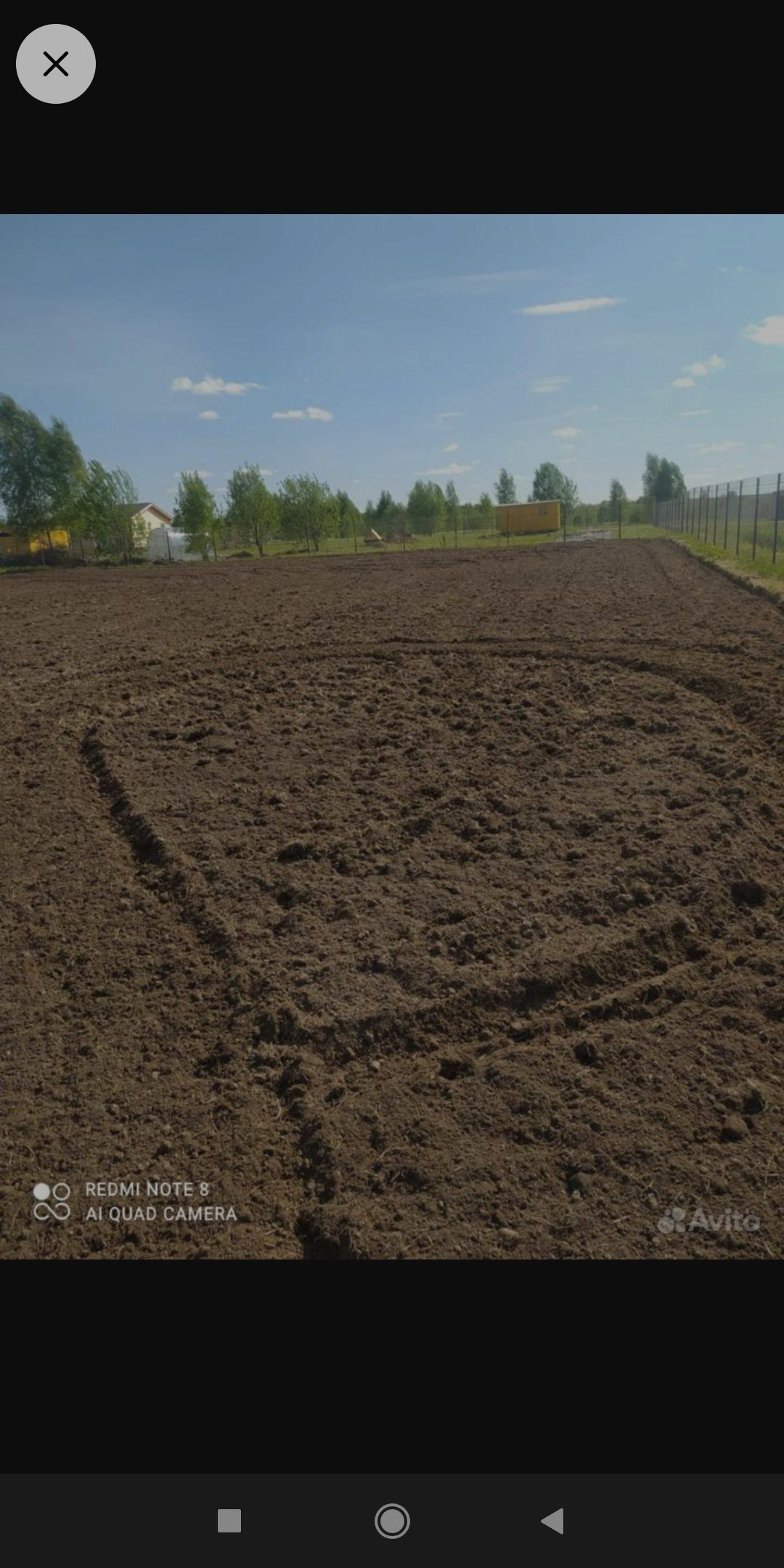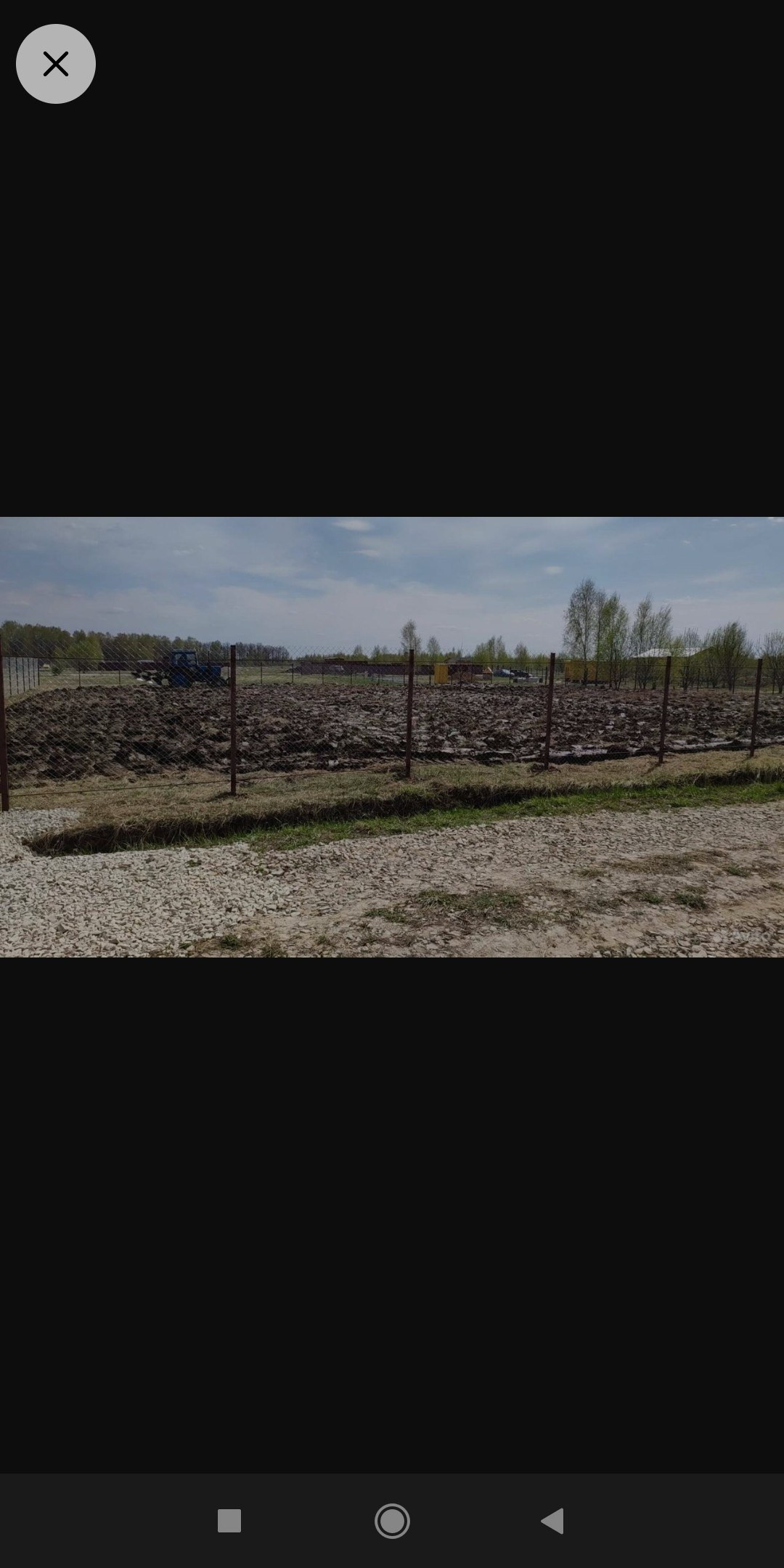 Забор - сетка рабица, коммуникаций нет (электричество в процессе подключения, газ в деревне, к участку только после постройки дома), только столбы рядом. Заезд - щебёнка, калитка без ворот.