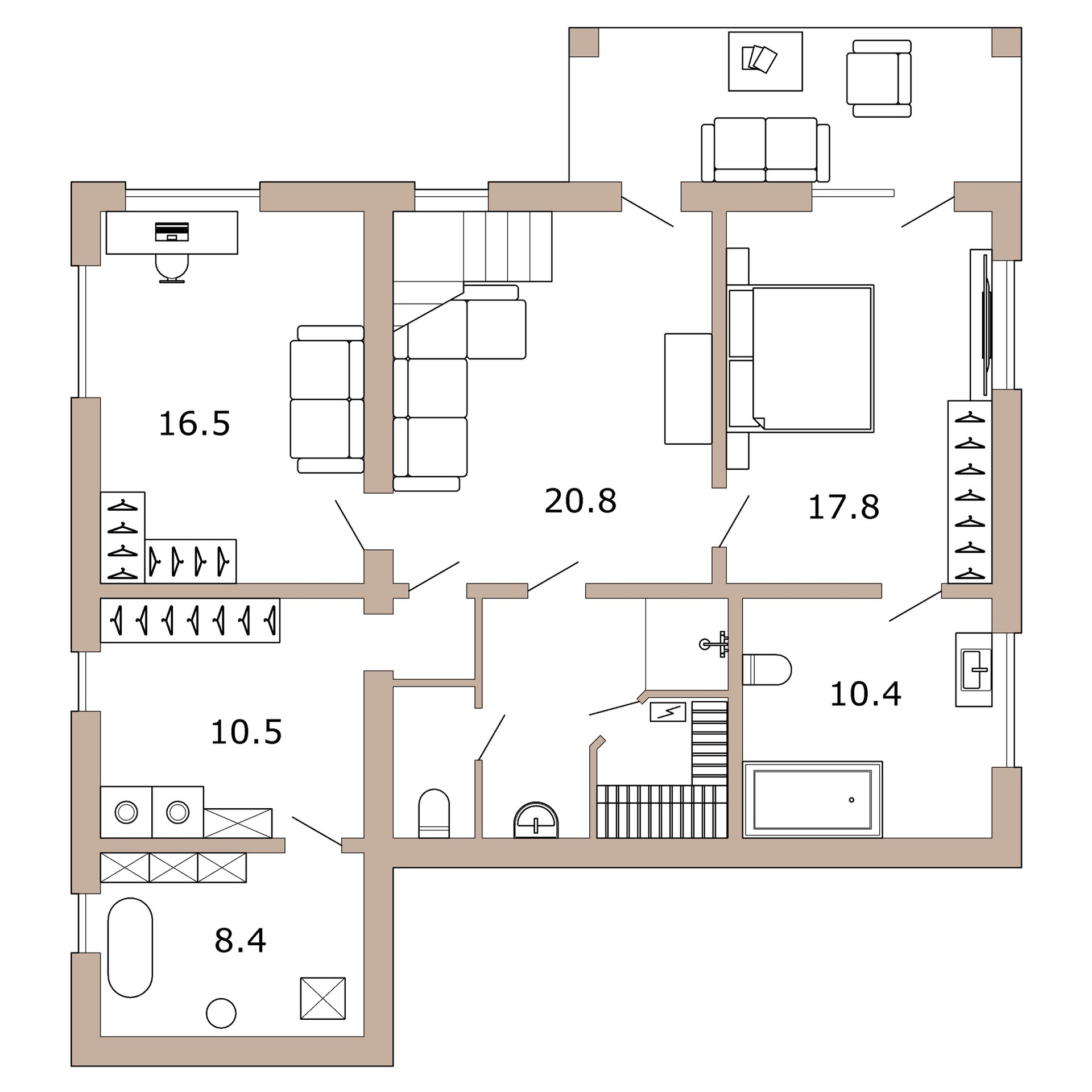 На цокольном этаже расположились холл, мастер-спальня, рабочий кабинет и баня с санузлом, а также постирочная и техническое помещение. Холл и мастер-спальня имеют выход на террасу.