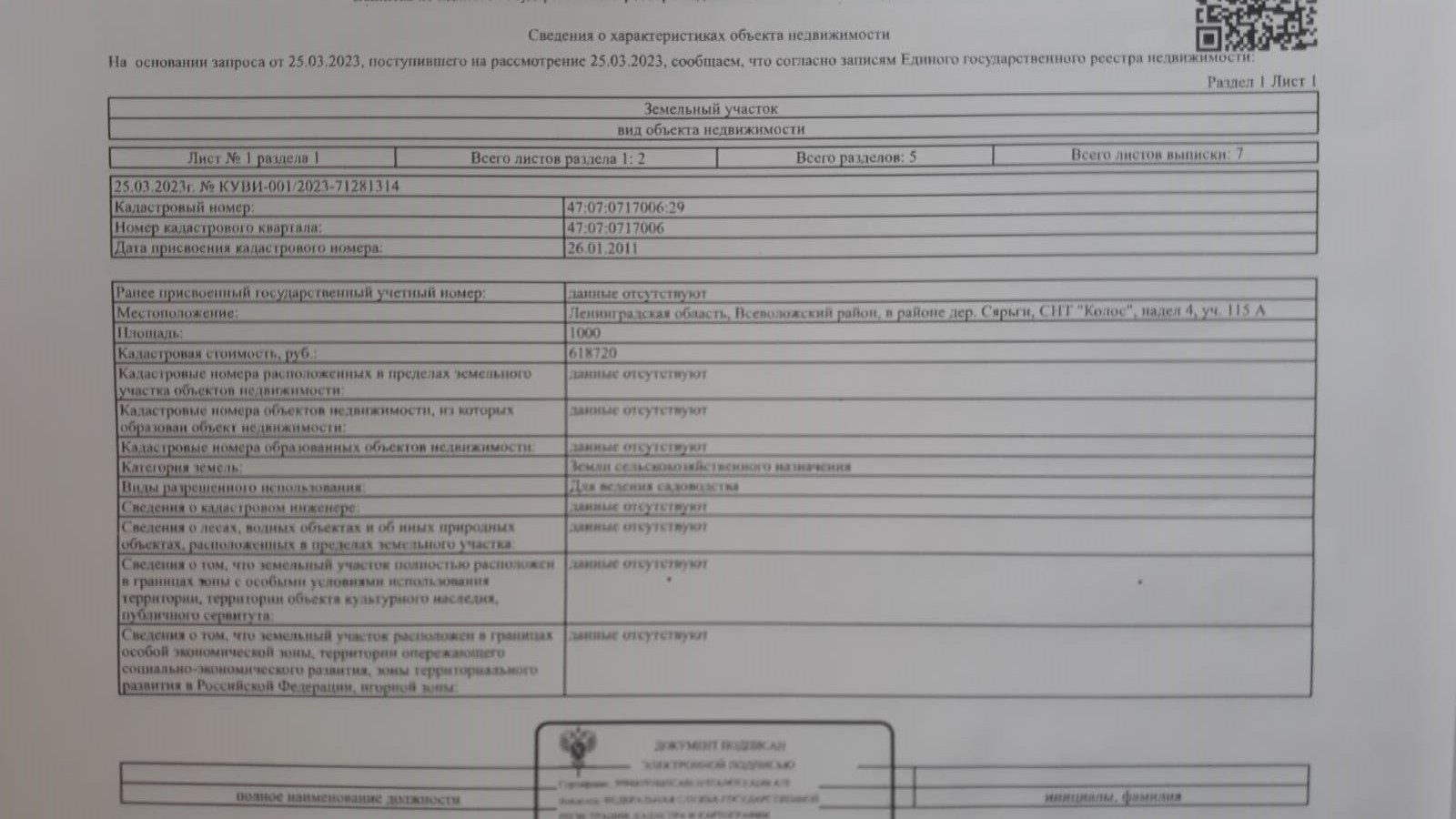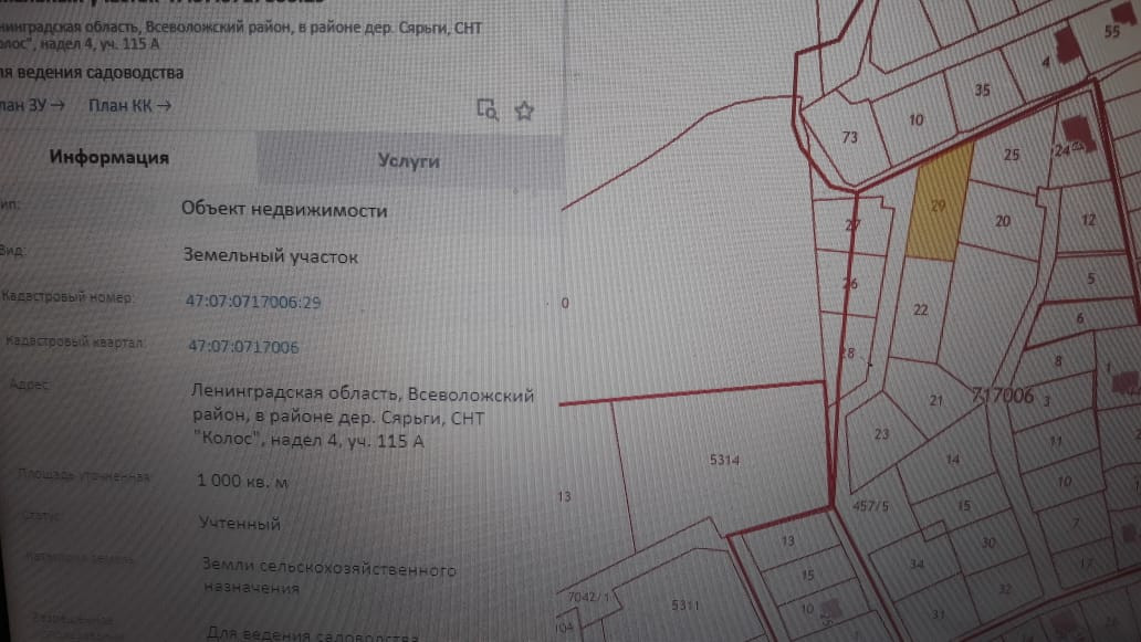 Рядом с курортом "Охта-парк", продаётся замечательный земельный участок в д. Сярьги, СНТ Колос, надел 4, участок 115А, для строительства жилого дома, можно сделать прописку (регистрацию). Соседи живут круглогодично, шума машин не слышно, участок расположен рядом с сосновым лесом, белок можно кормить с рук. Рядом п. Кузьмолово, п. Токсово, д. Энколово, д. Коробсельки. До Охта-парка 2 км, Мега-Парнас 8 км, КАД-8км, метро Парнас-10 км, ходит маршрутка до ст. метро Девяткино №680, в деревне есть продуктовый магазин. Участок: кад. номер: 47:07:0717006:29; площадь-1000 (10 соток) межевание проведено; категория земли-земли с/х назначения; вид разрешённого использования-для ведения садоводства, на участке стоит сосновый лес. Коммуникации: дороги-грунтовые (зимой чистят), электричество-подключают до 15 кВт, газ прокладывают по садоводству, вода-скважина или колодец (на ваше усмотрение), на территории СНТ есть родник с питьевой водой, въезд через автоматический шлагбаум, в 70 метрах есть пожарный водоём с рыбой, не далеко есть два озера, Светлое и Изумрудное. Один взрослый собственник более 5 лет, полная стоимость в ДКП, прямая продажа-без встречной покупки, подходит под ипотеку любого банка, обременений и ограничений нет, долгов по членским взносам нет ( в год-1 200 рублей за сотку), продажа в связи с переменой места жительства. Звоните, просмотр по договорённости.