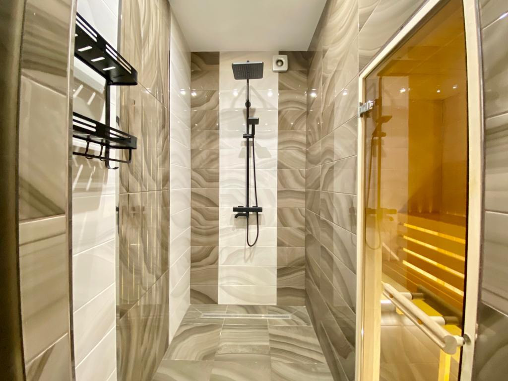 1-й этаж: Гостиная с камином, кухня, холл, прихожая, постирочная, 1 спальня, сан.узел (душевая, финская сауна).