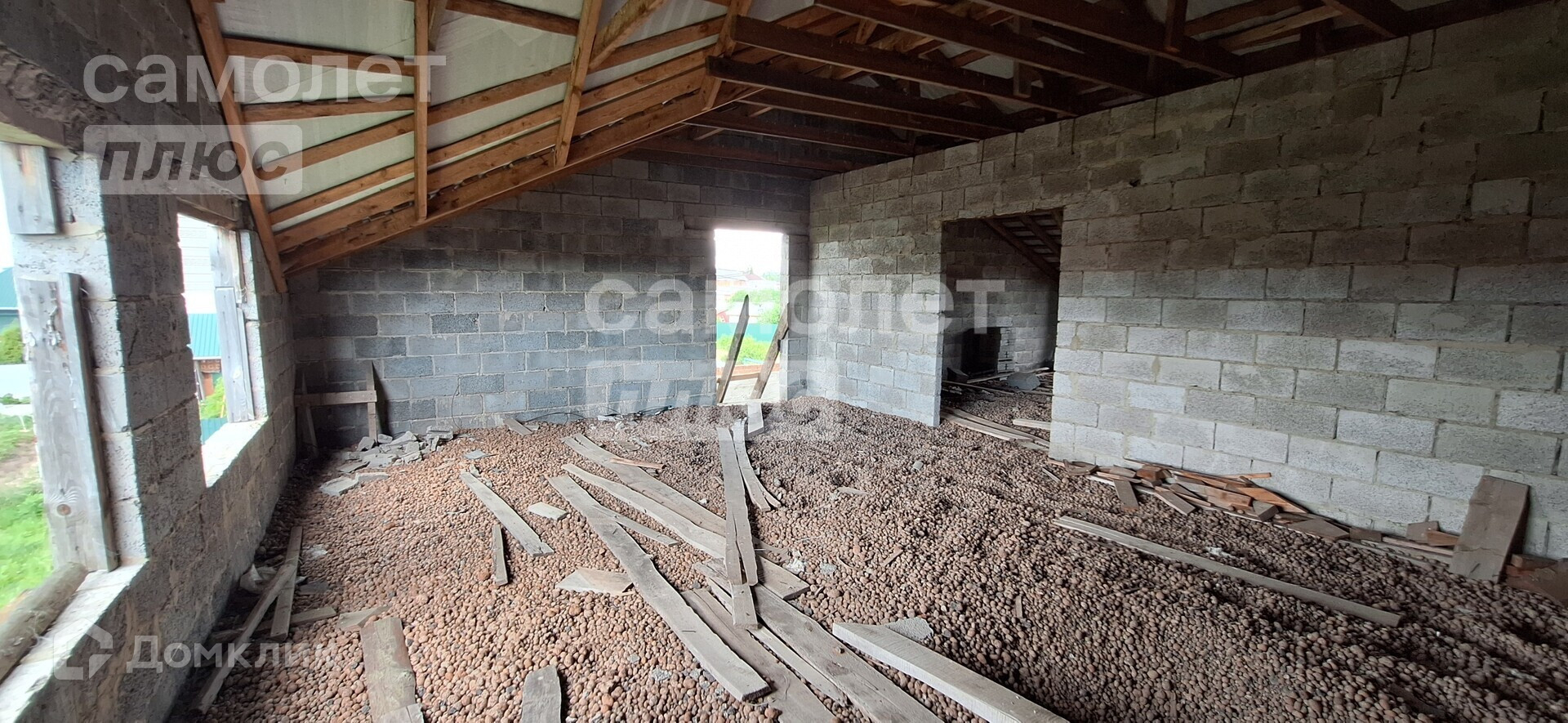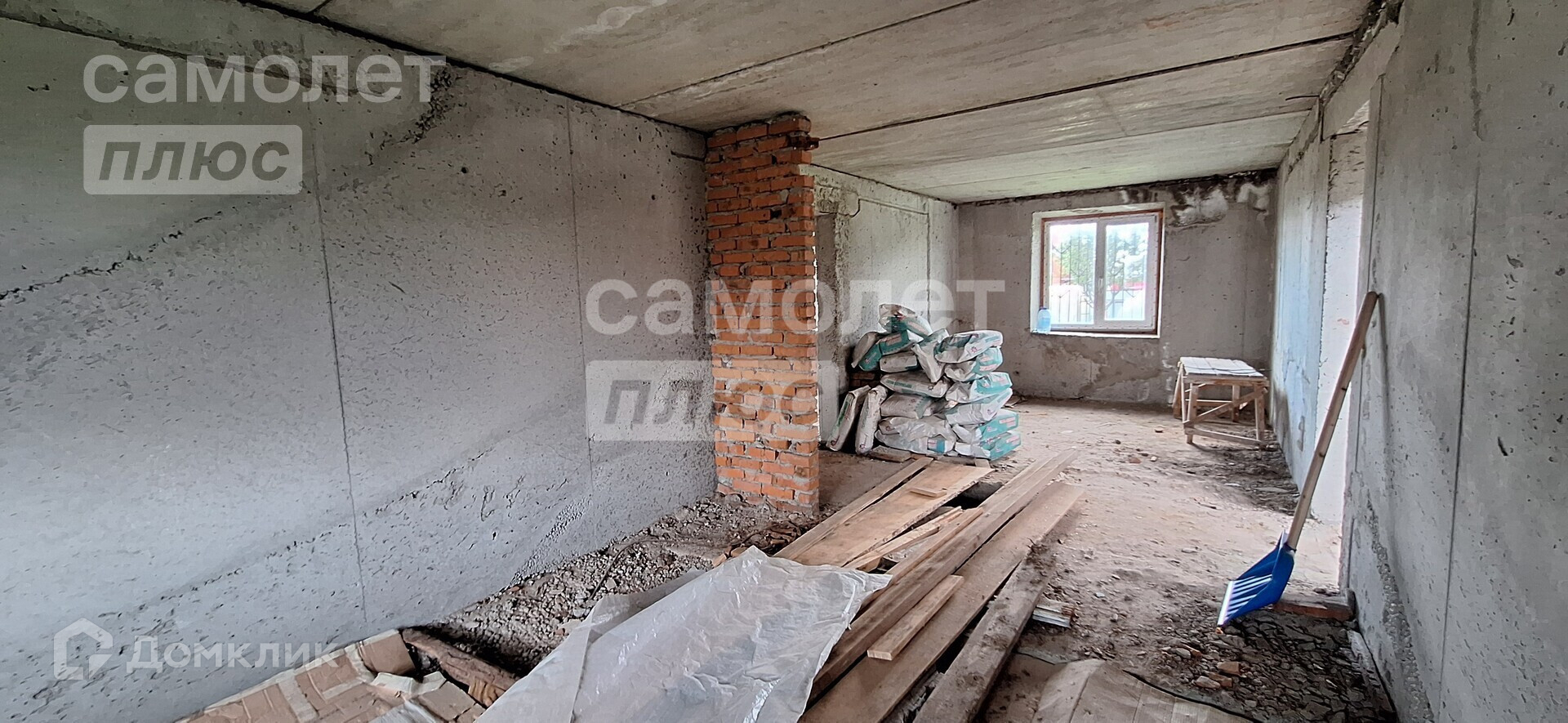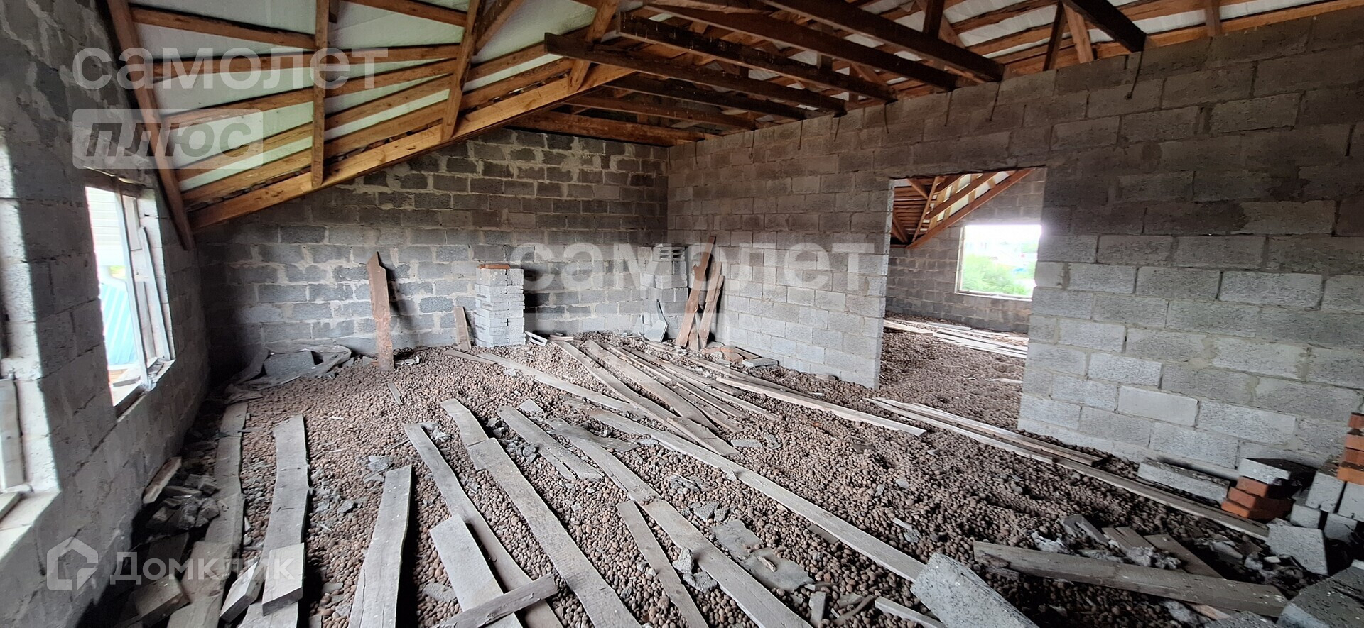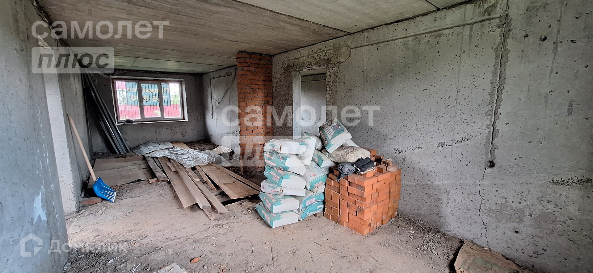 Дом двухэтажный, без отделки, как с наружи, так и внутри. На первом этаже стоят пластиковые окна.