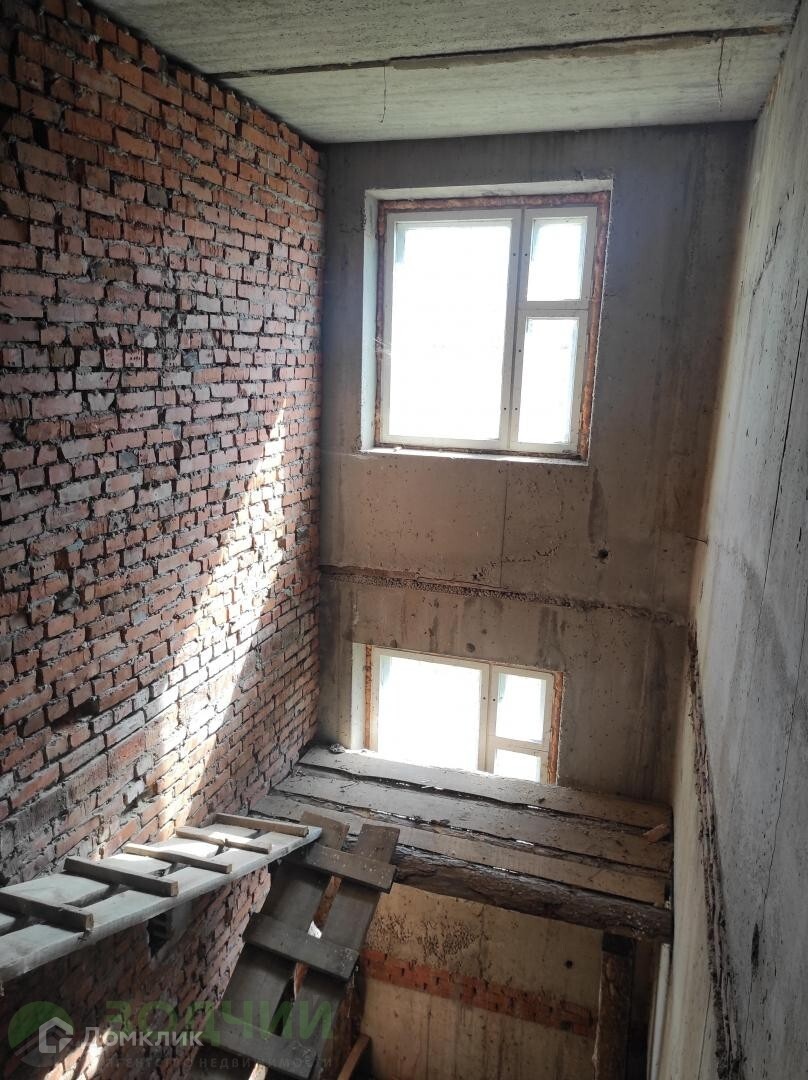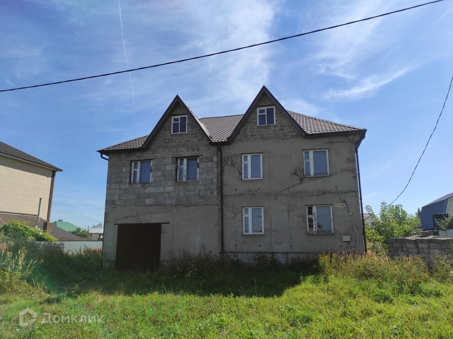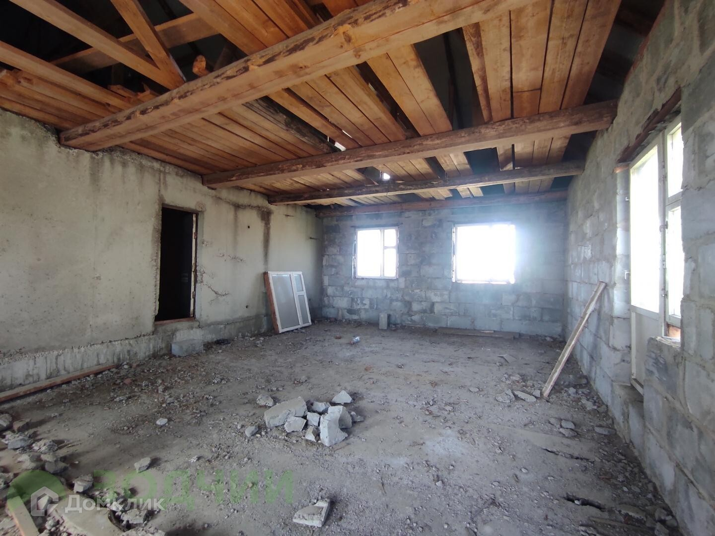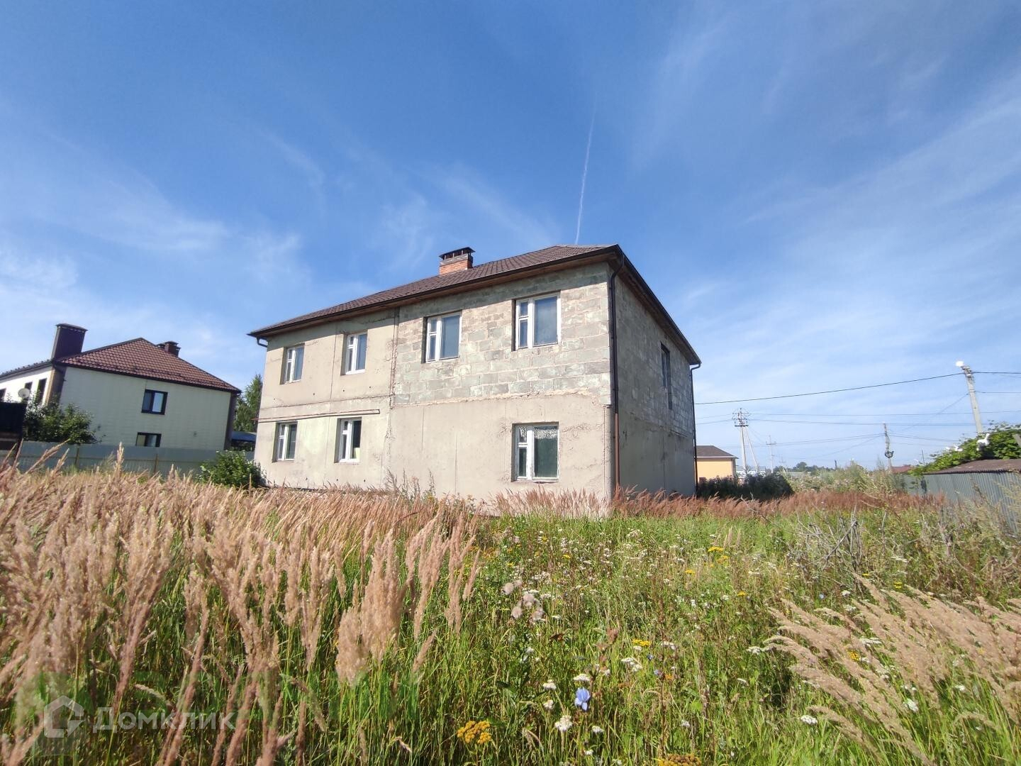 На участке расположен монолитный 2-ух этажный дом. Дом в черновой отделке, внутренние перегородки кирпичные. Окна деревянные. Крыша — металлочерепица.