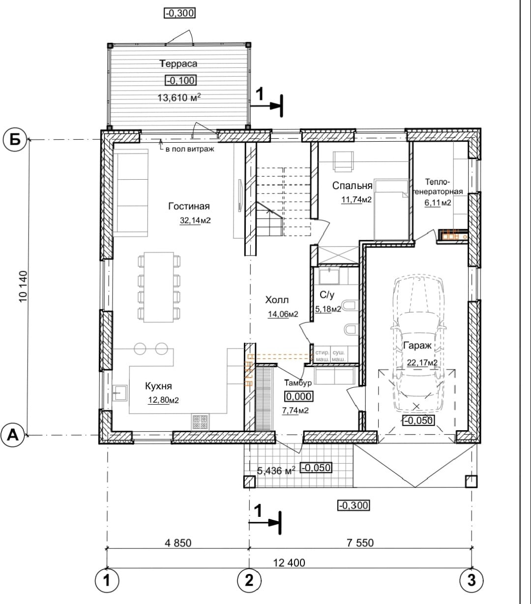 На первом этаже – кухня, гостиная, санузел, спальня, бойлерная и большое хоз.помещение (вместо гаража).