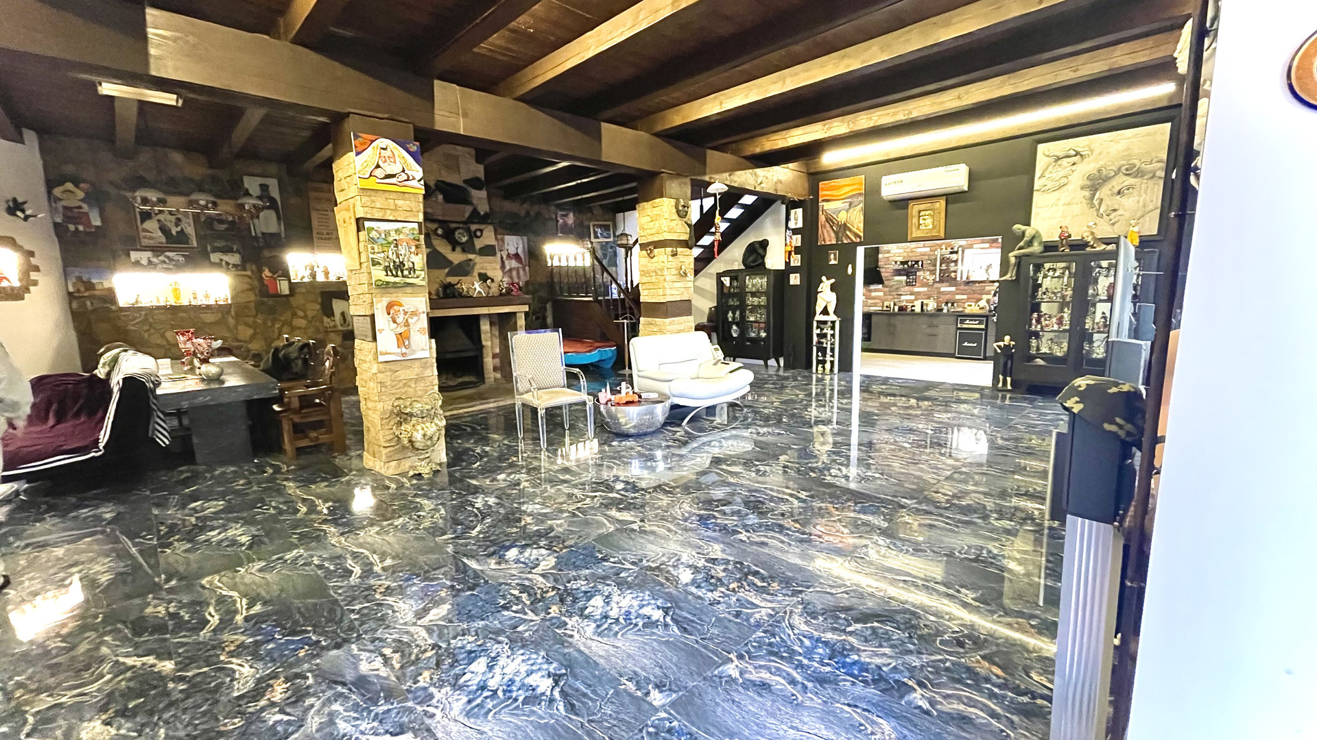 Первый этаж: просторный холл с камином, санузел, кухня.