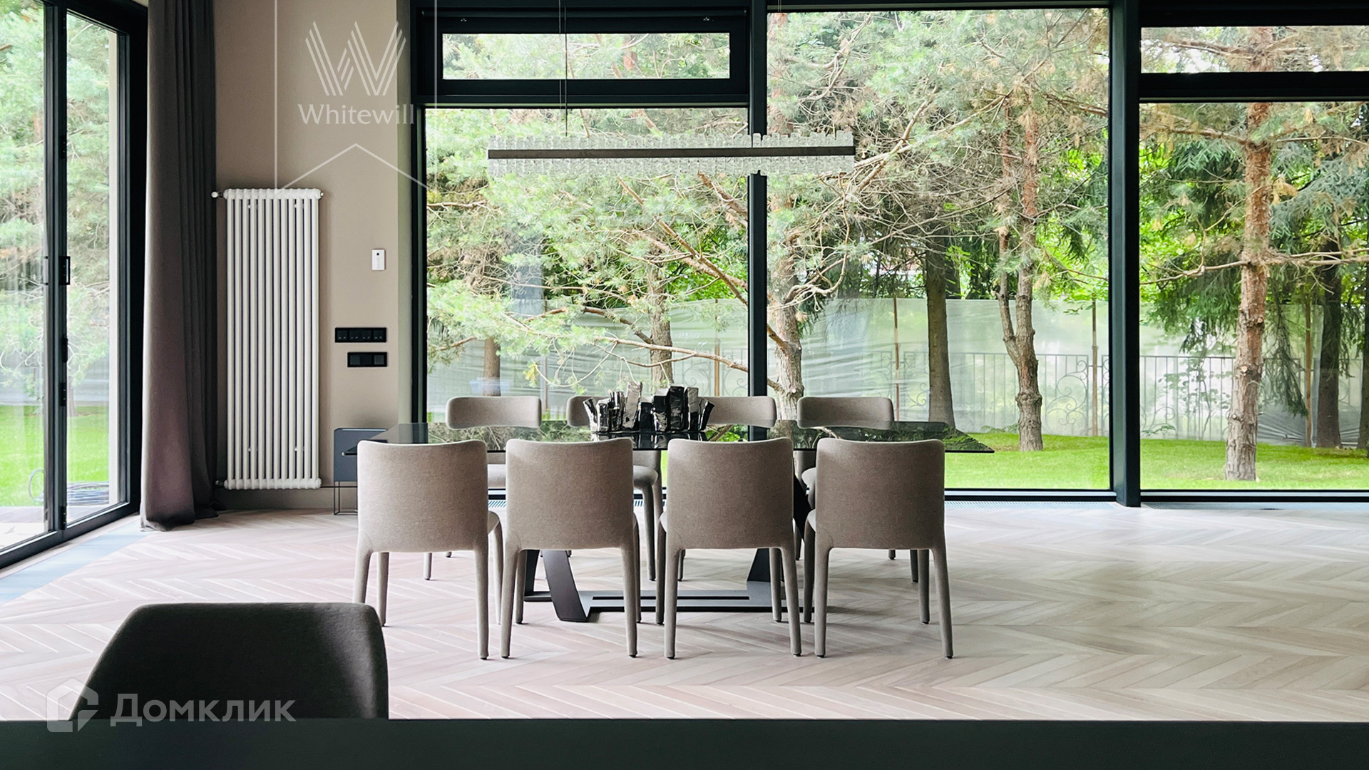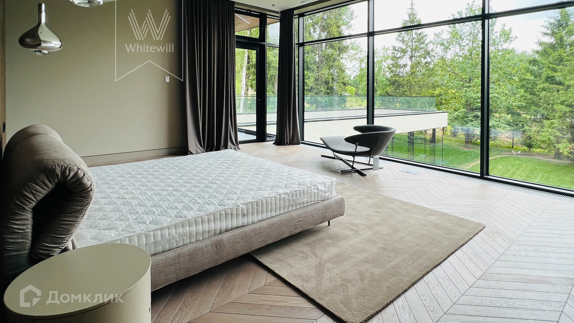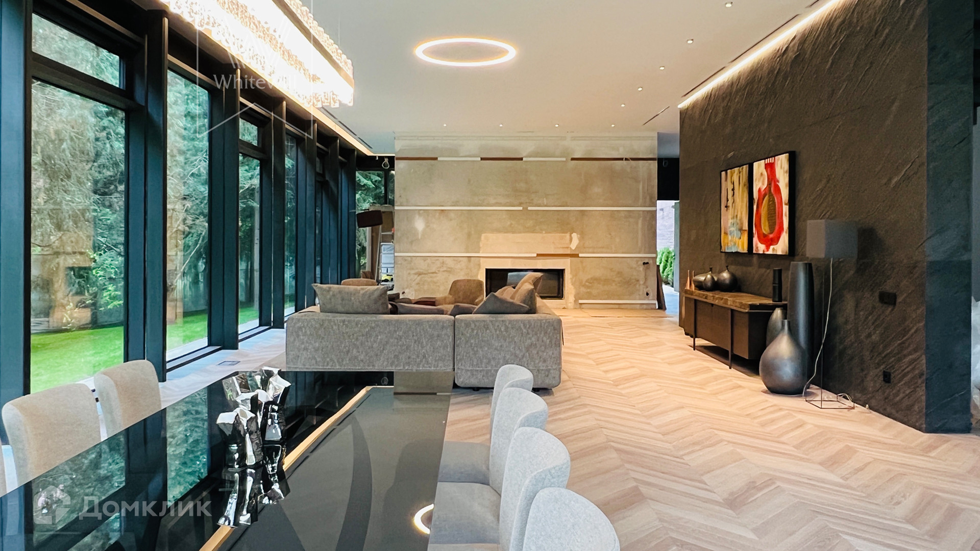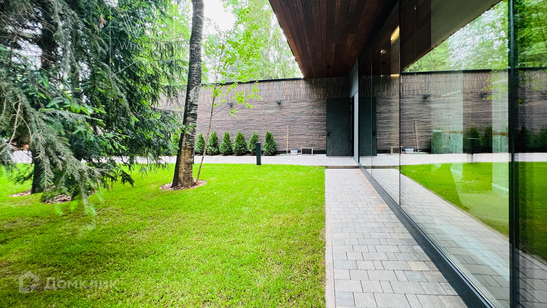 ID 10 669. Николино. Загородный дом площадью 800 м² построен на полевом участке 20 соток. Фасад выполнен в современном стиле, облицован камнем, плиткой и деревом. Коттедж представлен с отделкой «под ключ». В доме спланировали 5 спален, гостиную, кухню, столовую, SPA-зону с бассейном и сауной. Предусмотрен гараж на 2 машины и блок для персонала. На участке засеян газон, вымощены дорожки, растут многолетние деревья.