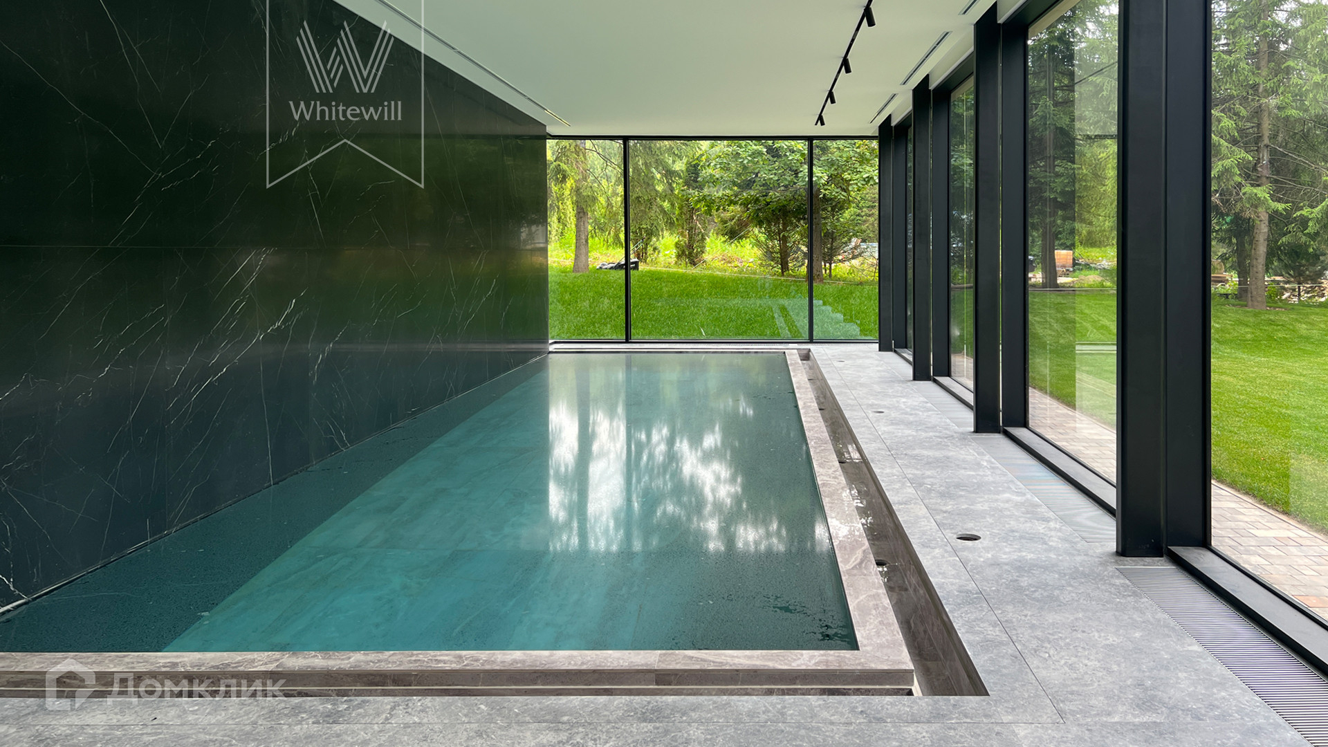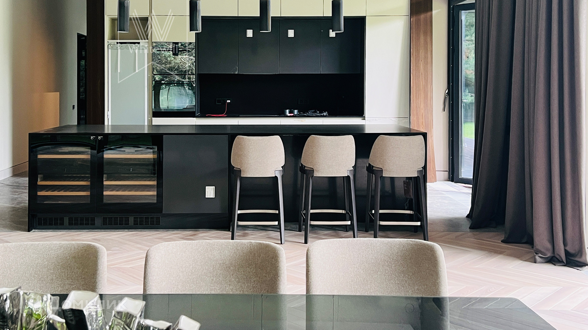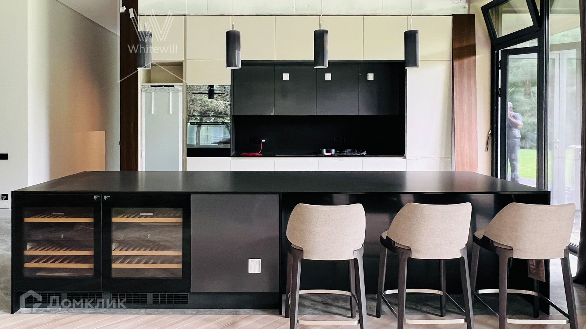 ID 10 669. Николино. Загородный дом площадью 800 м² построен на полевом участке 20 соток. Фасад выполнен в современном стиле, облицован камнем, плиткой и деревом. Коттедж представлен с отделкой «под ключ». В доме спланировали 5 спален, гостиную, кухню, столовую, SPA-зону с бассейном и сауной. Предусмотрен гараж на 2 машины и блок для персонала. На участке засеян газон, вымощены дорожки, растут многолетние деревья.