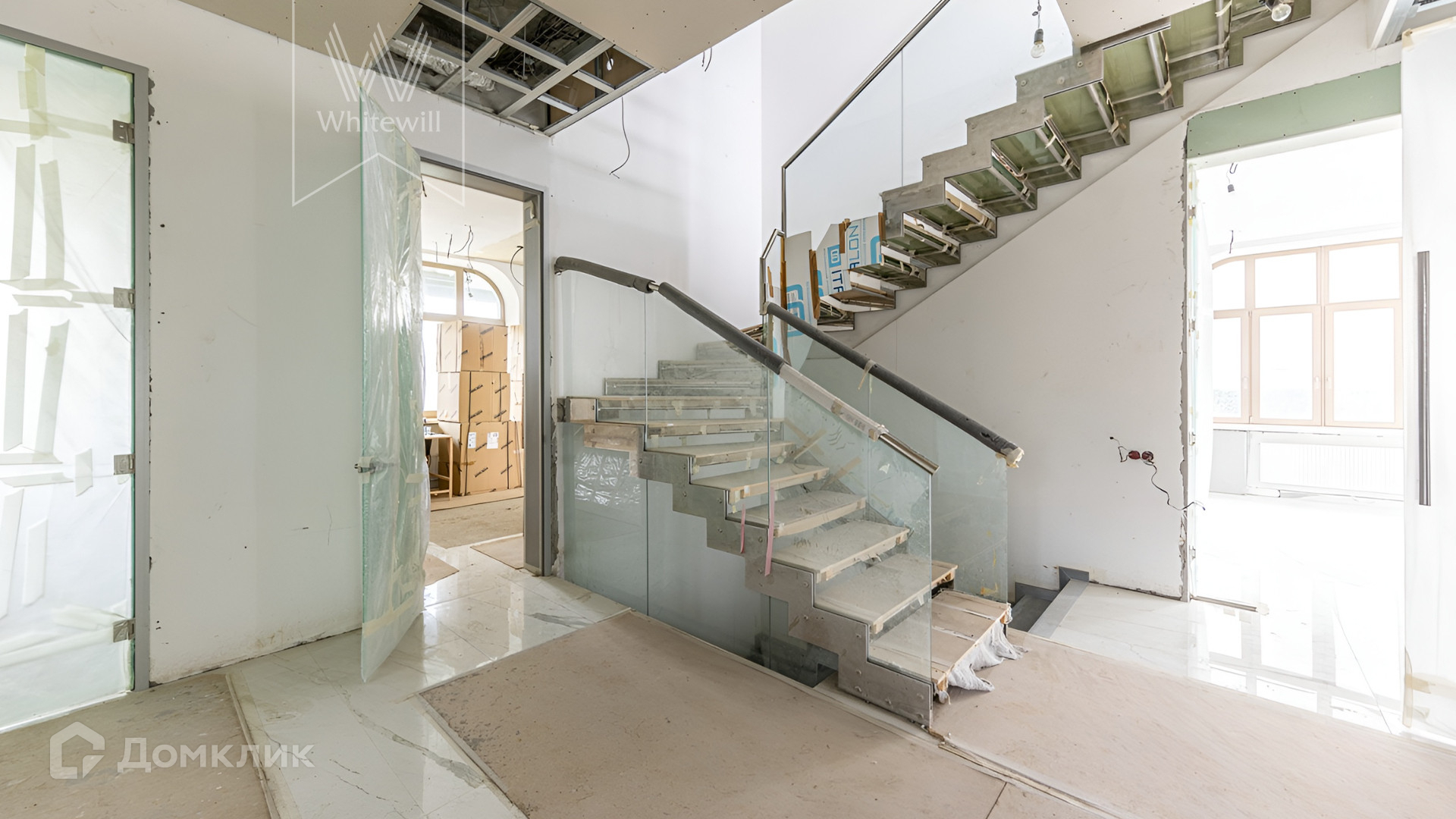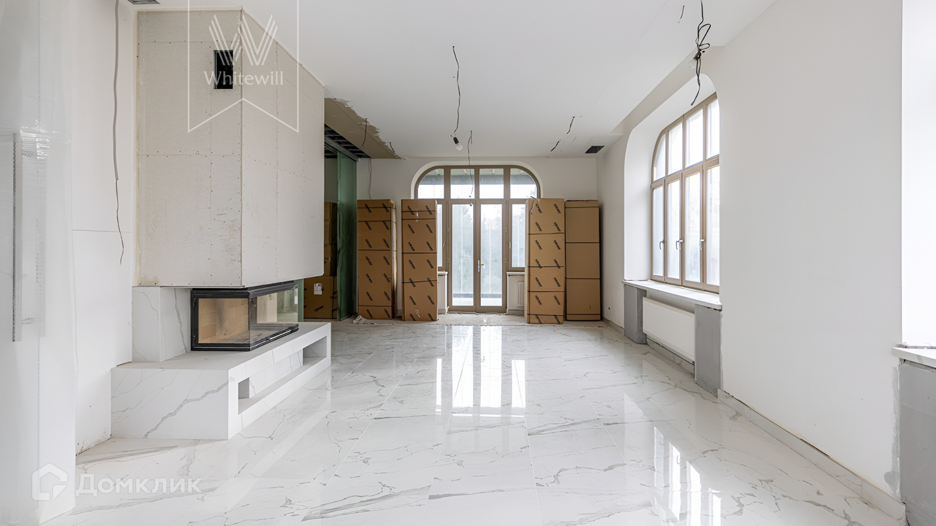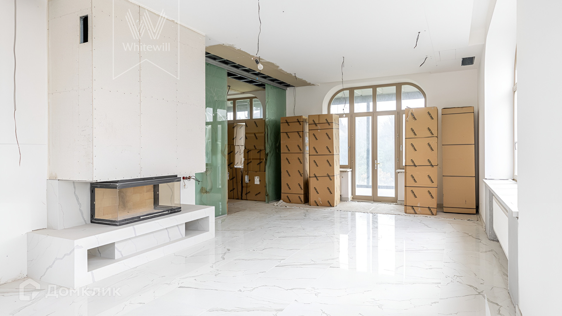 Фасад облицован натуральным камнем и украшен мозаикой. На первом этаже терраса с панорамным остеклением — окна можно полностью открыть. На первом этаже дома можно спланировать просторную кухню-гостиную с потолком от 3 метров, а на втором этаже 4-5 спален. В доме полностью проложены коммуникации, закуплена кухонная техника, сантехника, установлен минибассейн-джакузи и 2 камина без облицовки.