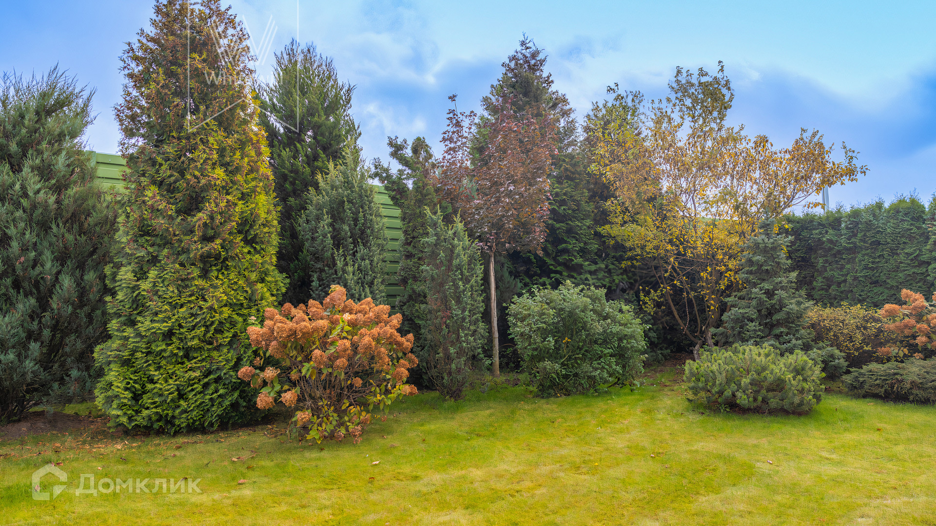 На участке выполнена двойная гидроизоляция и дренаж, посажены туи и постелен газон.