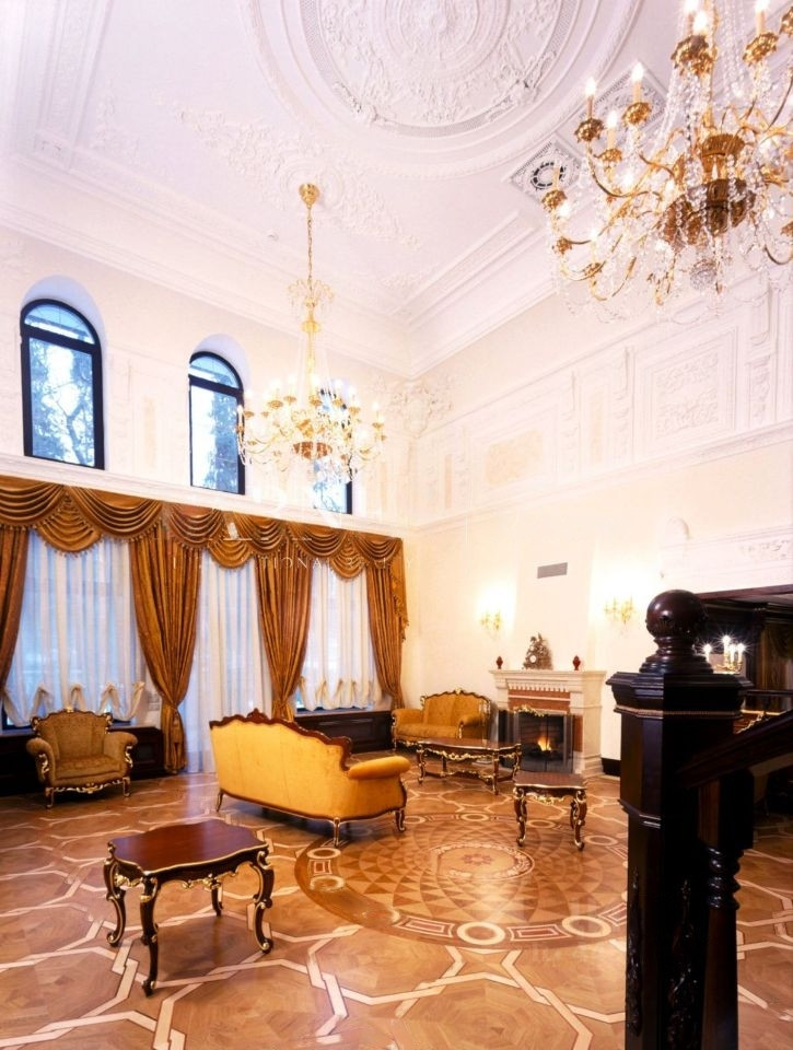 Интерьеры выполнены в классическом стиле с использованием натуральных материалов.