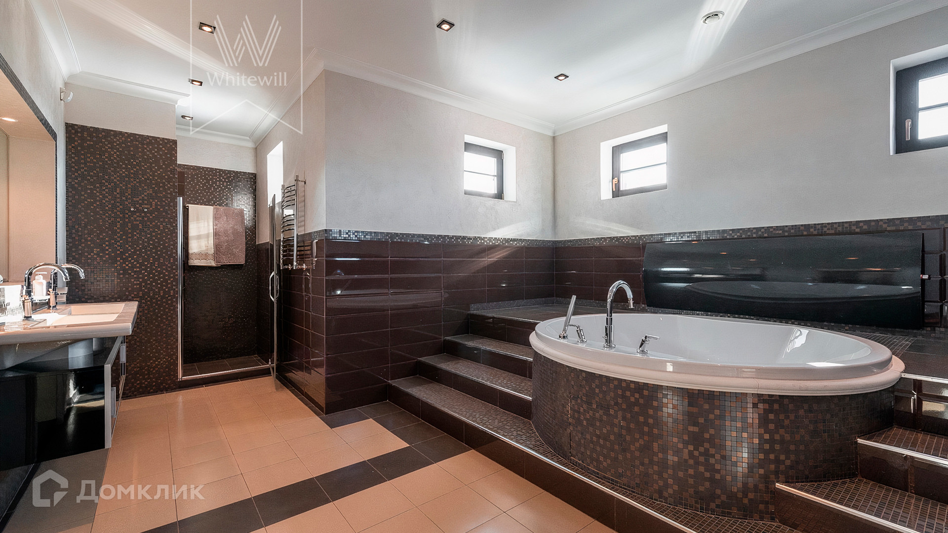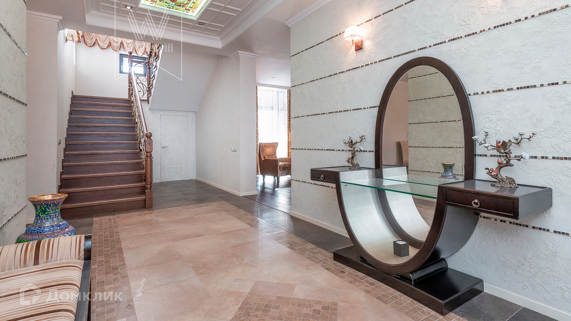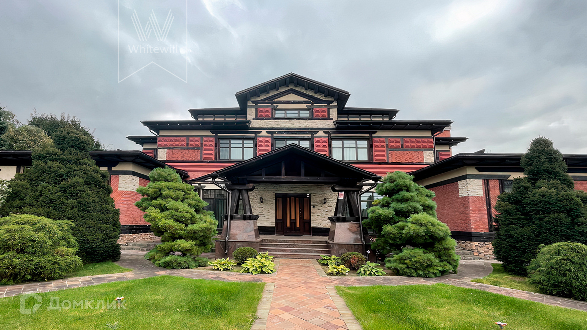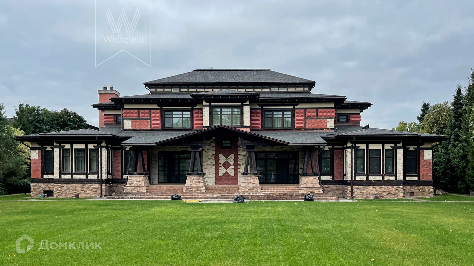 ID 10 608. Николино. Просторный дом площадью 528 м² построен на прилесном участке 32 сотки. Фасад облицован бежевой штукатуркой и клинкерной плиткой, декорирован красными вставками и темными балками. В оформлении преобладают молочно-кофейные цвета. Здесь разместили гостиную с камином, столовую, кухню, кабинет, террасу и гараж на 2 машины. На участке выполнен ландшафтный дизайн, вымощены дорожки, высажены хвойные деревья.