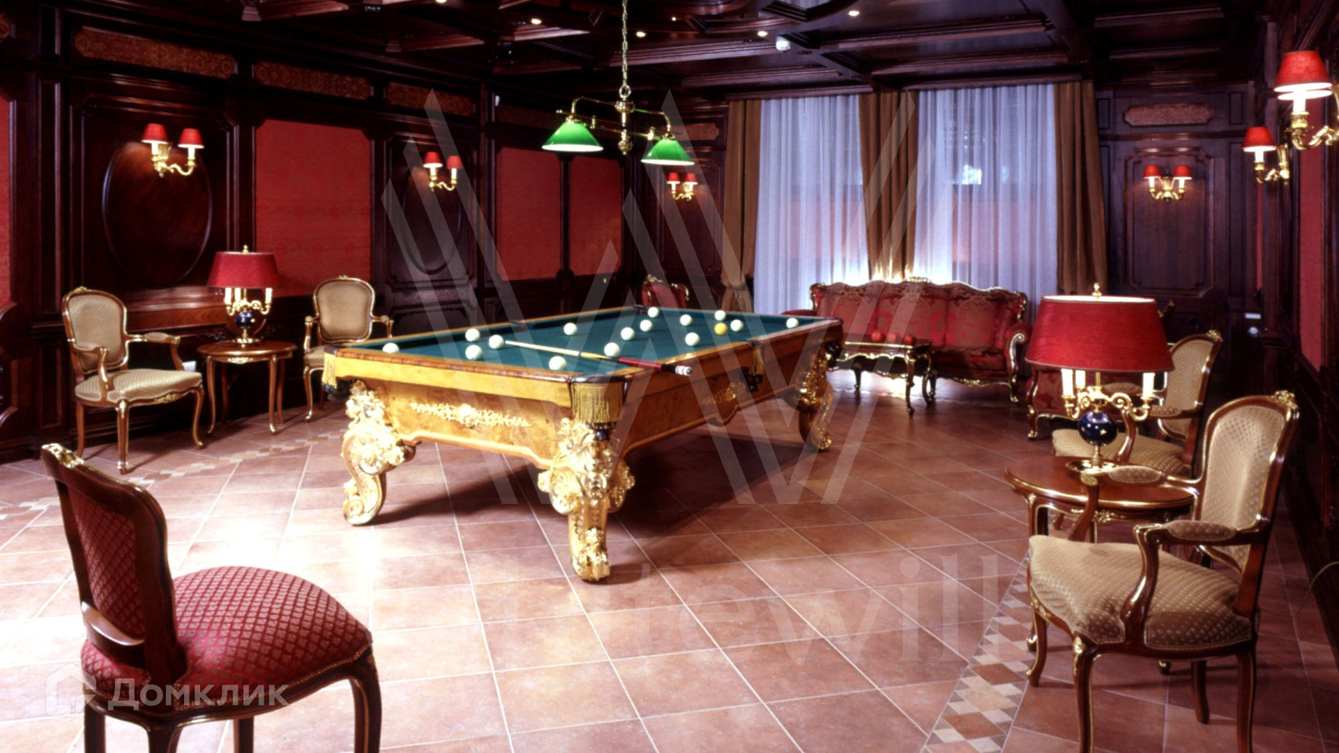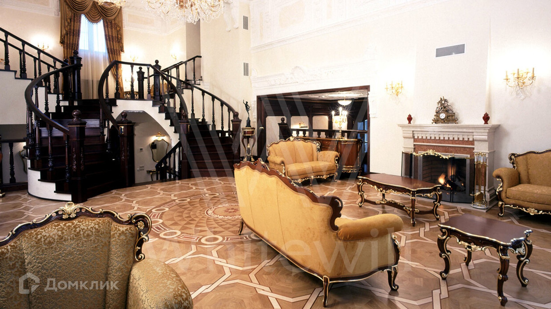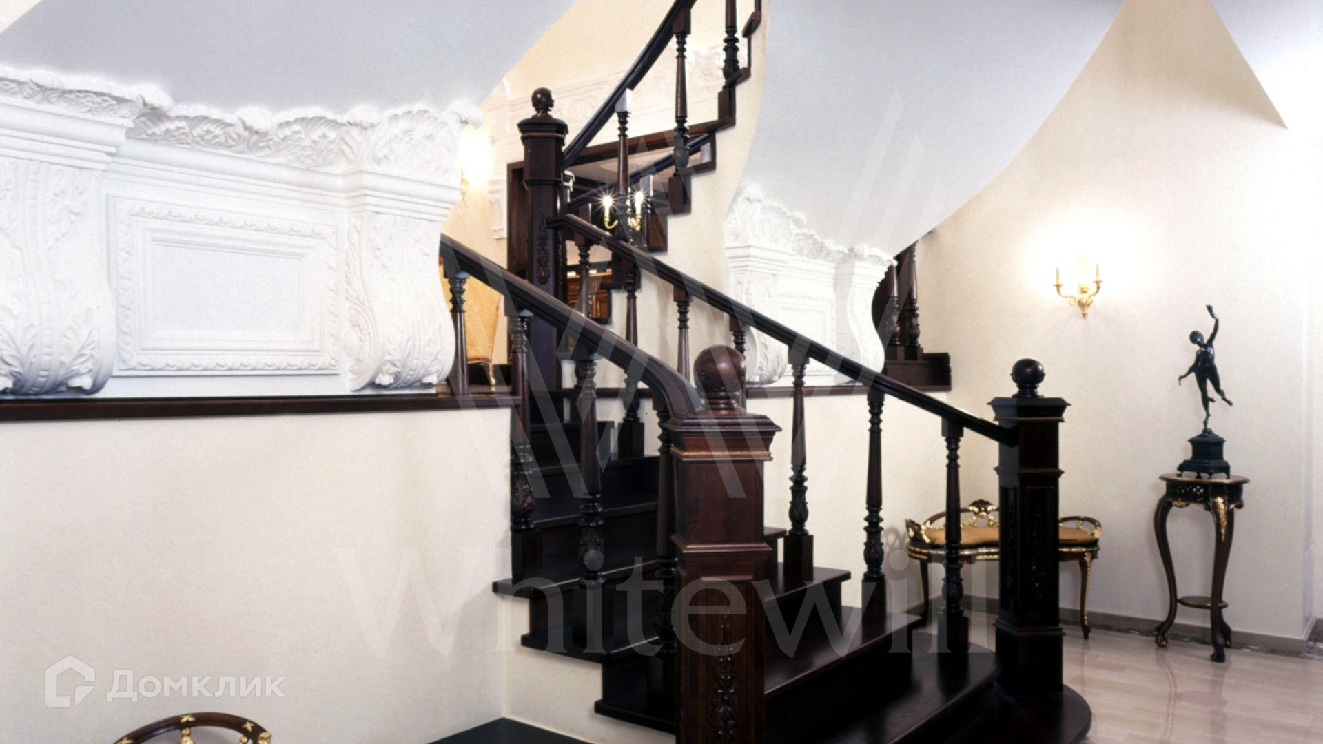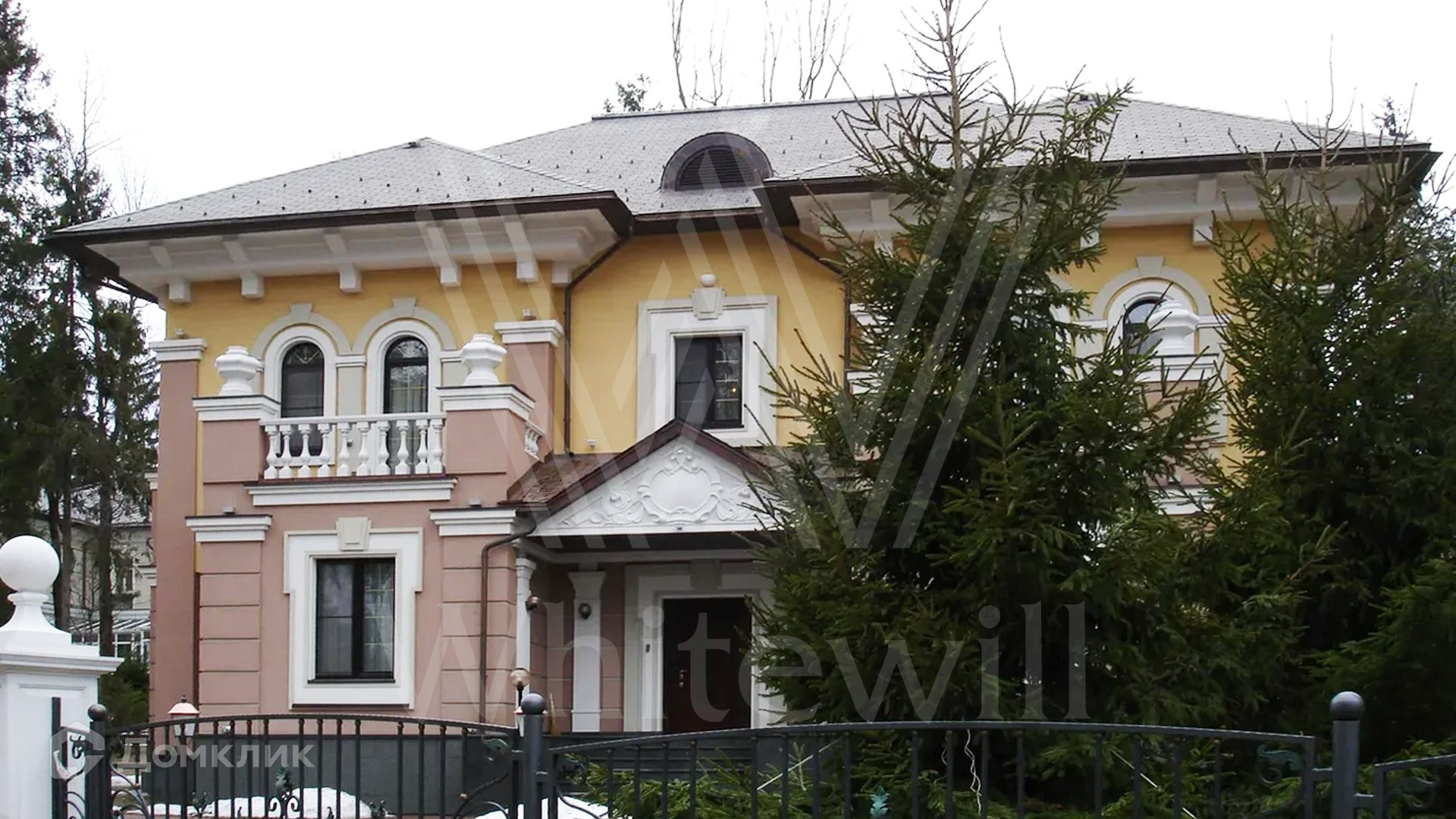 ID 9 223. Николино. Резиденция площадью 538 м² и гараж для 2-х машин с квартирой для персонала расположены на участке 29,9 соток. Фасад главного дома выполнен в неоклассическом стиле — его украшает балюстрада, изящная лепнина и массивный карниз. Интерьер выдержан в классическом стиле — на первом этаже просторная парадная гостиная с камином и вторым светом. На полу наборный паркет, мягкая мебель из ценного дерева украшена позолотой. В доме спланирован кабинет, бильярдная и 3 спальни с изящной резной мебелью.