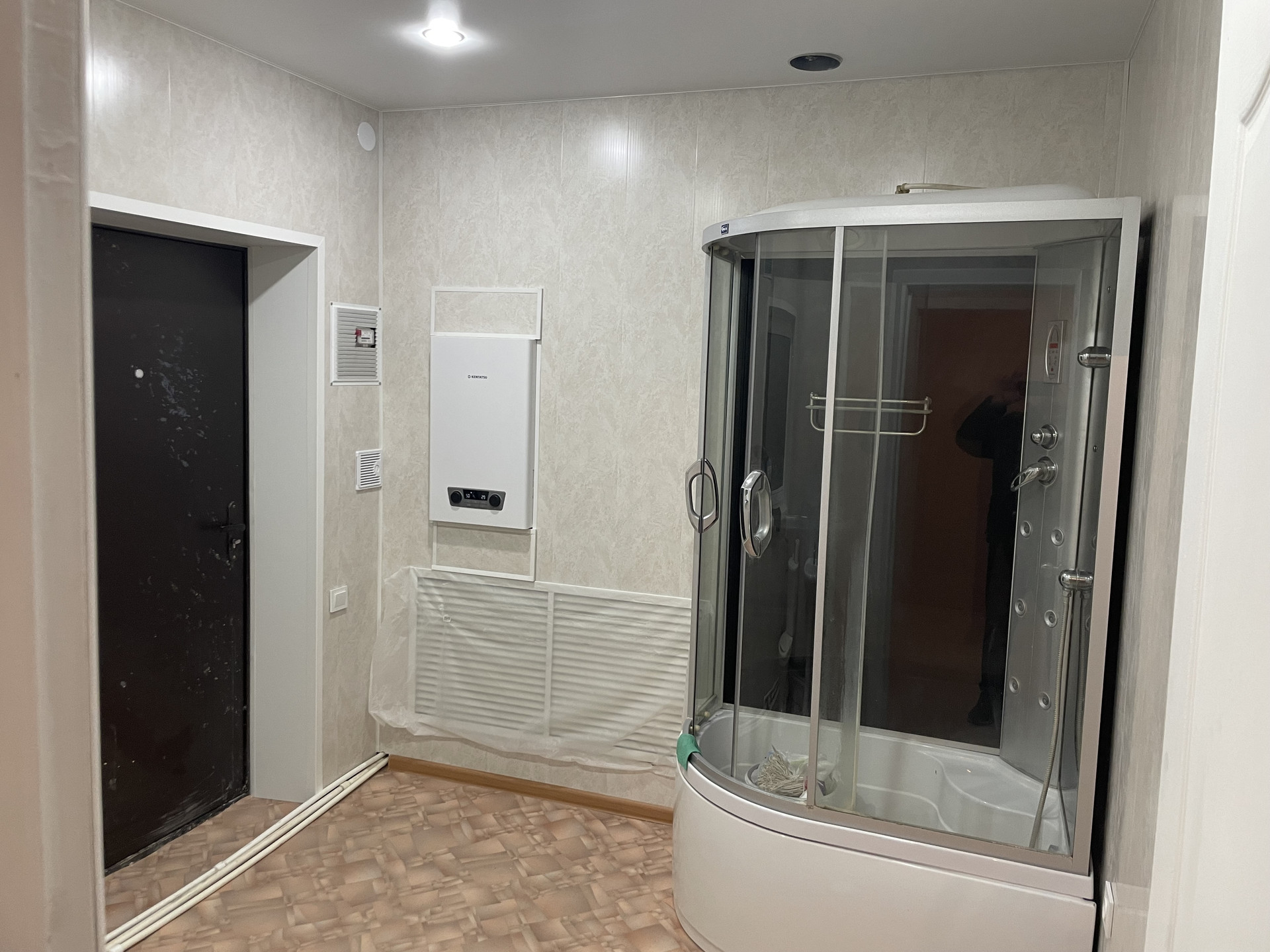 Продается дом площадью 76,3 м.кв., кухня, 3 жилые комнаты, котельная, большая прихожая, гараж 9*4, сарай 3*4. Электричество 380В, 15 кВт, канализация, водопровод, газ котел настенный двухконтурный с ГВС, теплые полы по всему дому. Стены готовы под поклейку обоев, полы предчистовая отделка, натяжные потолки , санузел - отделка стеновые панели ПВХ, линолеум, установлены унитаз, раковина, душевая кабинка.