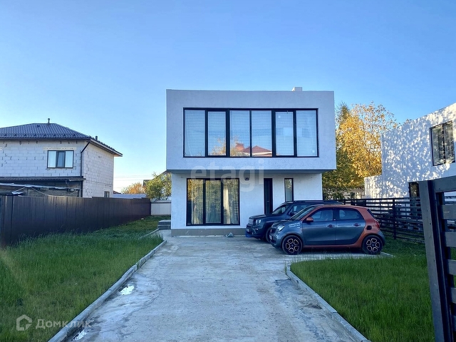 Монолитный фундамент, стены, монолитные перекрытия и отделка фасада (штукатурка и окраска), кровля плоская утепленная с гидроизоляцией, витражные окна в пол, входная дверь, забор (деревянный).