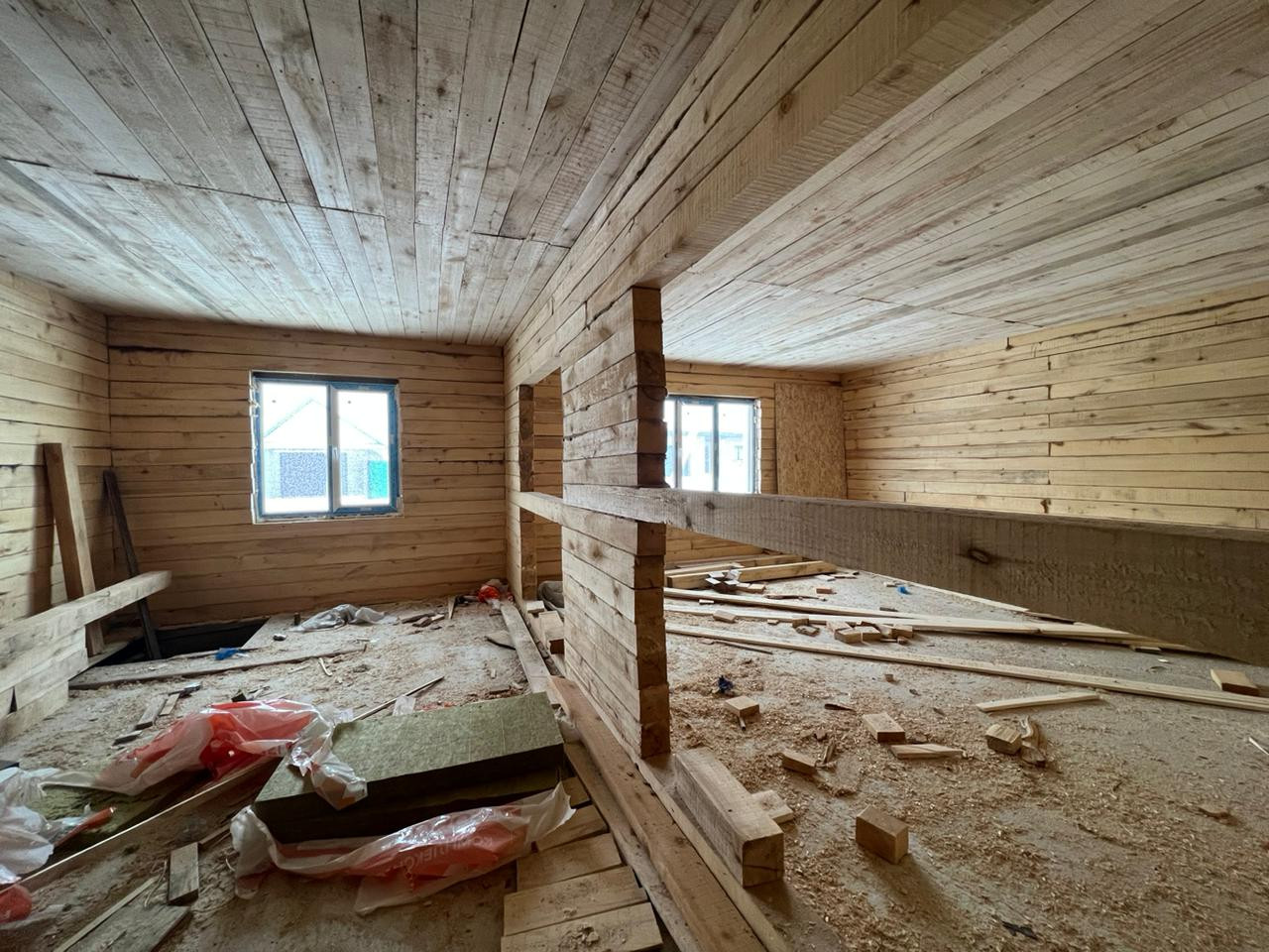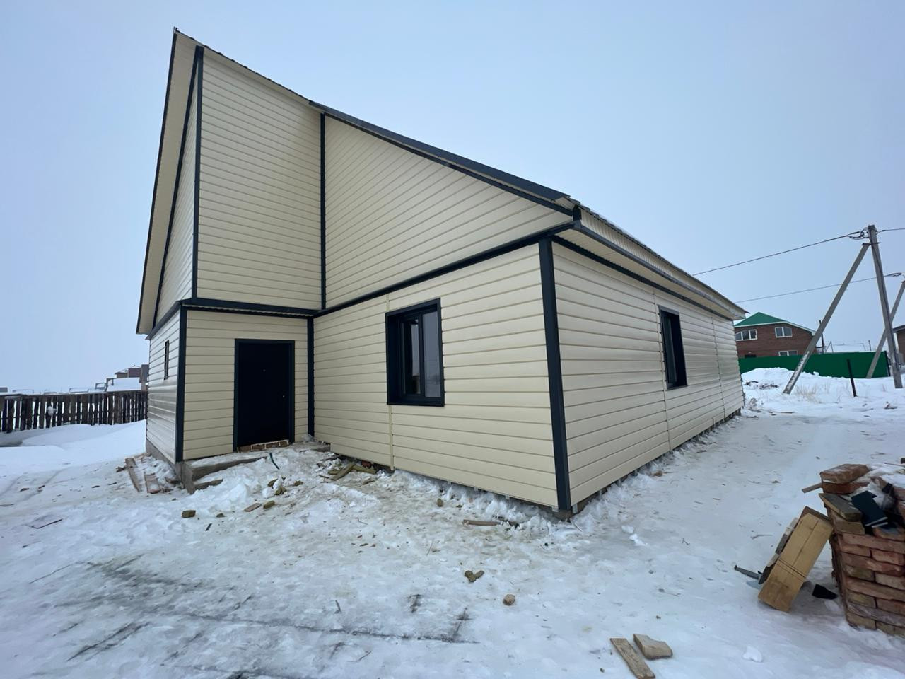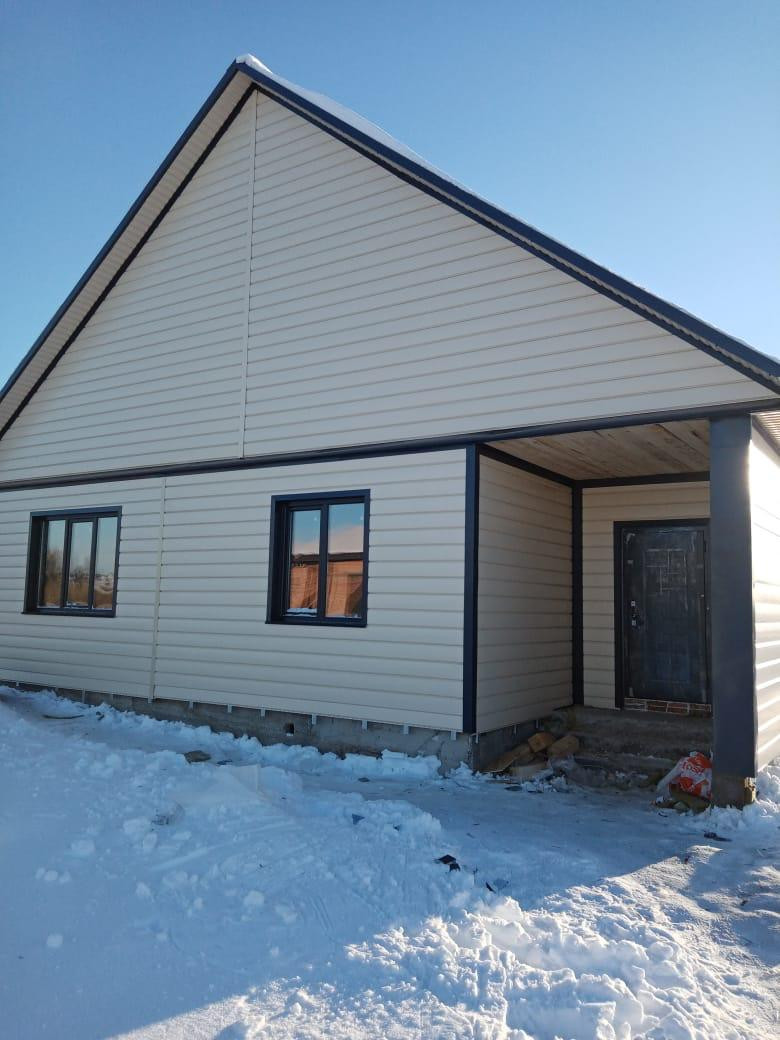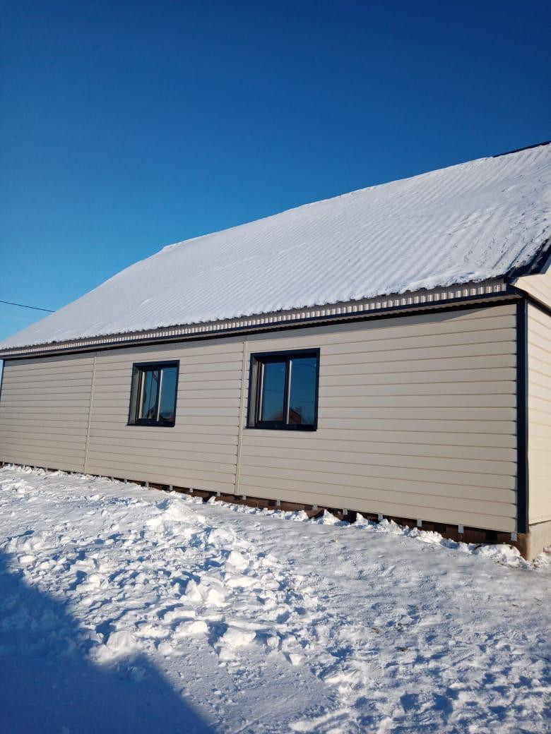 Дом из бруса 12*12,5 м; обшитый металлосайдингом и утепленный (технониколь 100 мм и 50 мм); фундамент свайно, ленточный; окна пластиковые, тройное остекление, ламинированные, установлена противо взломная система; полы стяжка под теплый пол; вода в доме скважина 9 м (второй забор); канализация септик (три кольца); крыша профнастил (цвет графит).