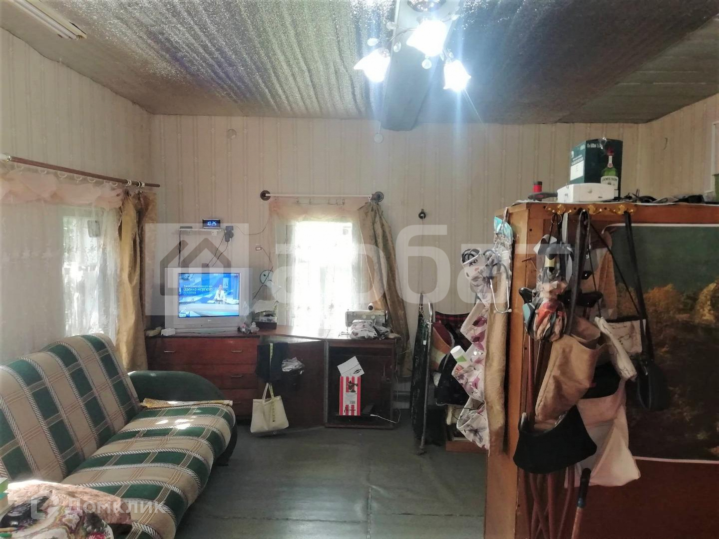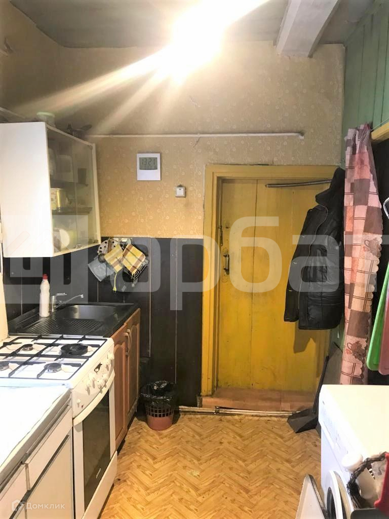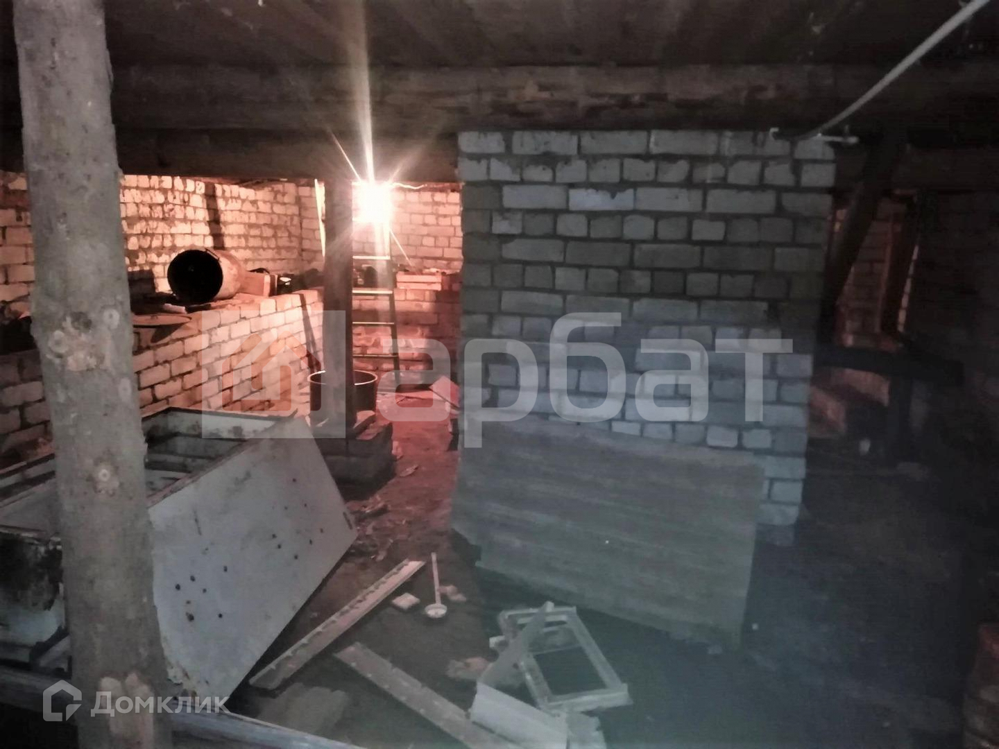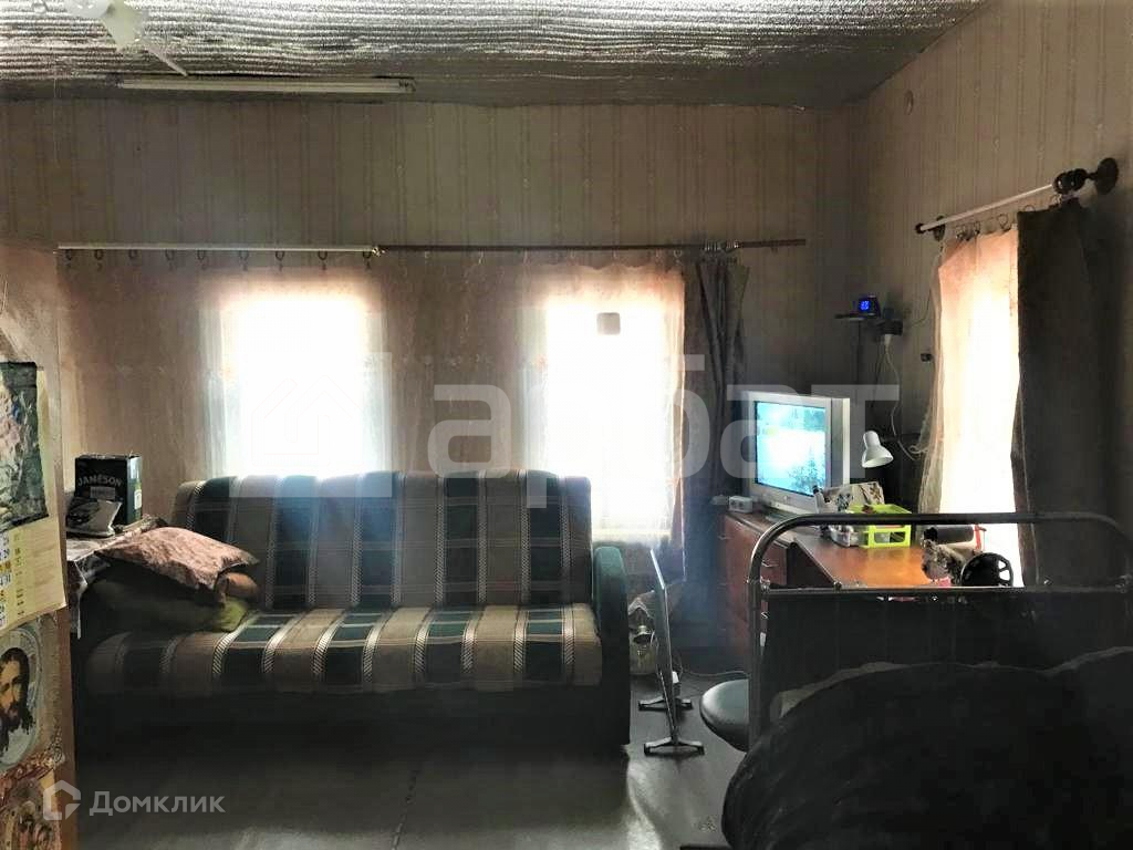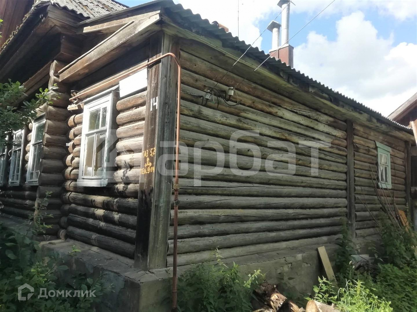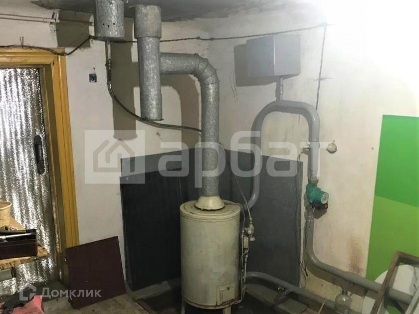 Построен из бревна, с оштукатуренными внутри стенами, - зимой тепло, летом прохладно. Высокий сруб, высота потолков 2.7. Имеется русская печь.