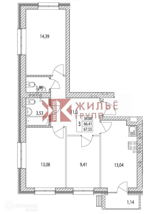Общая площадь 67.55 м2