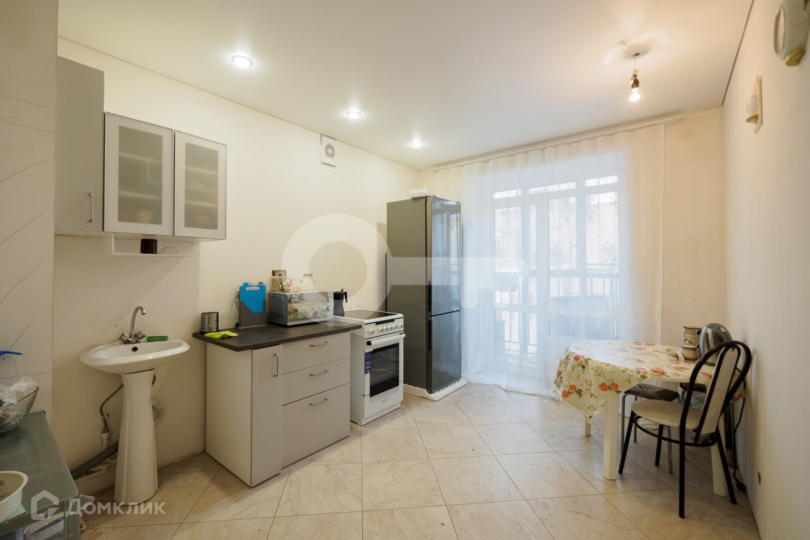 Прекрасная планировка: большая кухня с выходом на обшитую лоджию с продуманным освещением и уютная комната.