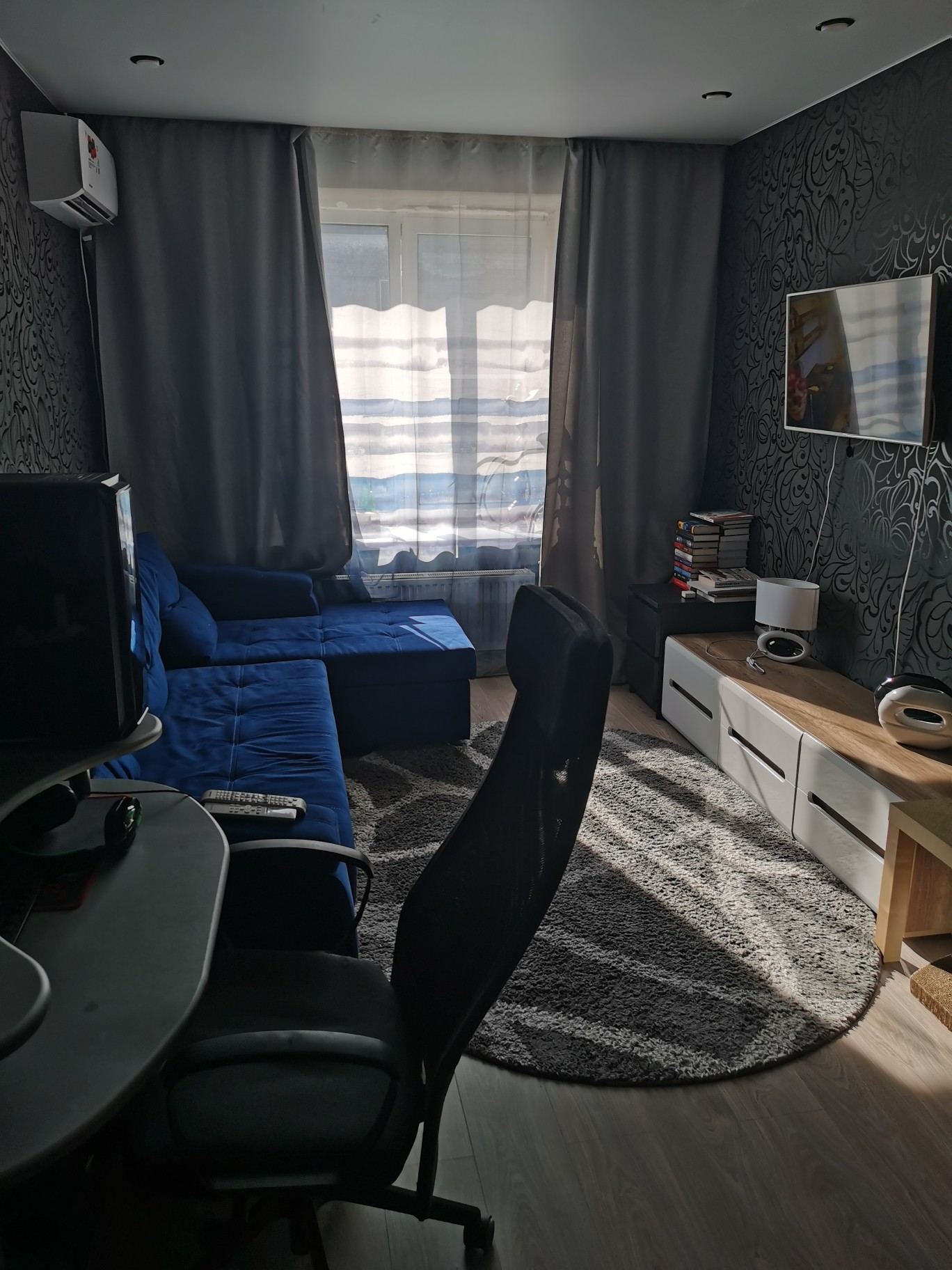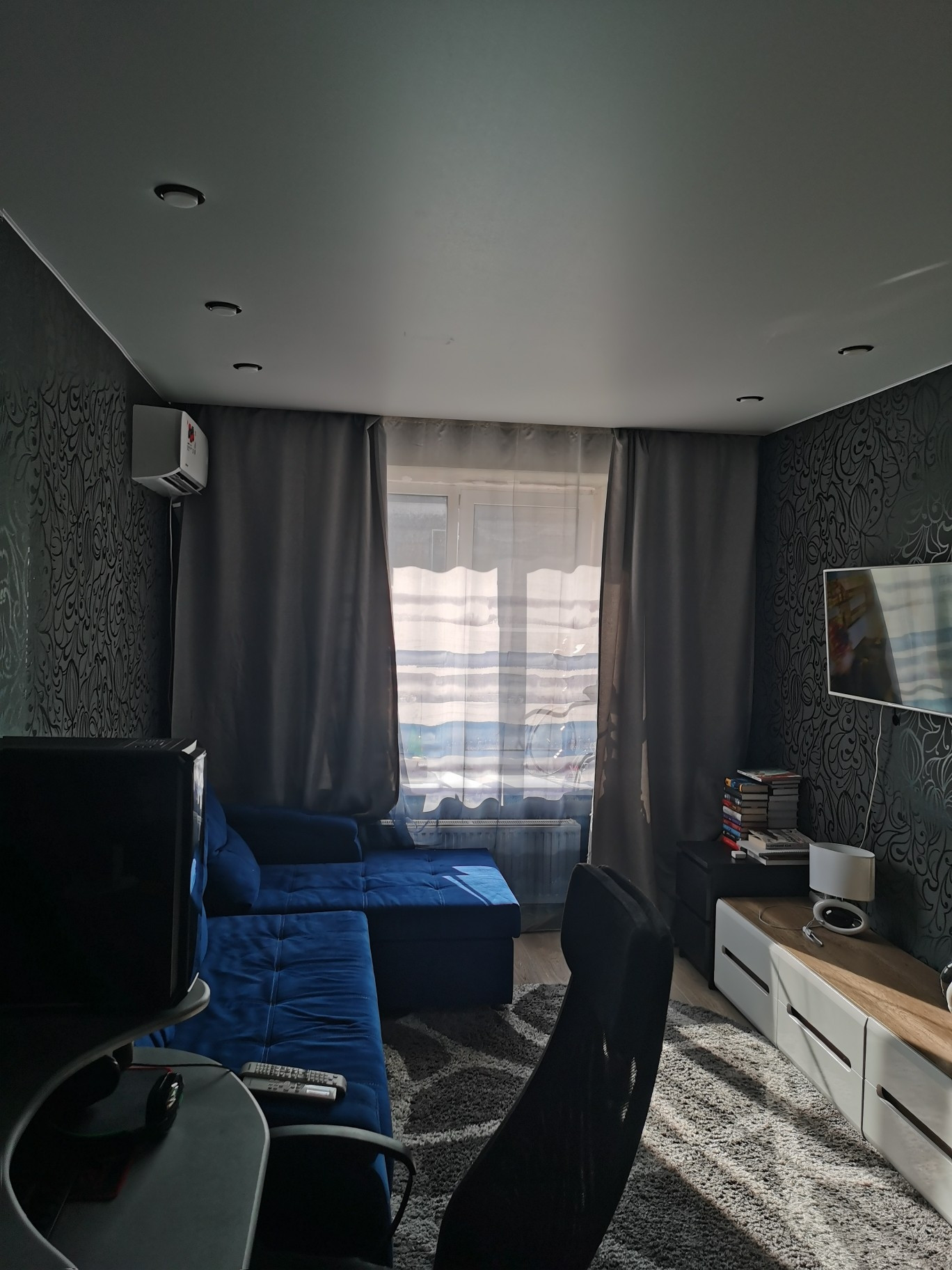 В квартире выполнен качественный современный ремонт, сан.узел в плитке, на полу в зале качественный ламинат, натяжные потолки, имеется кондиционер, балкон остеклен, пол из плитки на кухне и в прихожей.
