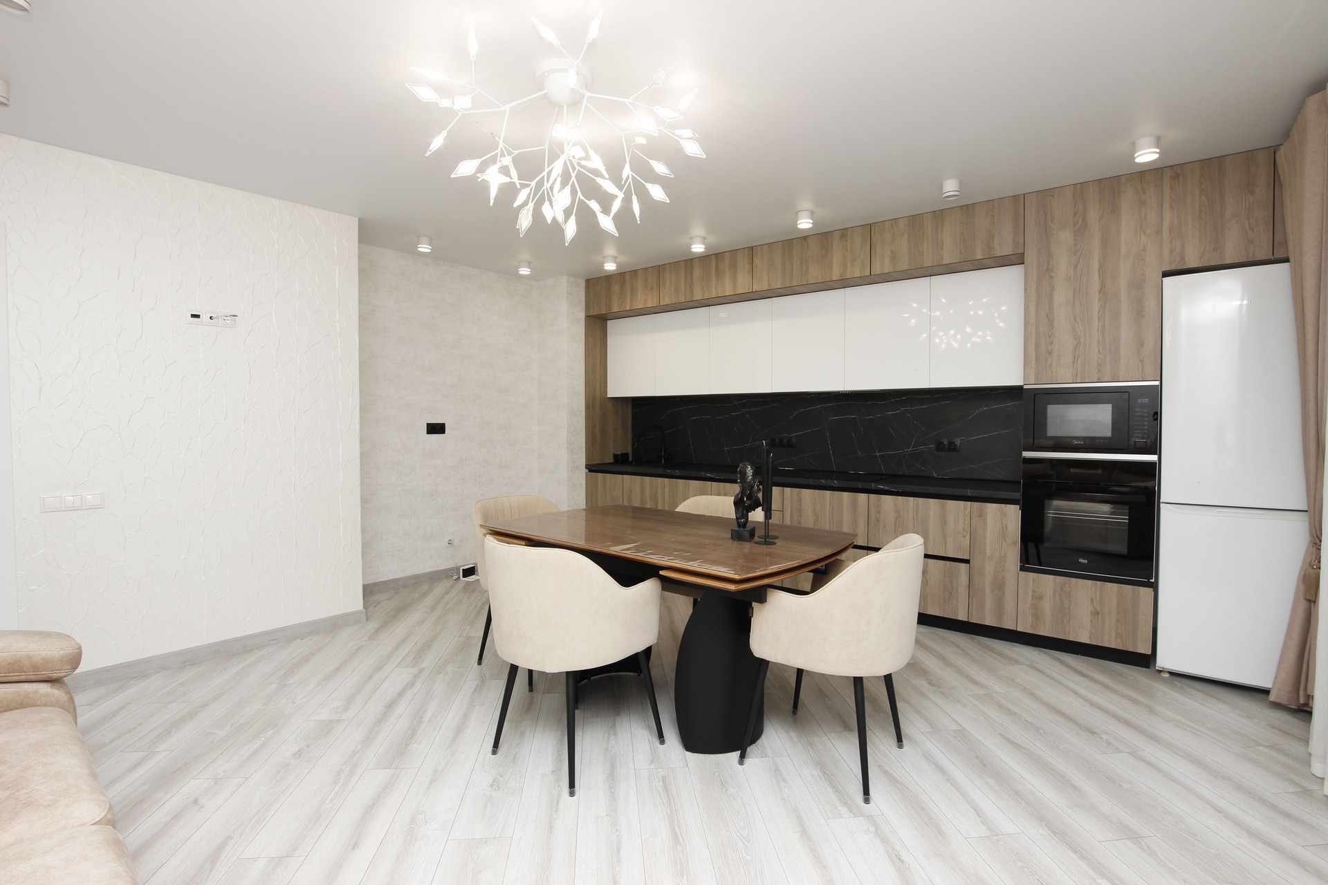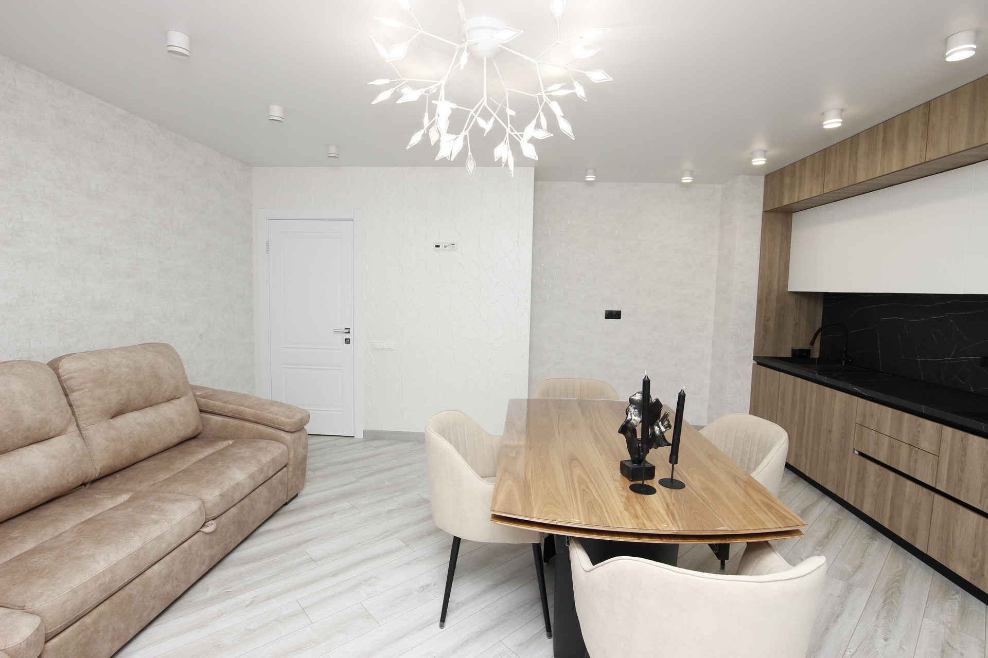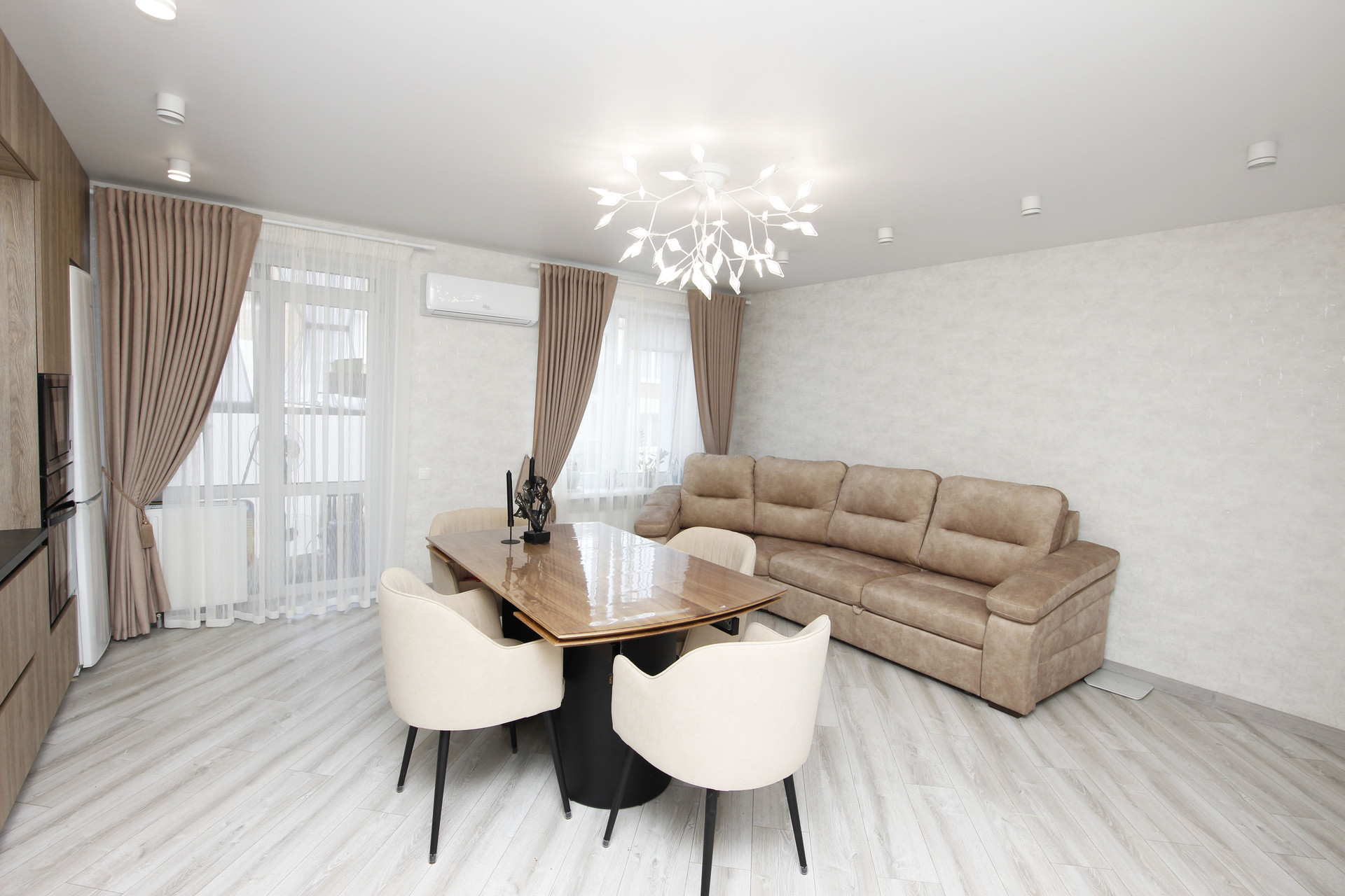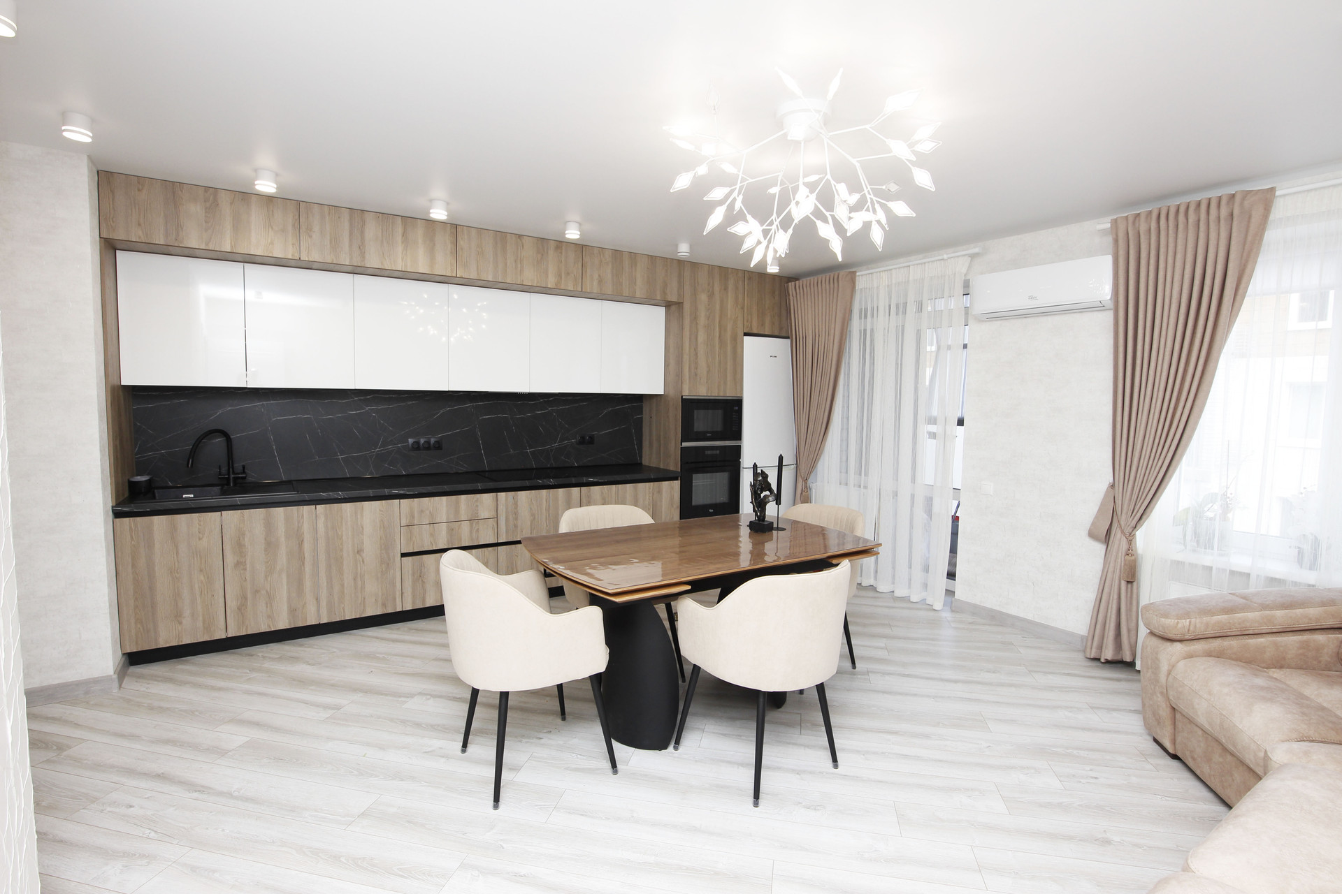 За счет того, что кухню и зал объединили получилась огромная комфортная кухня 22м2. О такой кухне мечтает каждый. С нее и выход на балкон, где организовано пространство и