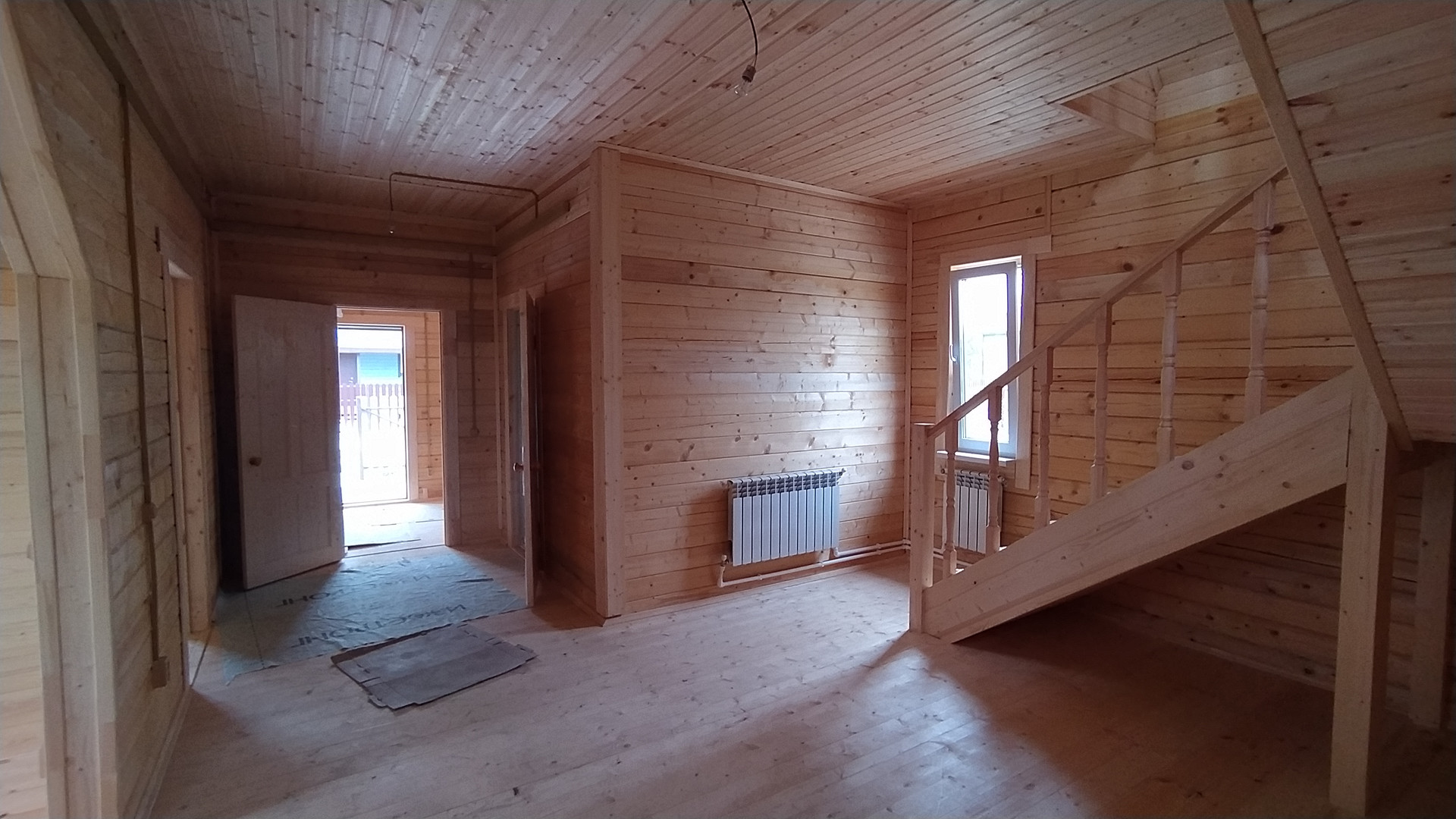 - Металлическая входная дверь, деревянные межкомнатные двери, пластиковые окна, лестница на второй этаж.