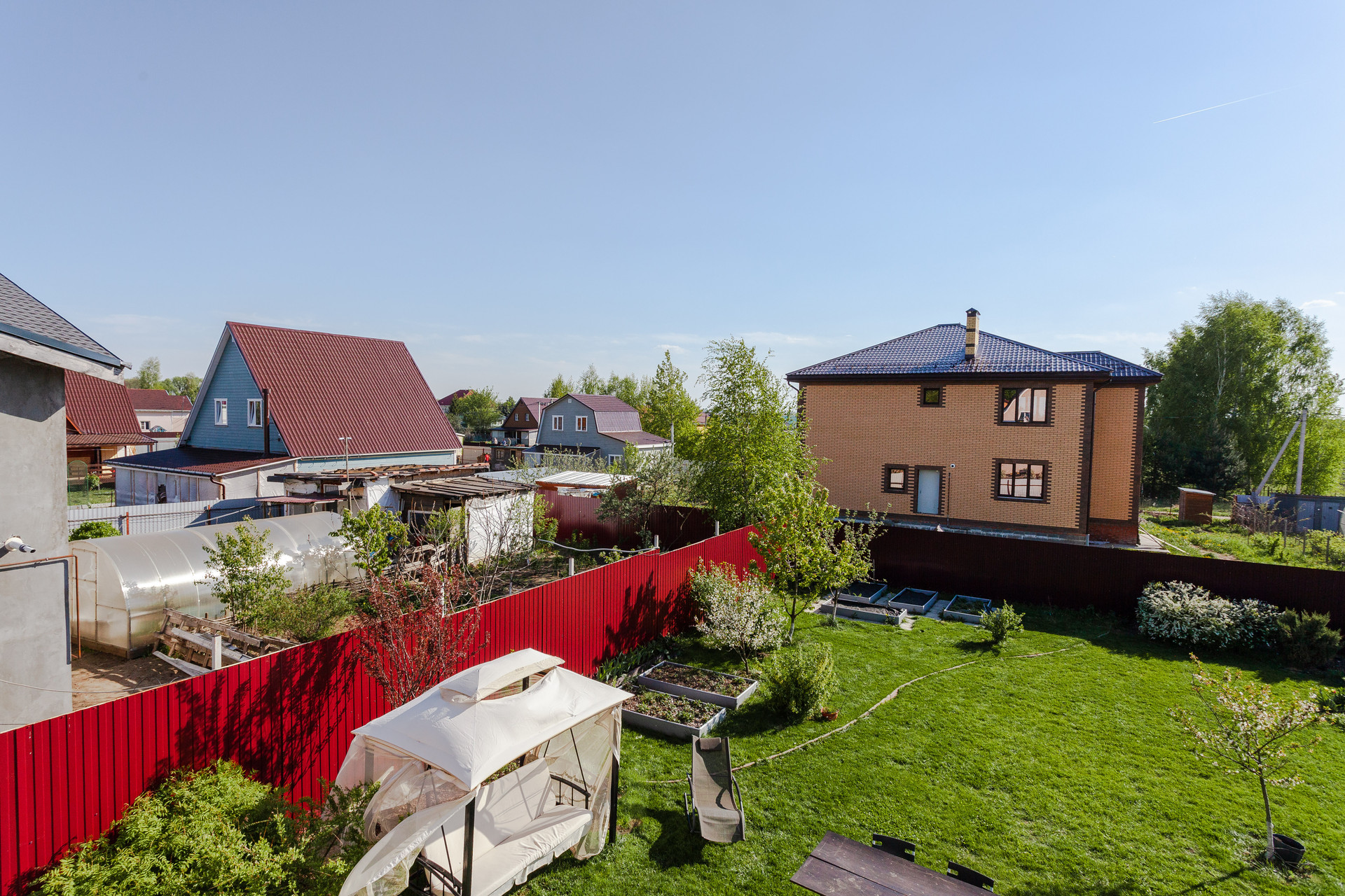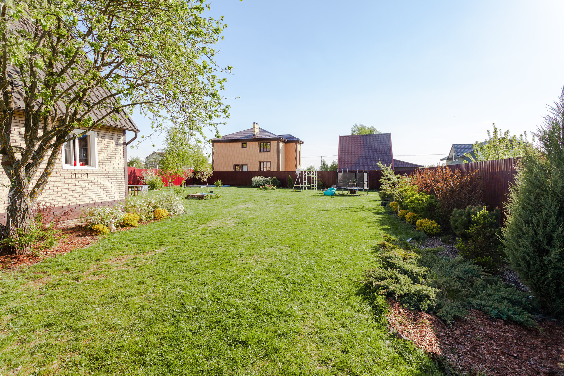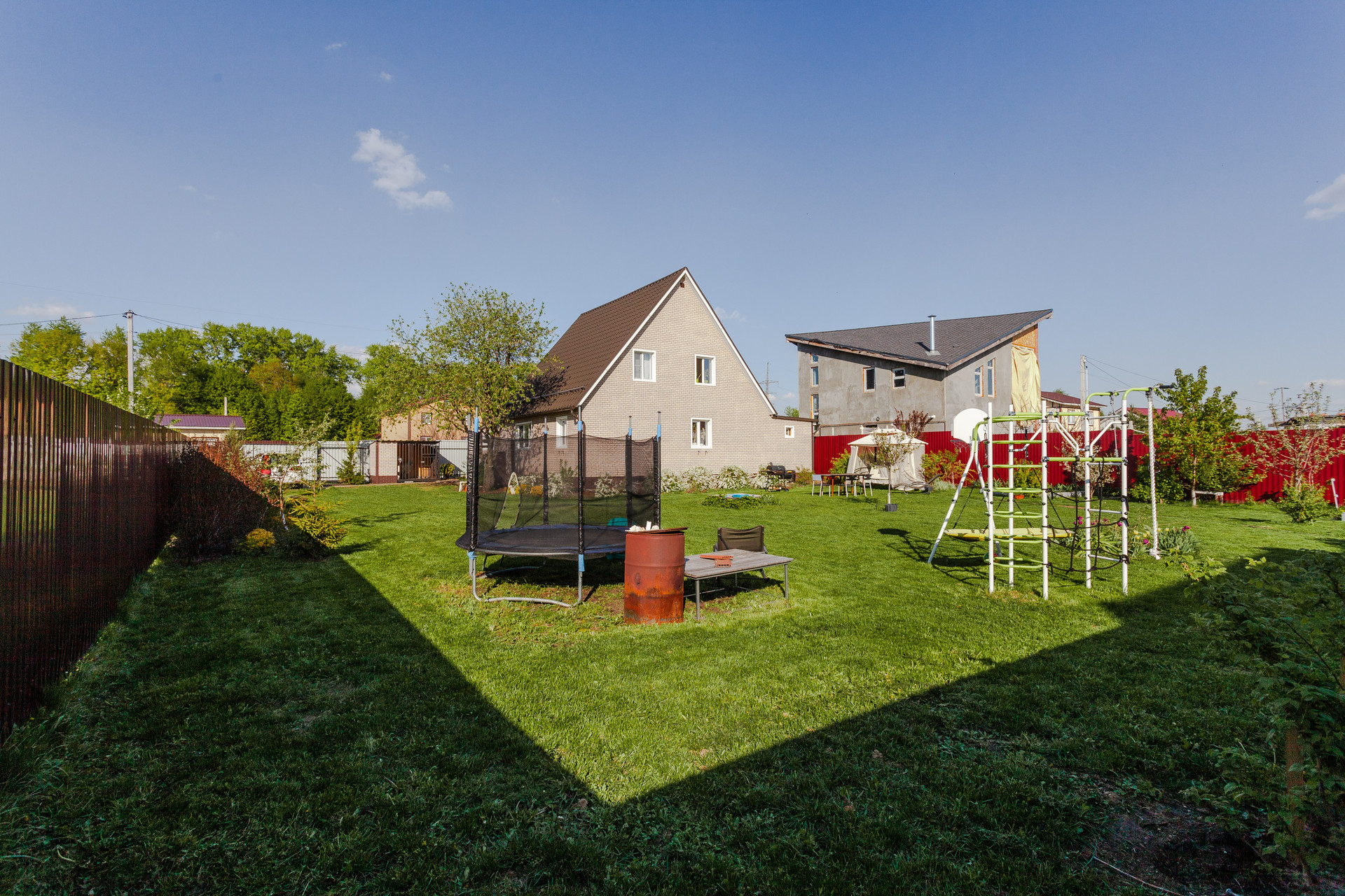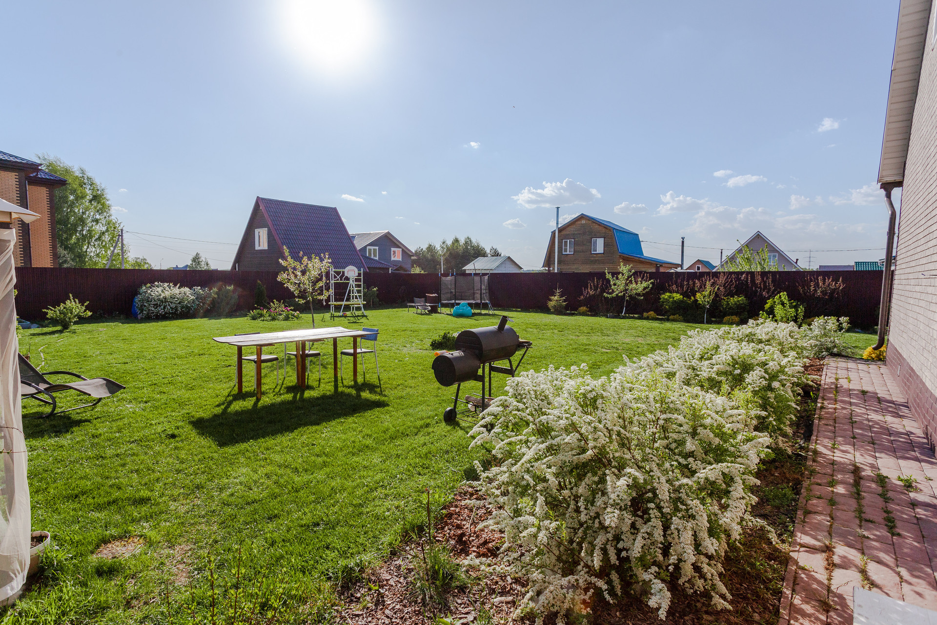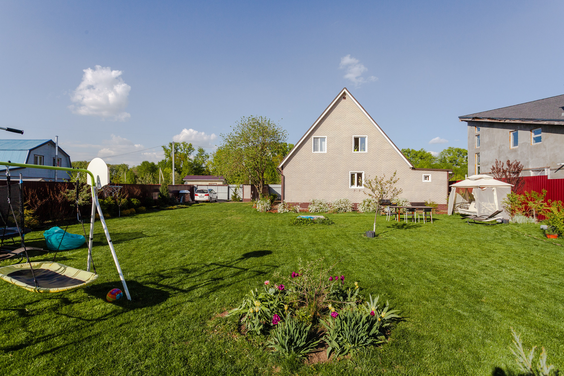 Дом располагается на участке ИЖС 10 соток. Участок правильной прямоугольной формы, ровный, дополнительно поднимался насыпным чернозёмном. На территории организованы сад с плодово-ягодными деревьями и кустарниками, насыпные грядки, декоративные Цветы, кустарники и деревья, зона барбекю, газон.