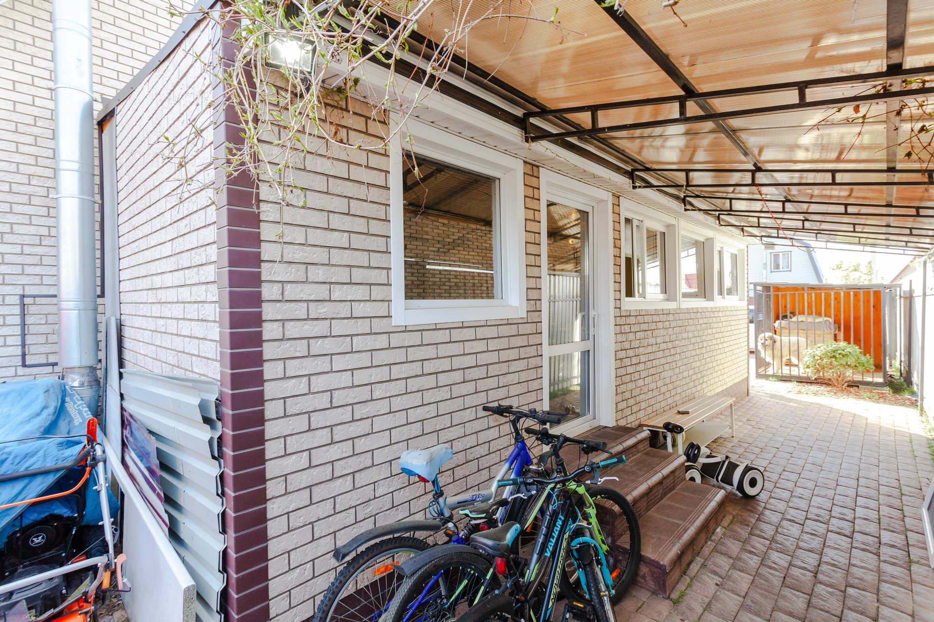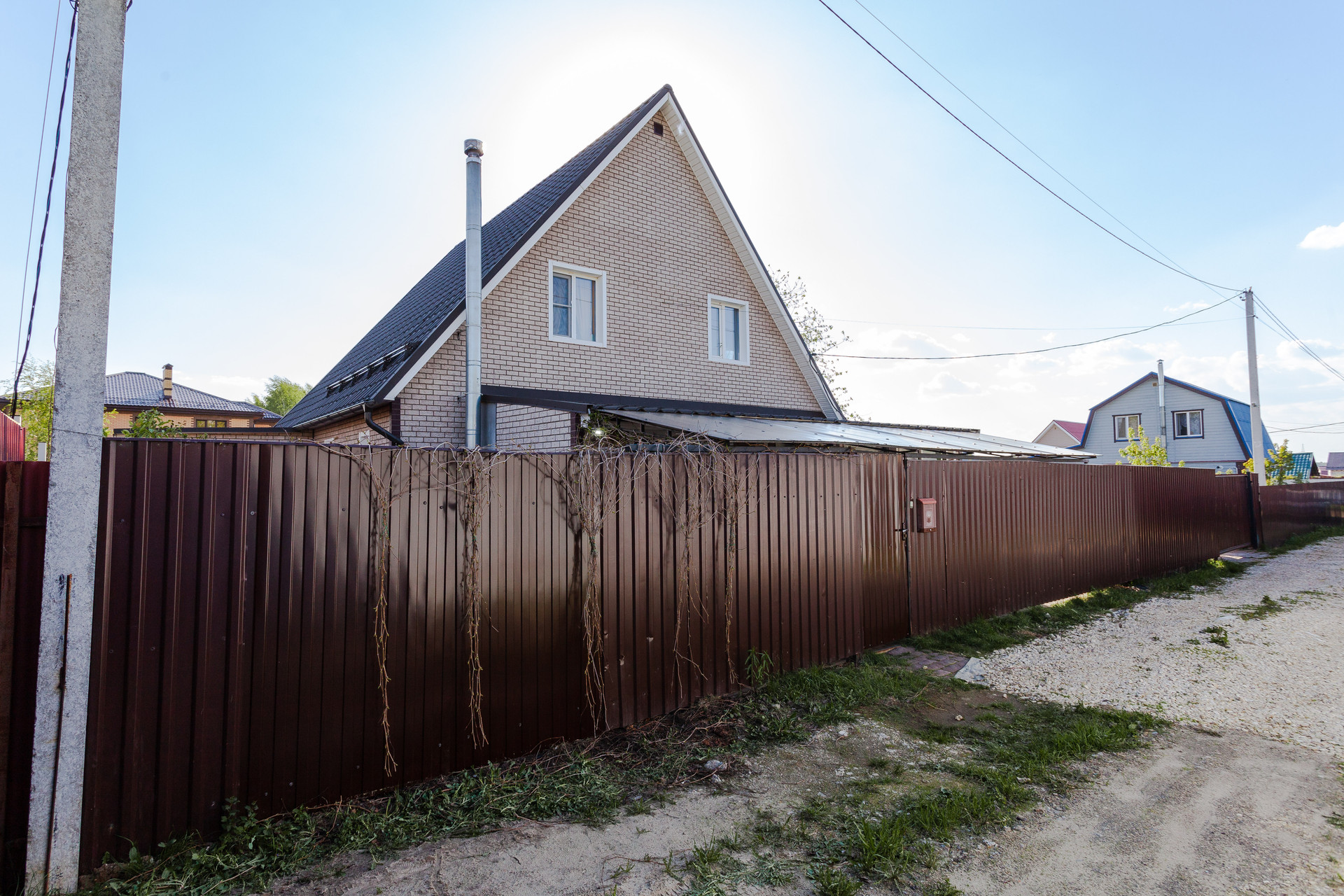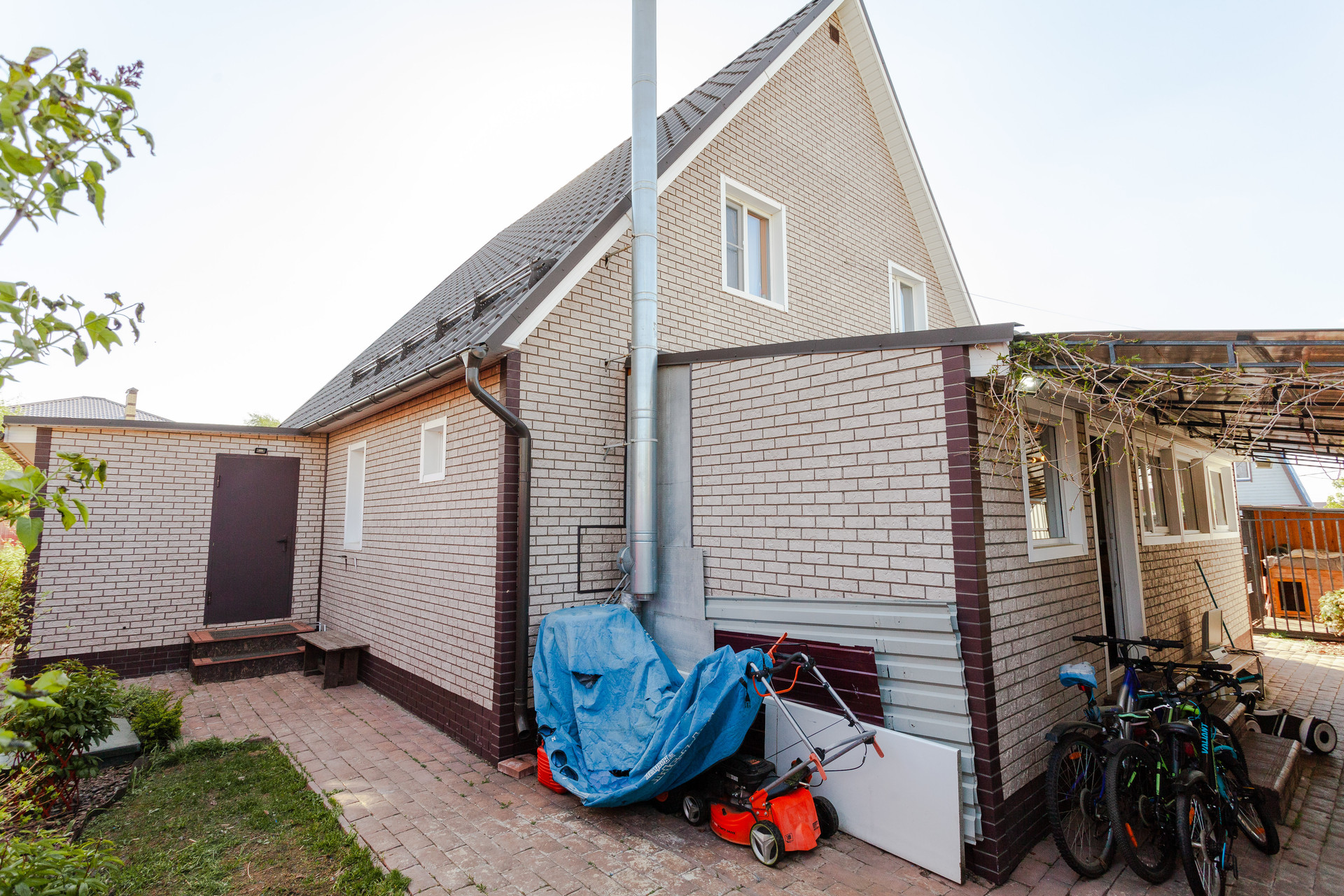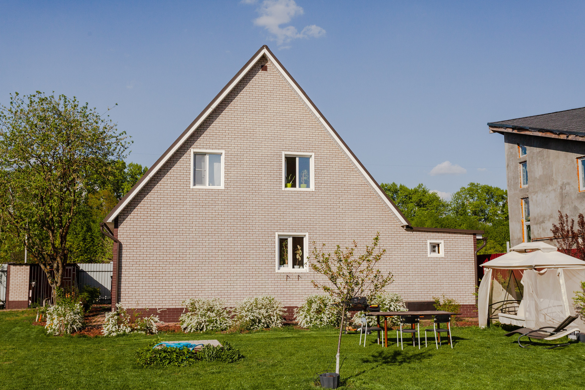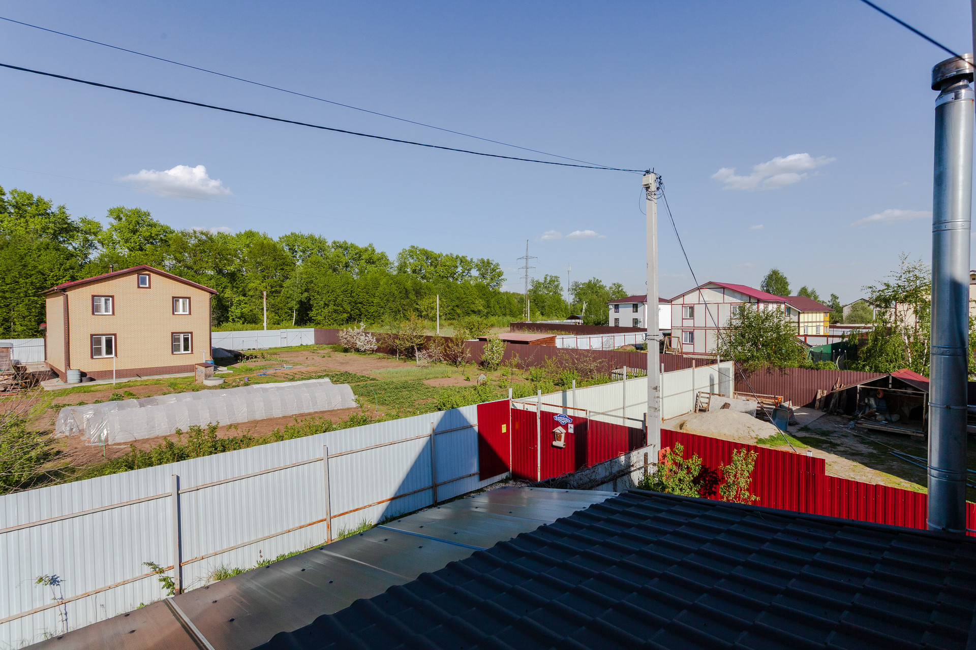 Дом располагается на участке ИЖС 10 соток. Участок правильной прямоугольной формы, ровный, дополнительно поднимался насыпным чернозёмном. На территории организованы сад с плодово-ягодными деревьями и кустарниками, насыпные грядки, декоративные Цветы, кустарники и деревья, зона барбекю, газон.
