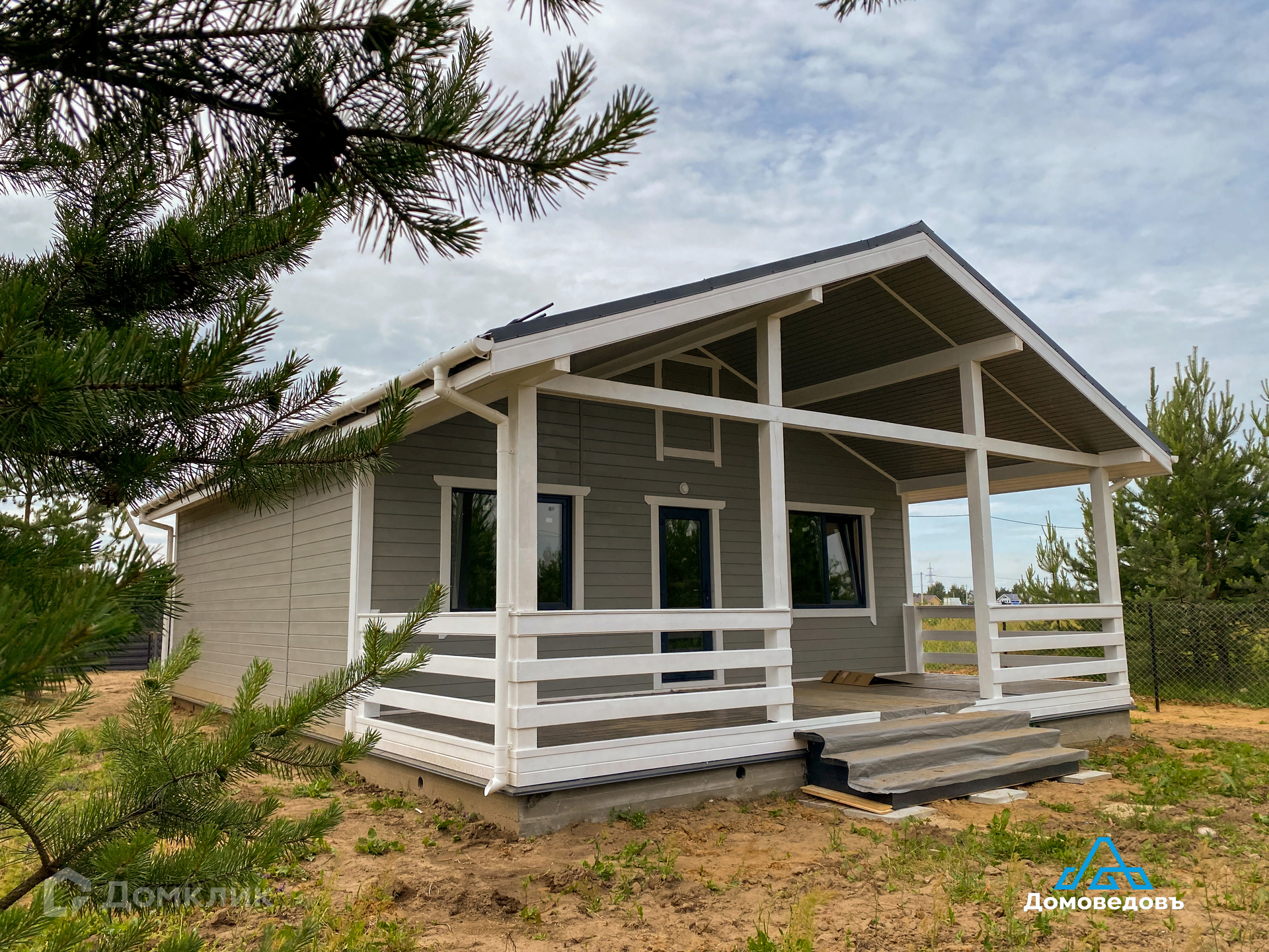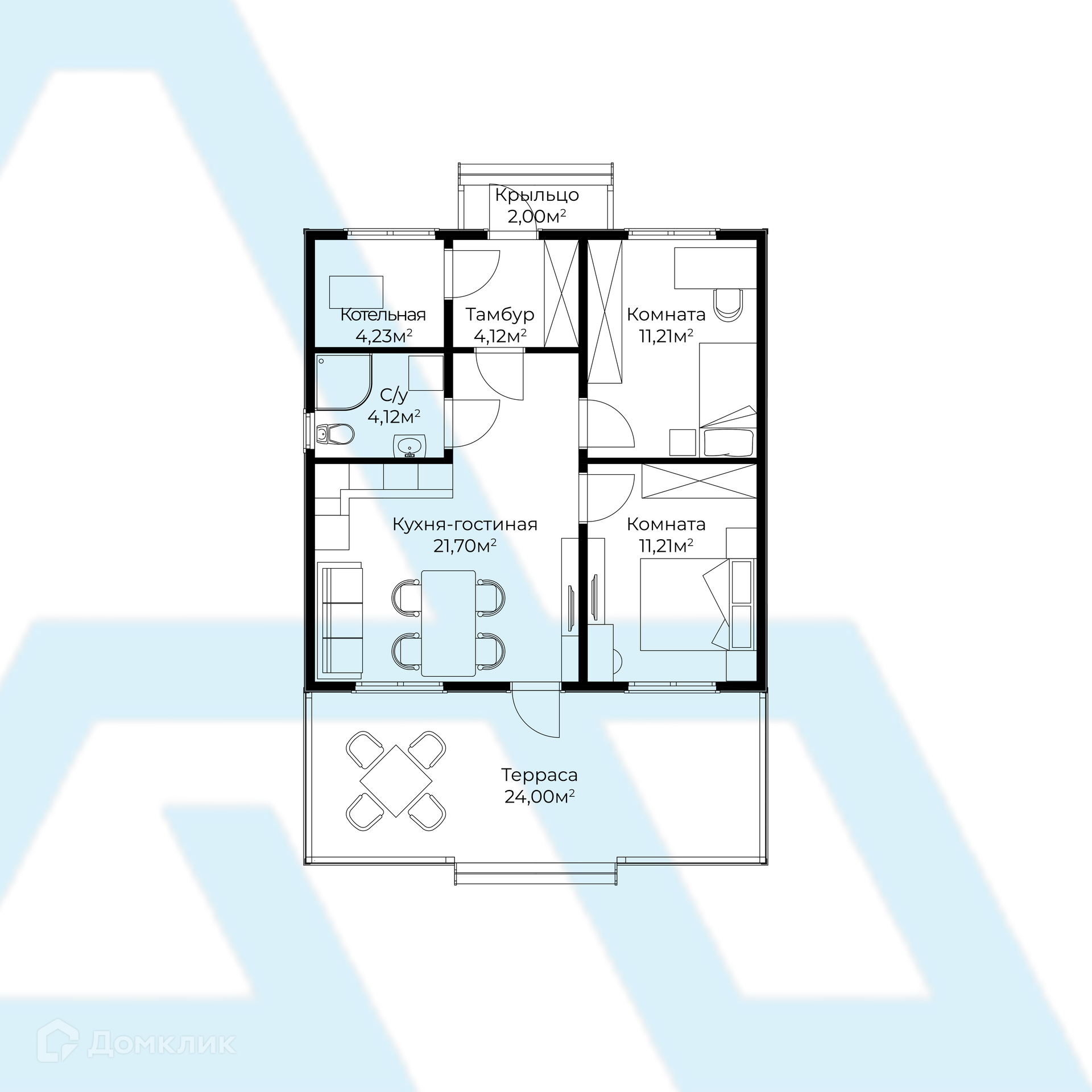 В доме кухня-гостиная площадью 22 кв. м с выходом на террасу 24 кв. м, две комнаты по 11 кв. м, санузел, холл и техническое помещение.