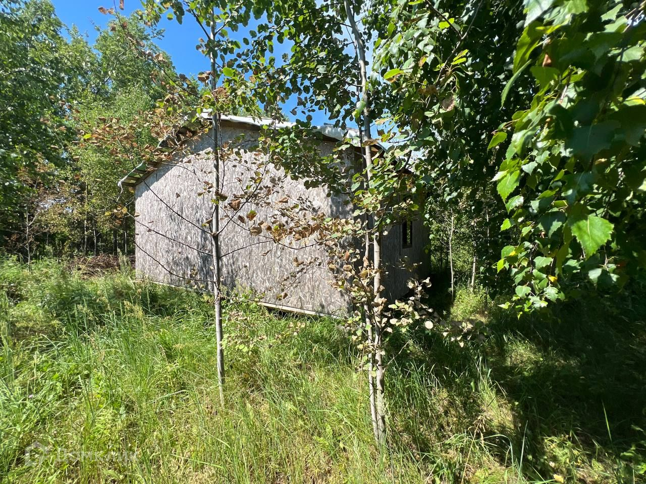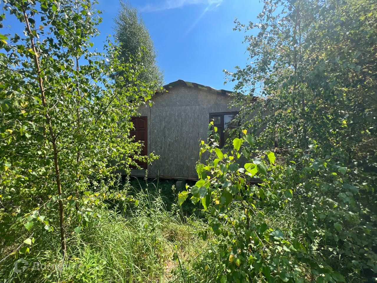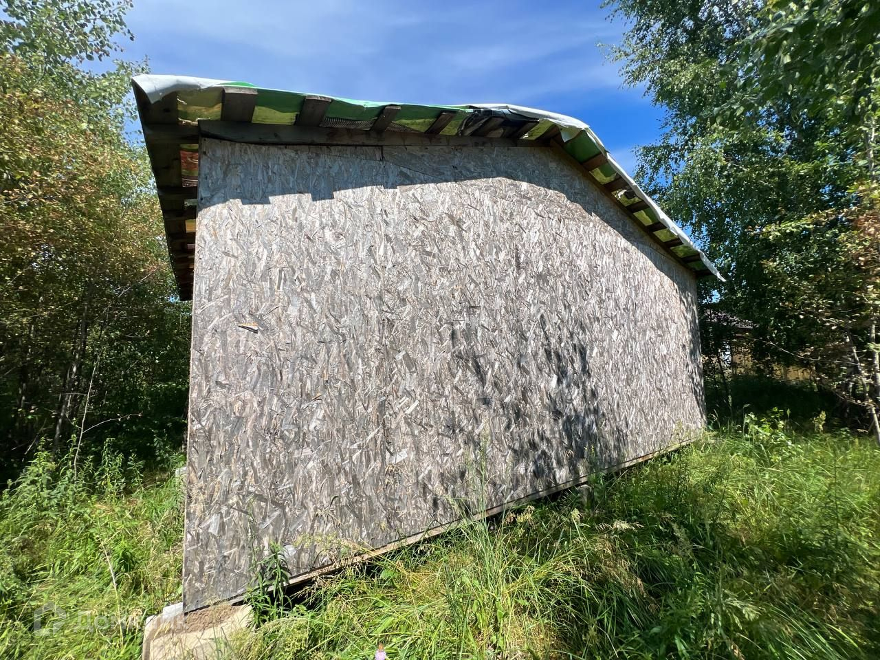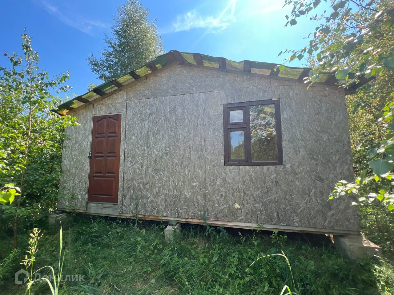 На участке стоит домик 6х6 из фанеры.