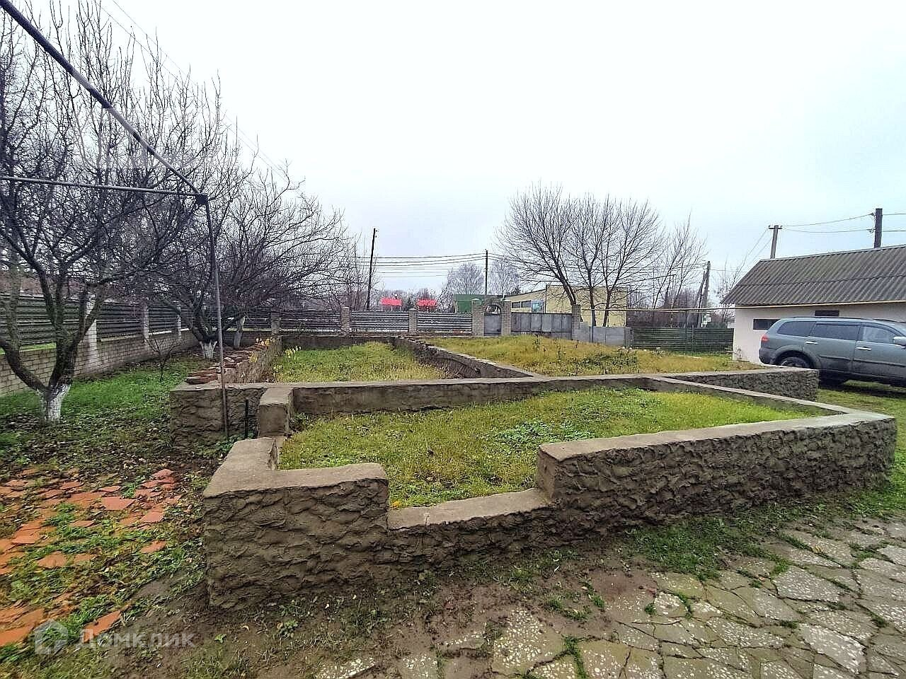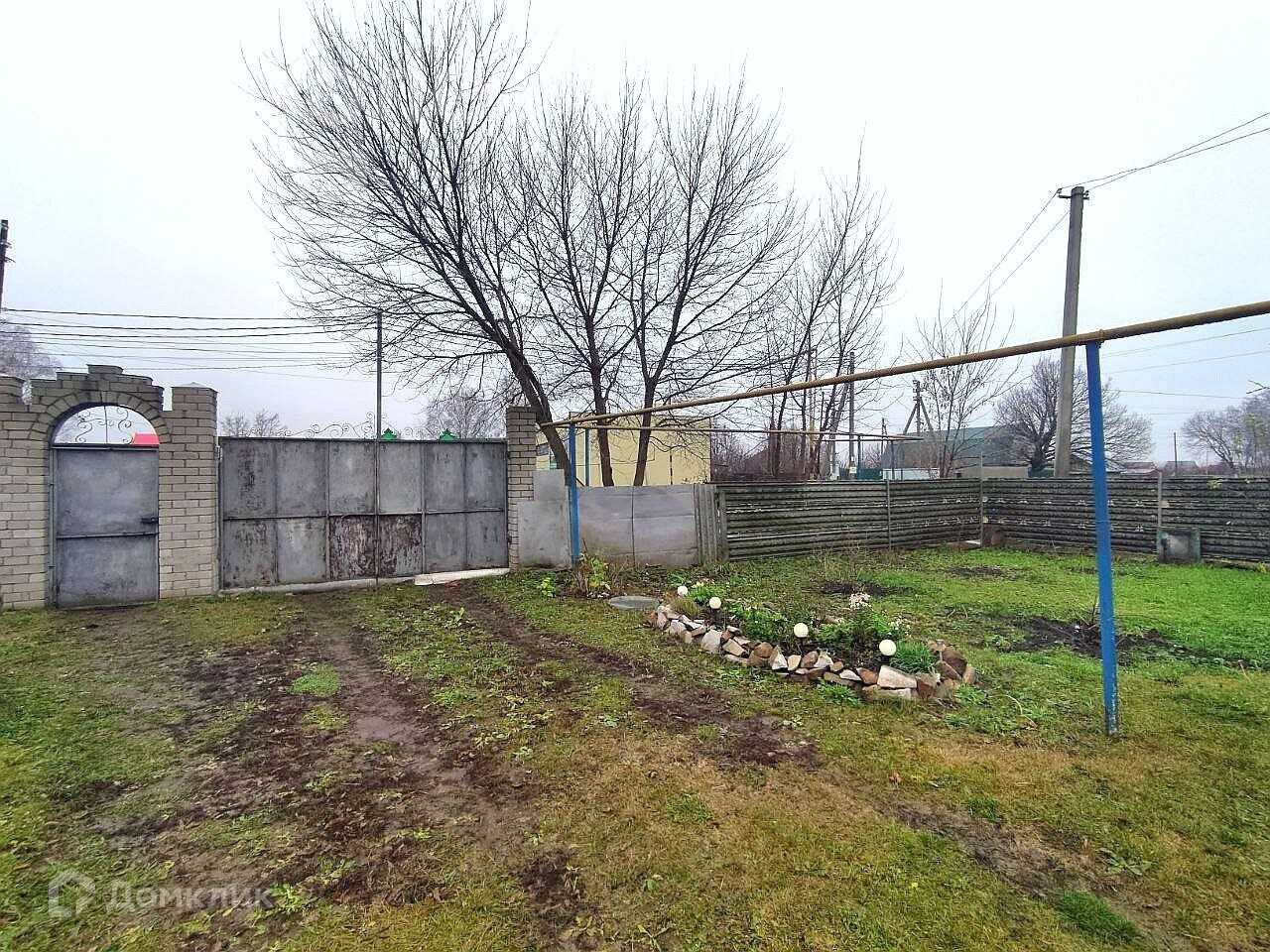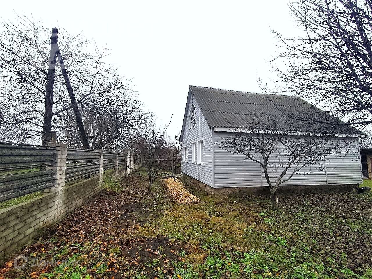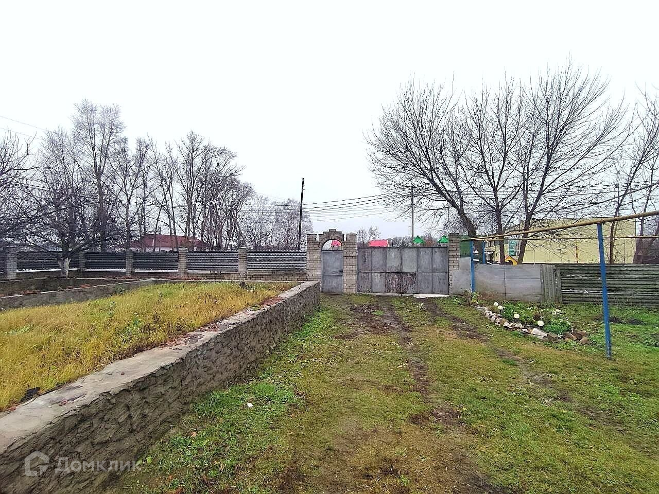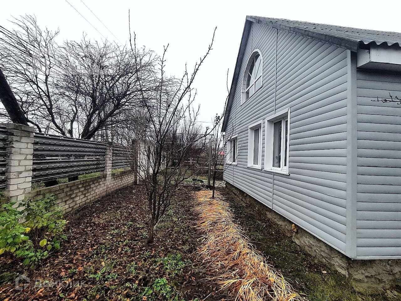 Участок огорожен кирпично-металлическим забором. На участке плодовые насаждения, небольшой огород.
