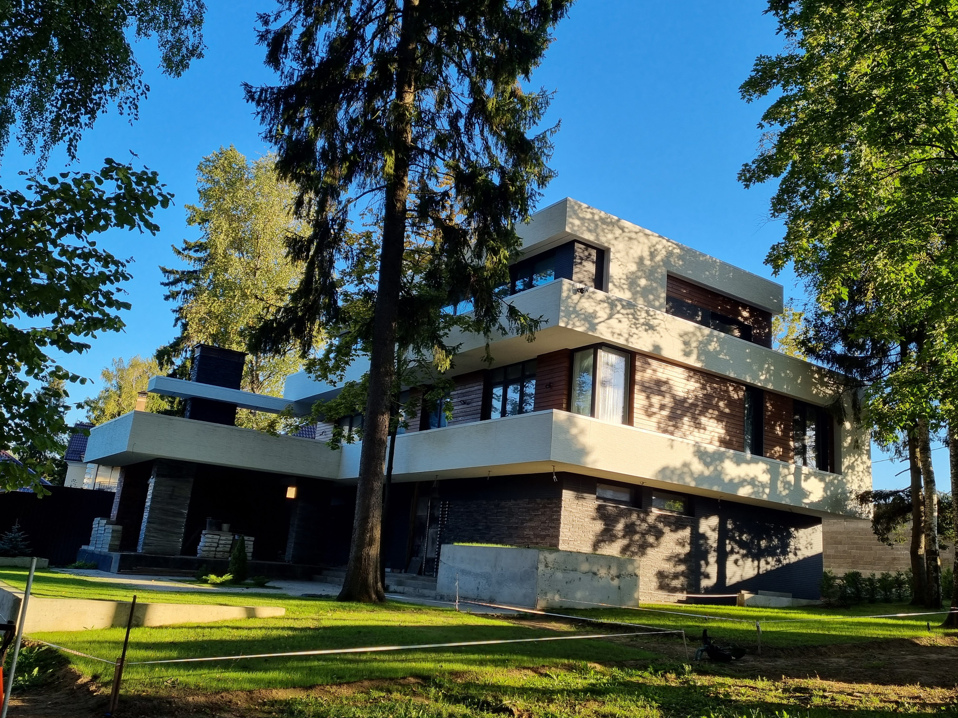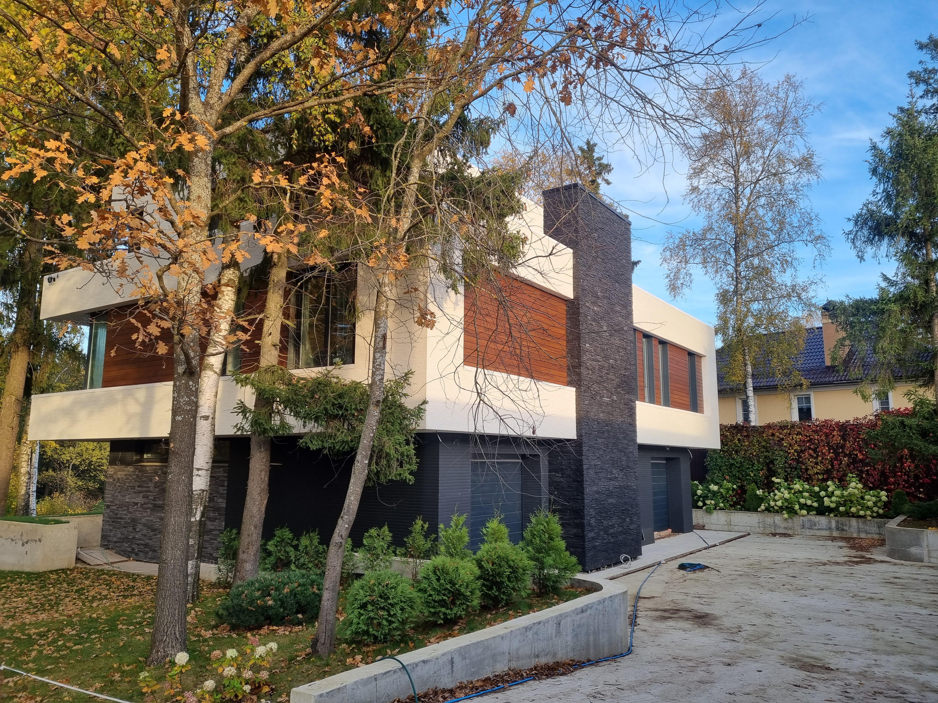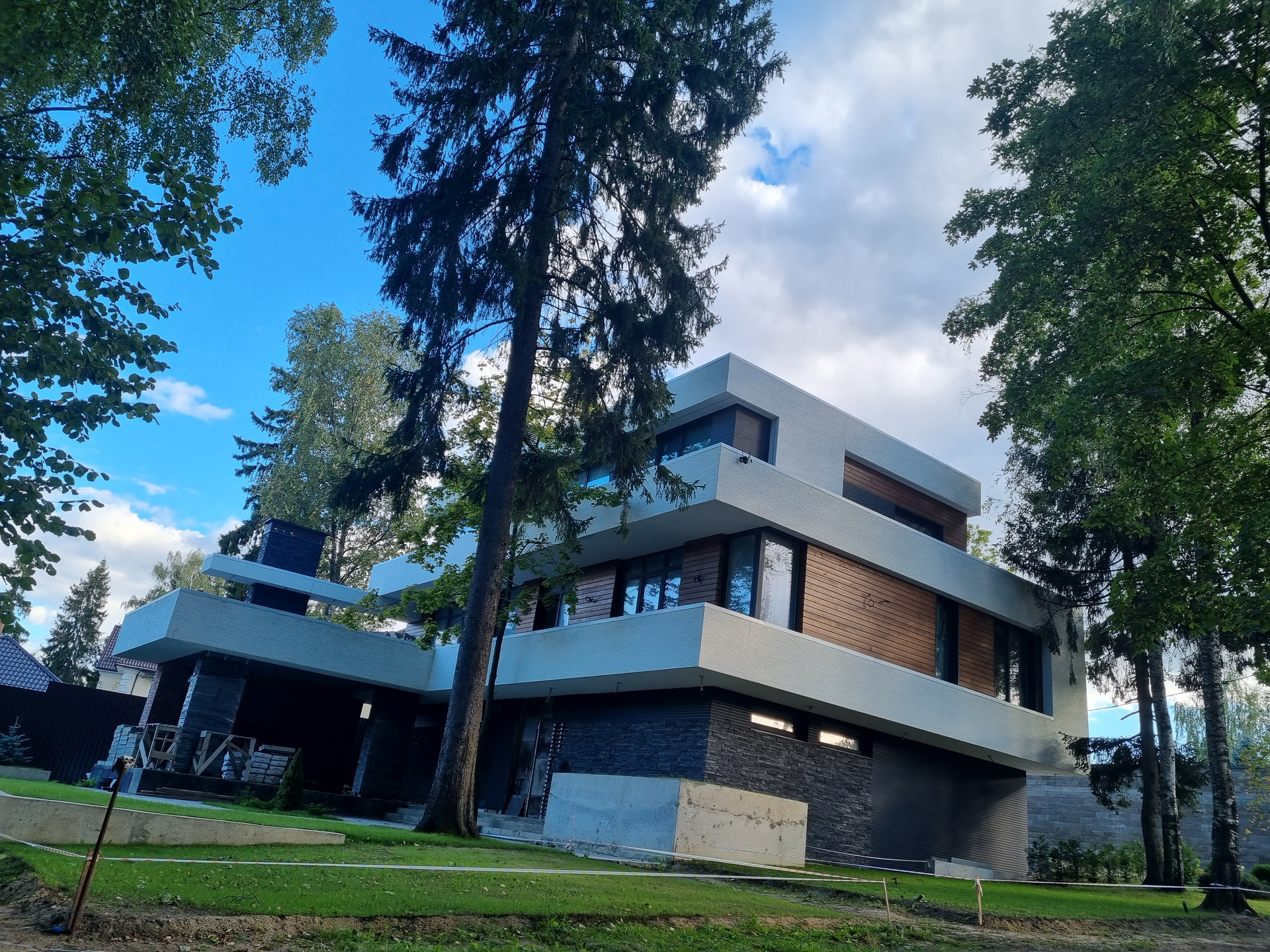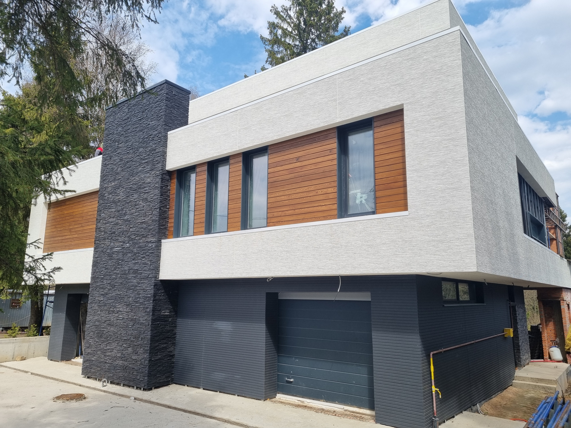 Фасад: Комбинированный вентилируемый имеет сочетание разных фактур: камень, японские панели KMEW, планкен из лиственницы обработанный немецким маслом, чёрные стеклопакеты.