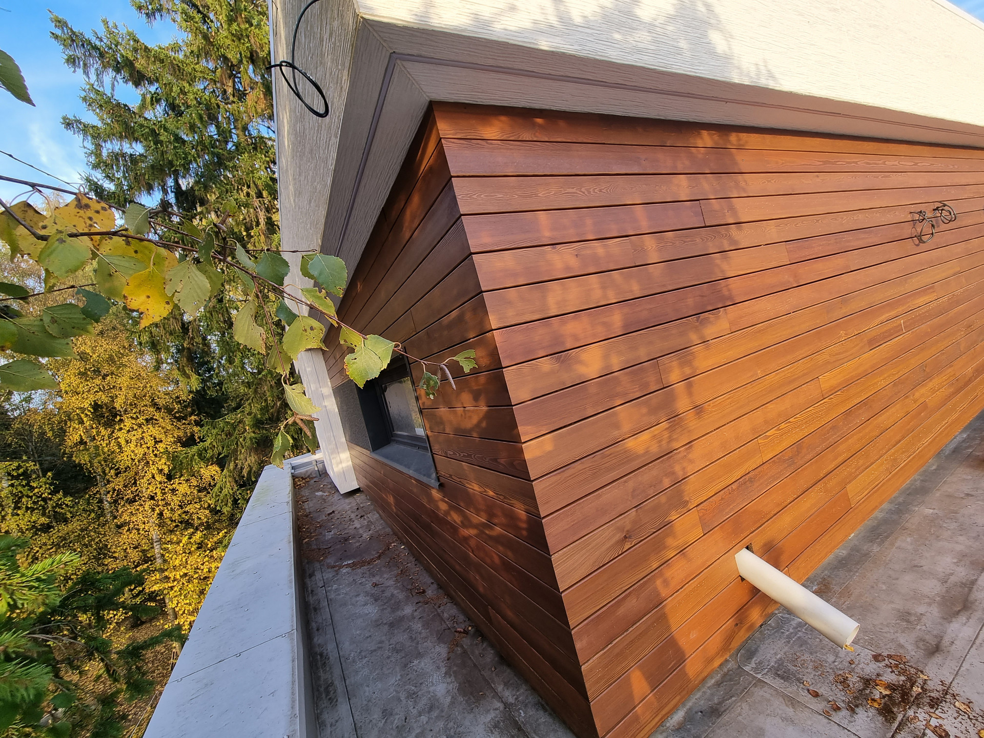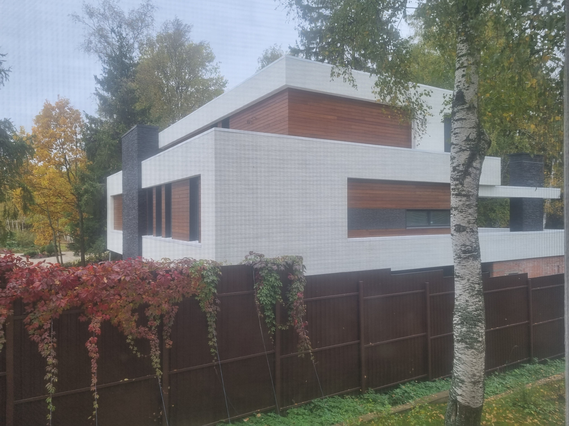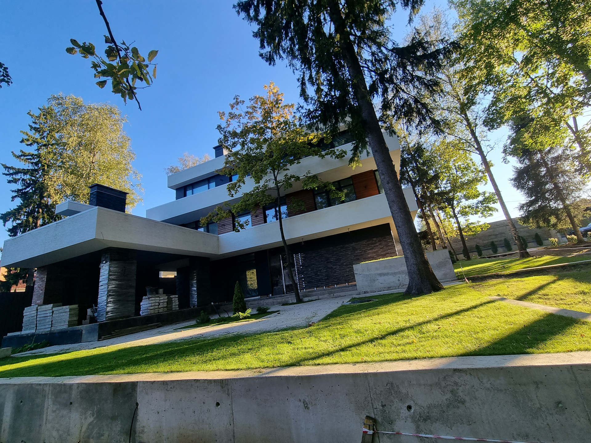 Фасад: Комбинированный вентилируемый имеет сочетание разных фактур: камень, японские панели KMEW, планкен из лиственницы обработанный немецким маслом, чёрные стеклопакеты.