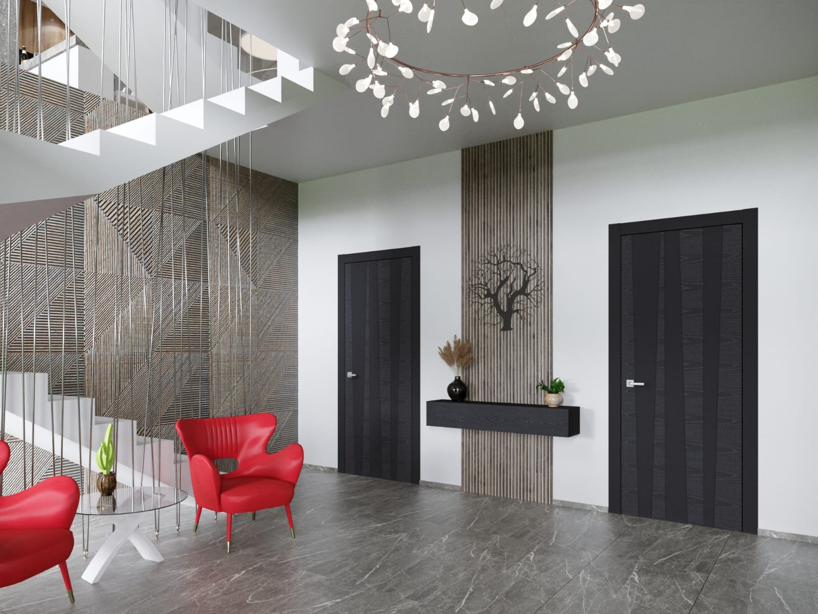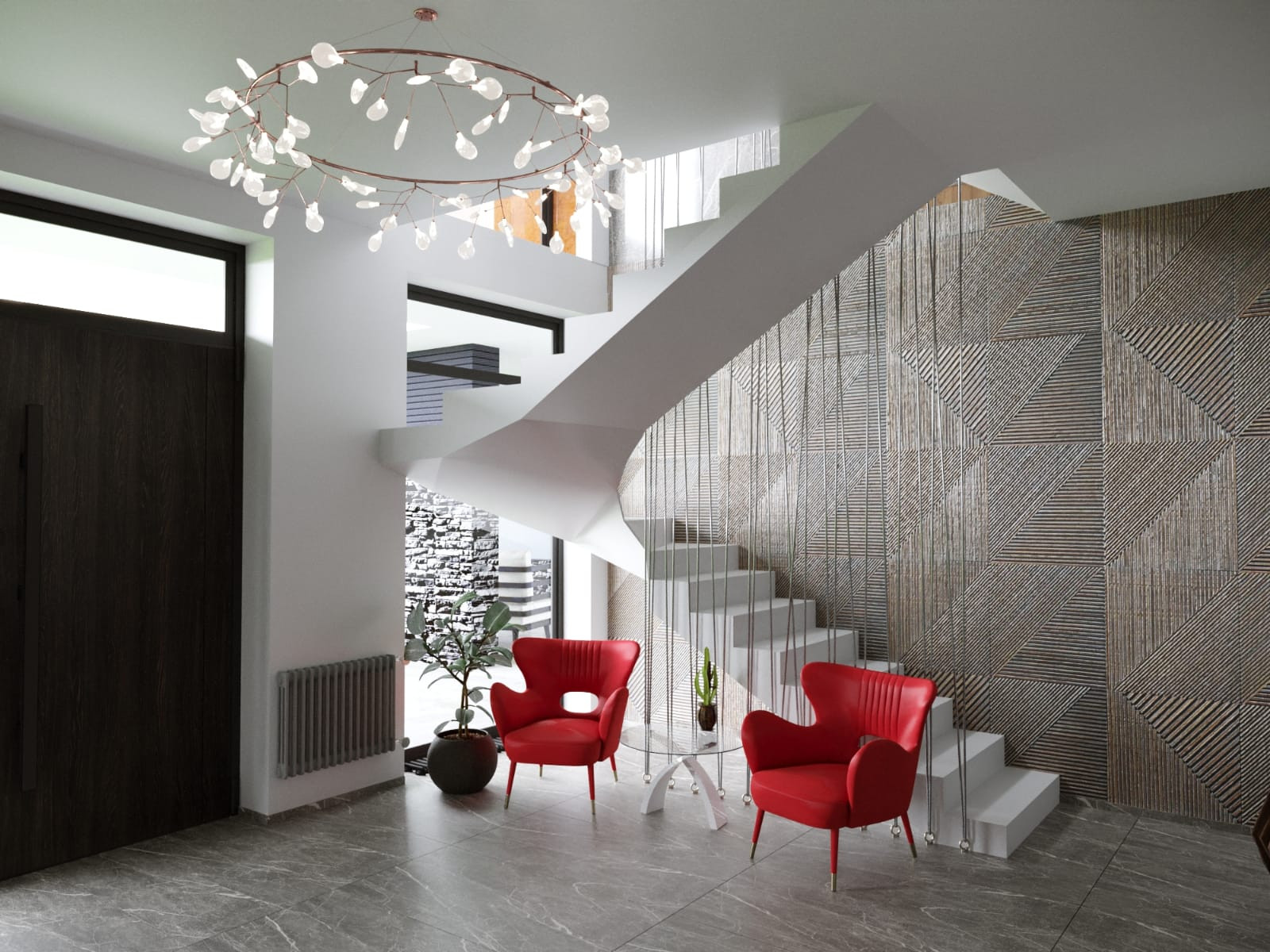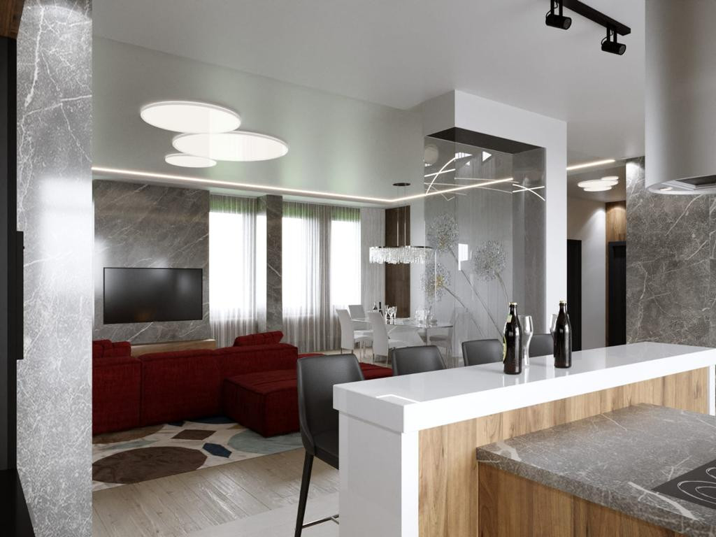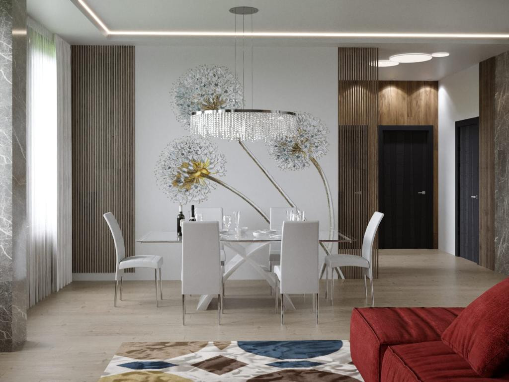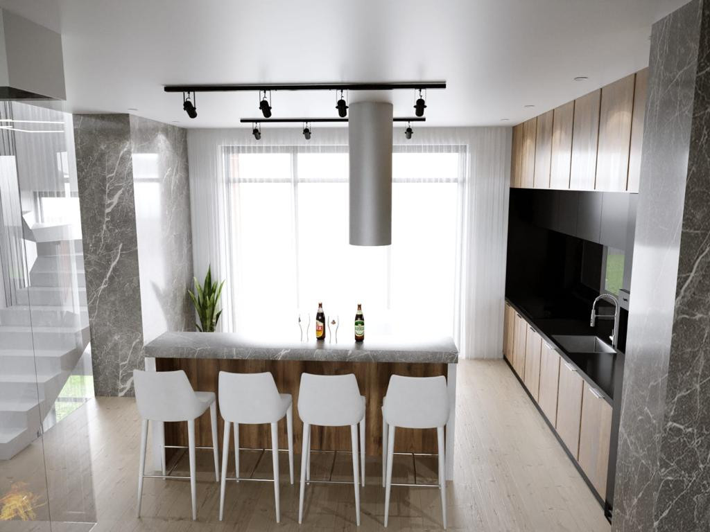 Фасад: Комбинированный вентилируемый имеет сочетание разных фактур: камень, японские панели KMEW, планкен из лиственницы обработанный немецким маслом, чёрные стеклопакеты.