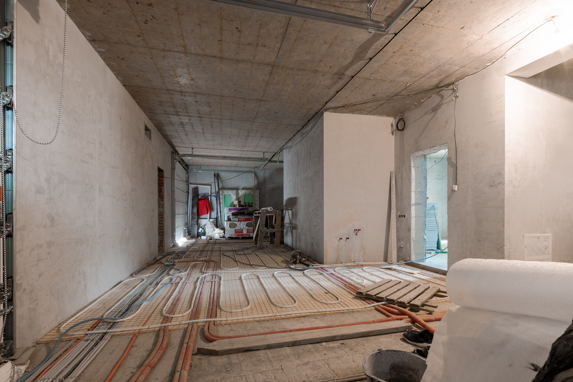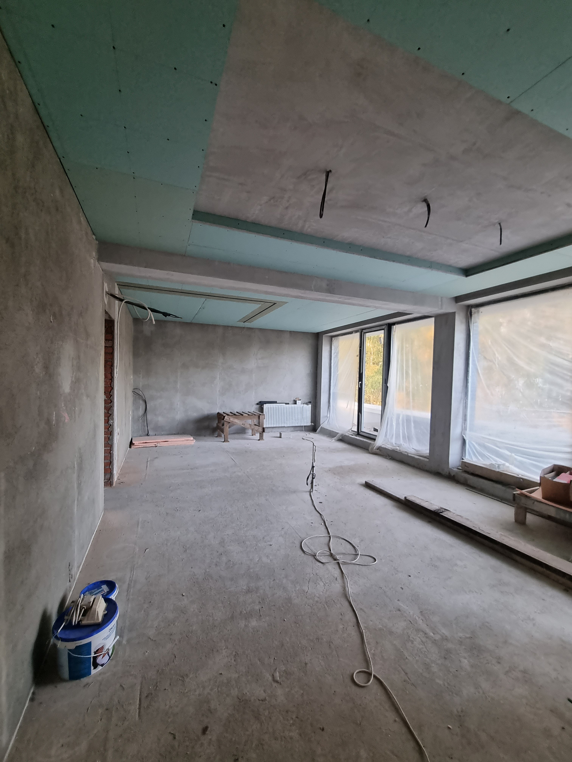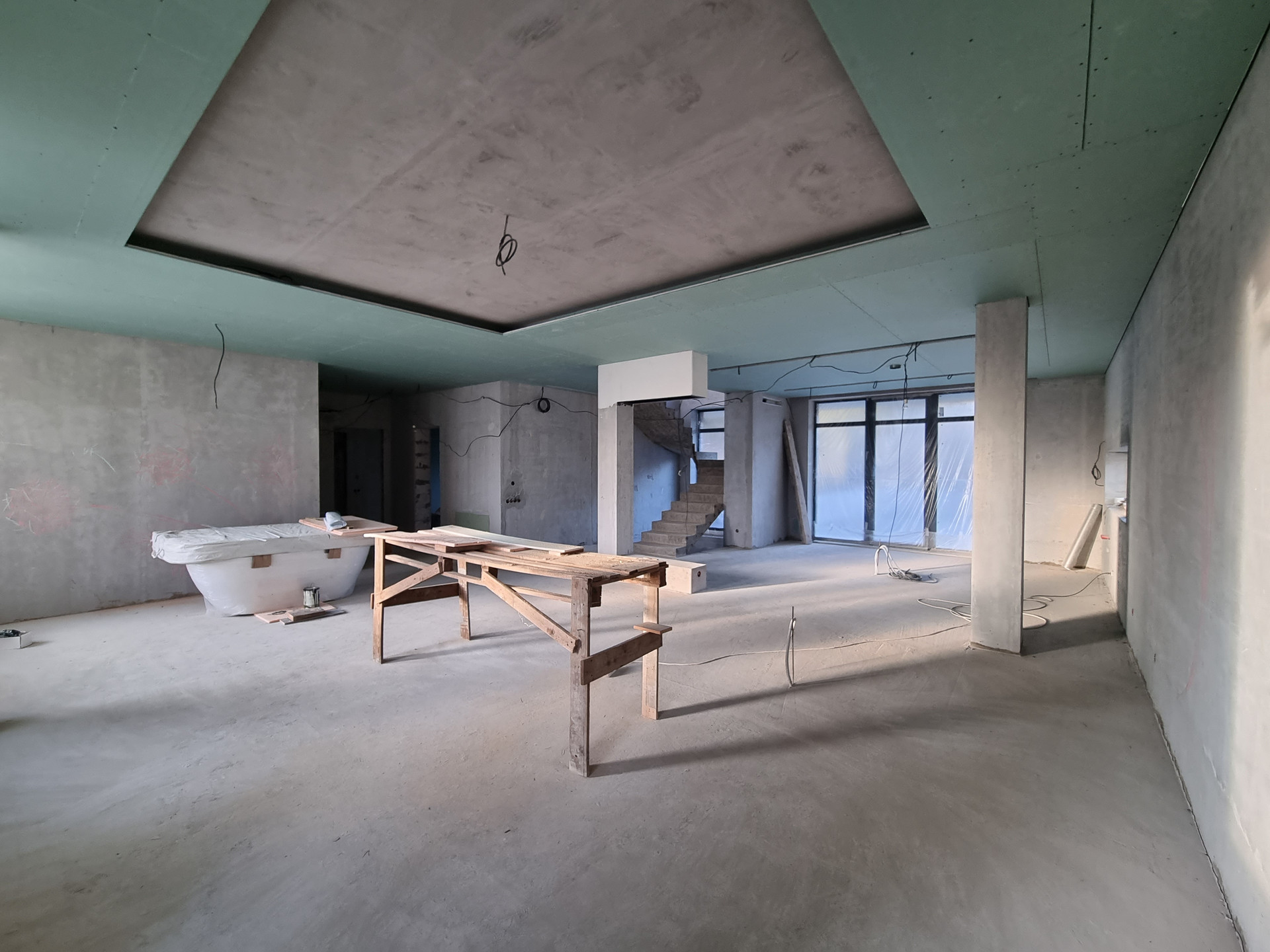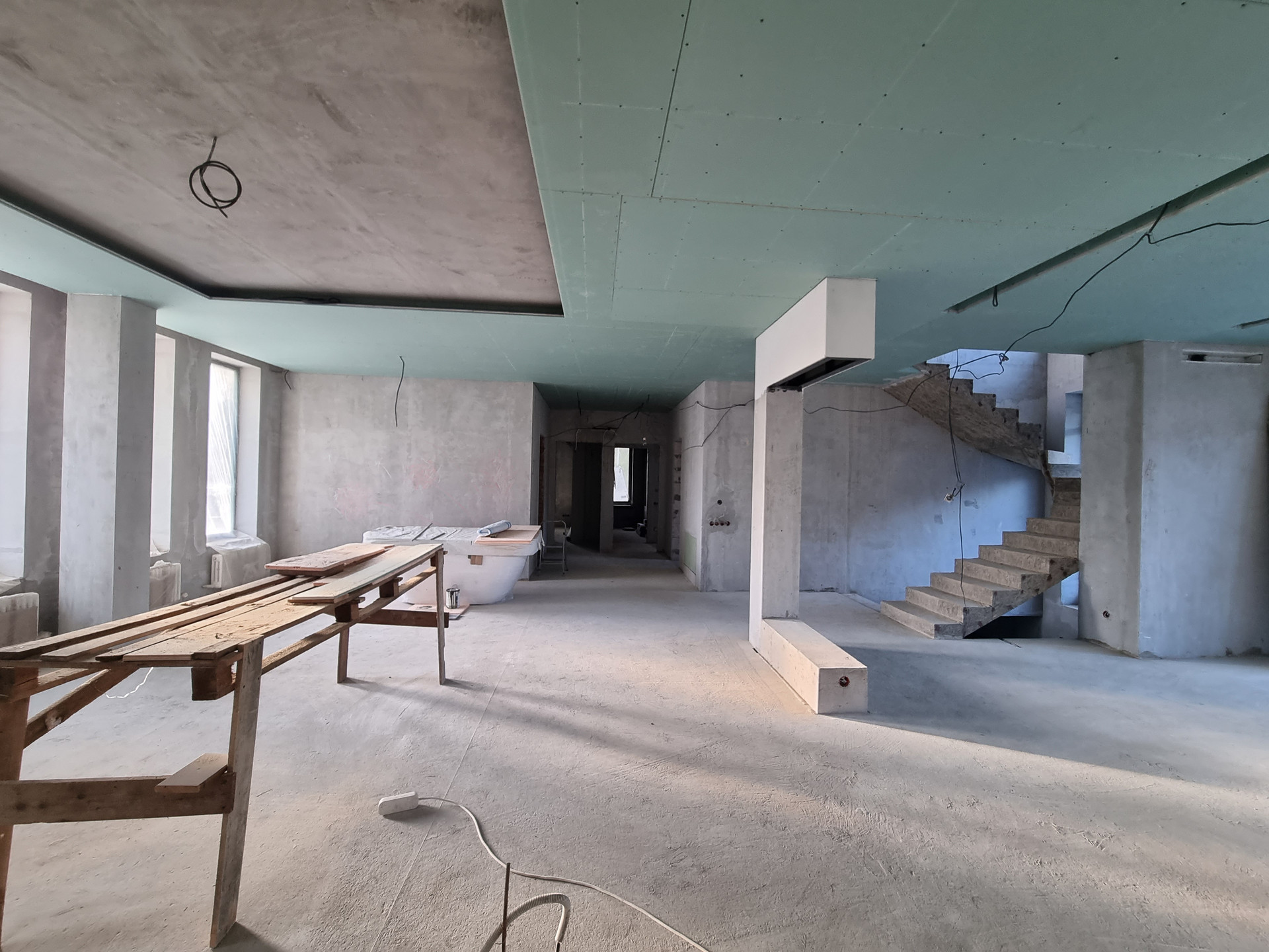 Внутренняя отделка дома: стены оштукатурены на 100%, уложены тёплые полы, стяжка залита 50%, 50% готовы потолки. Установлены датчики температуры в помещении и датчики работы котла (система умный дом).