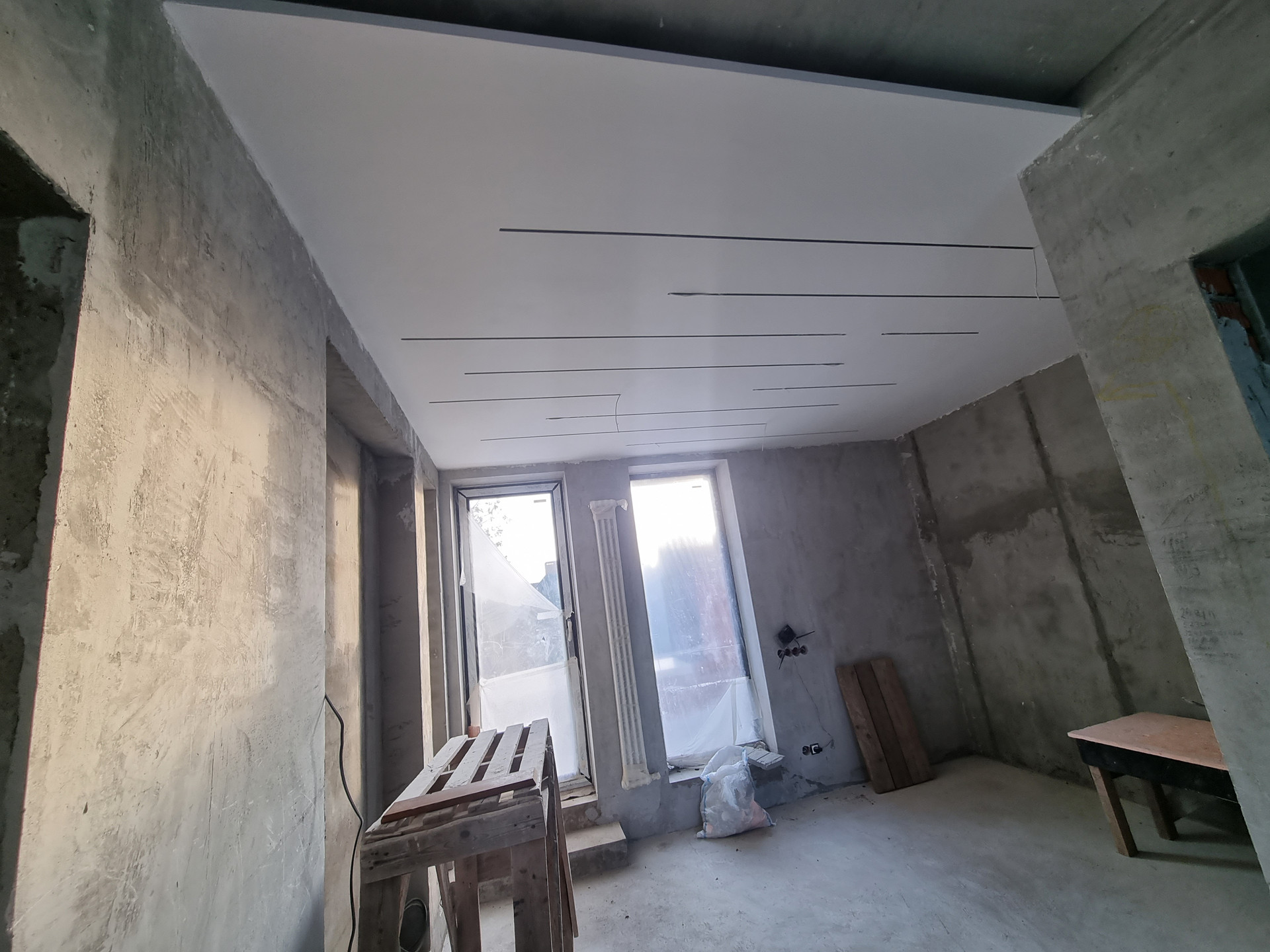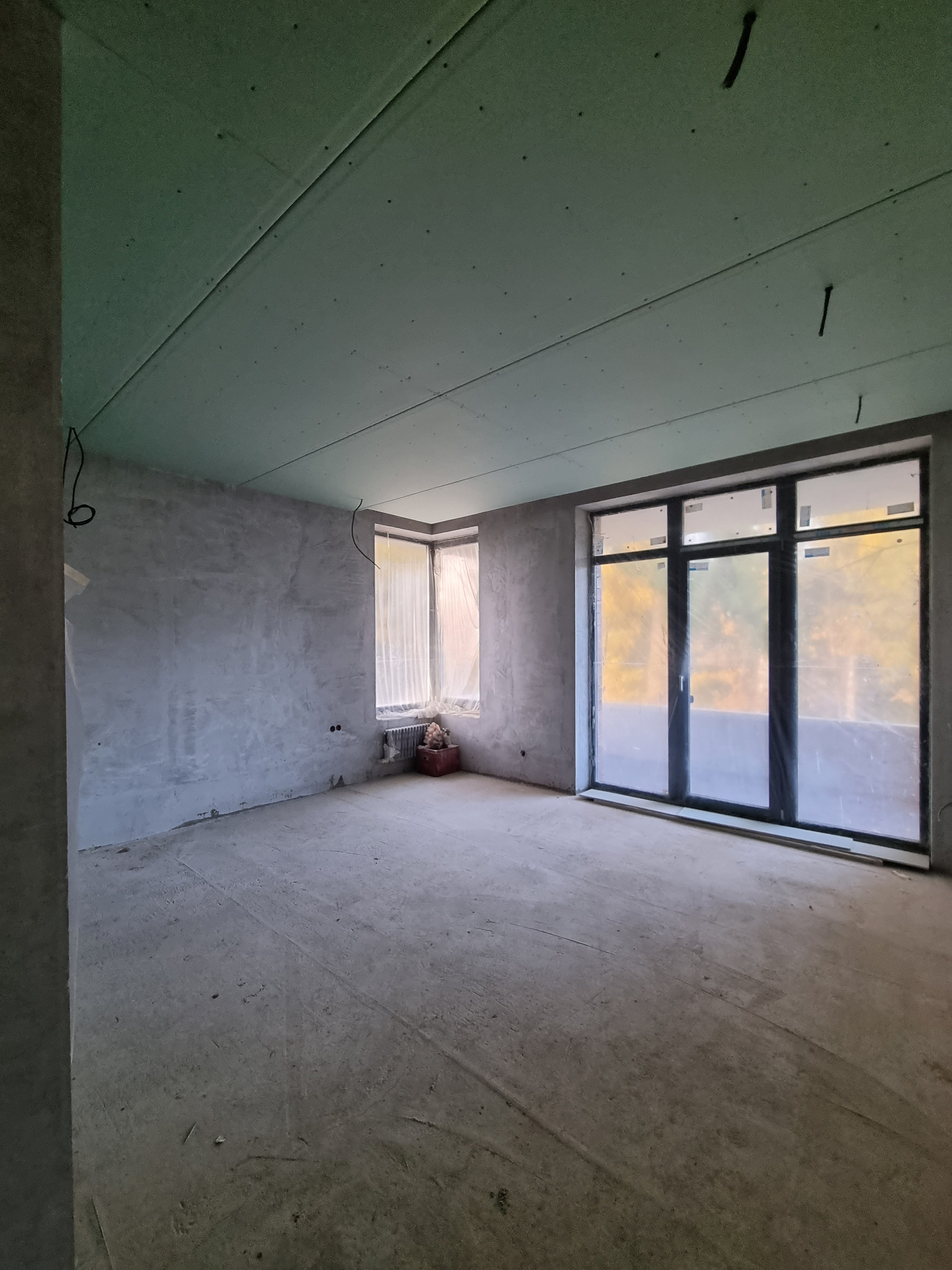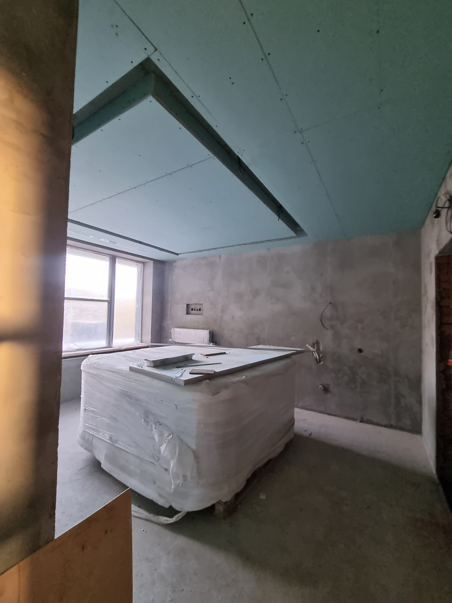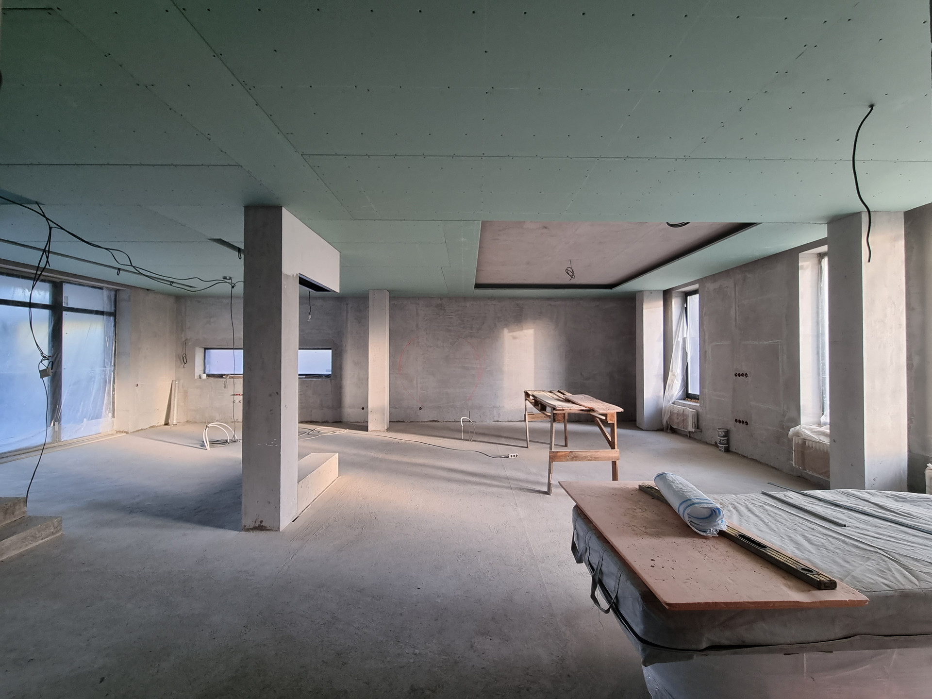 Внутренняя отделка дома: стены оштукатурены на 100%, уложены тёплые полы, стяжка залита 50%, 50% готовы потолки. Установлены датчики температуры в помещении и датчики работы котла (система умный дом).