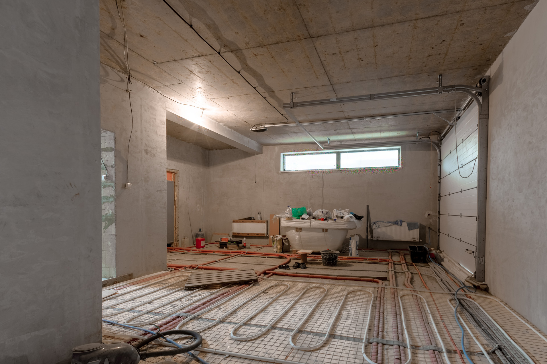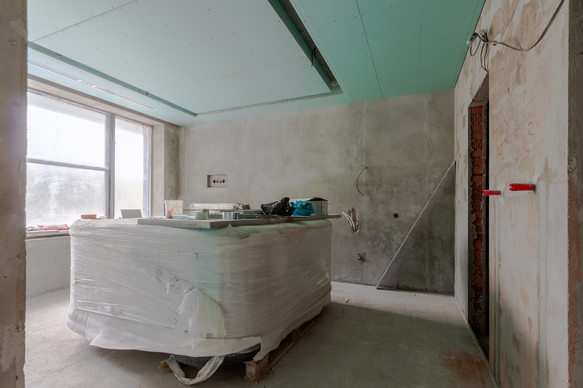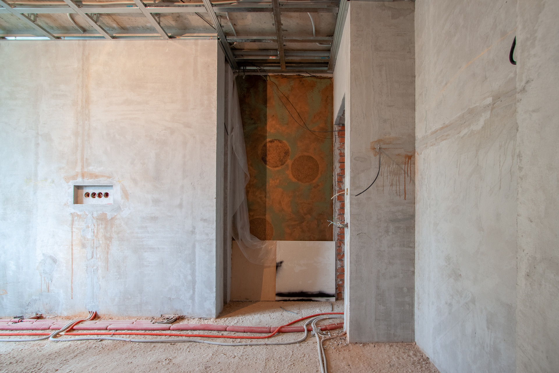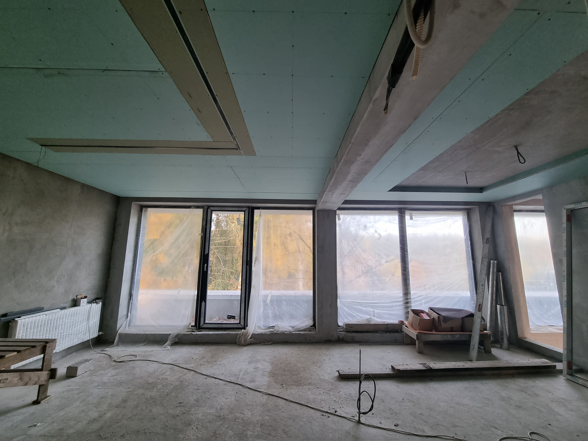 Внутренняя отделка дома: стены оштукатурены на 100%, уложены тёплые полы, стяжка залита 50%, 50% готовы потолки. Установлены датчики температуры в помещении и датчики работы котла (система умный дом).